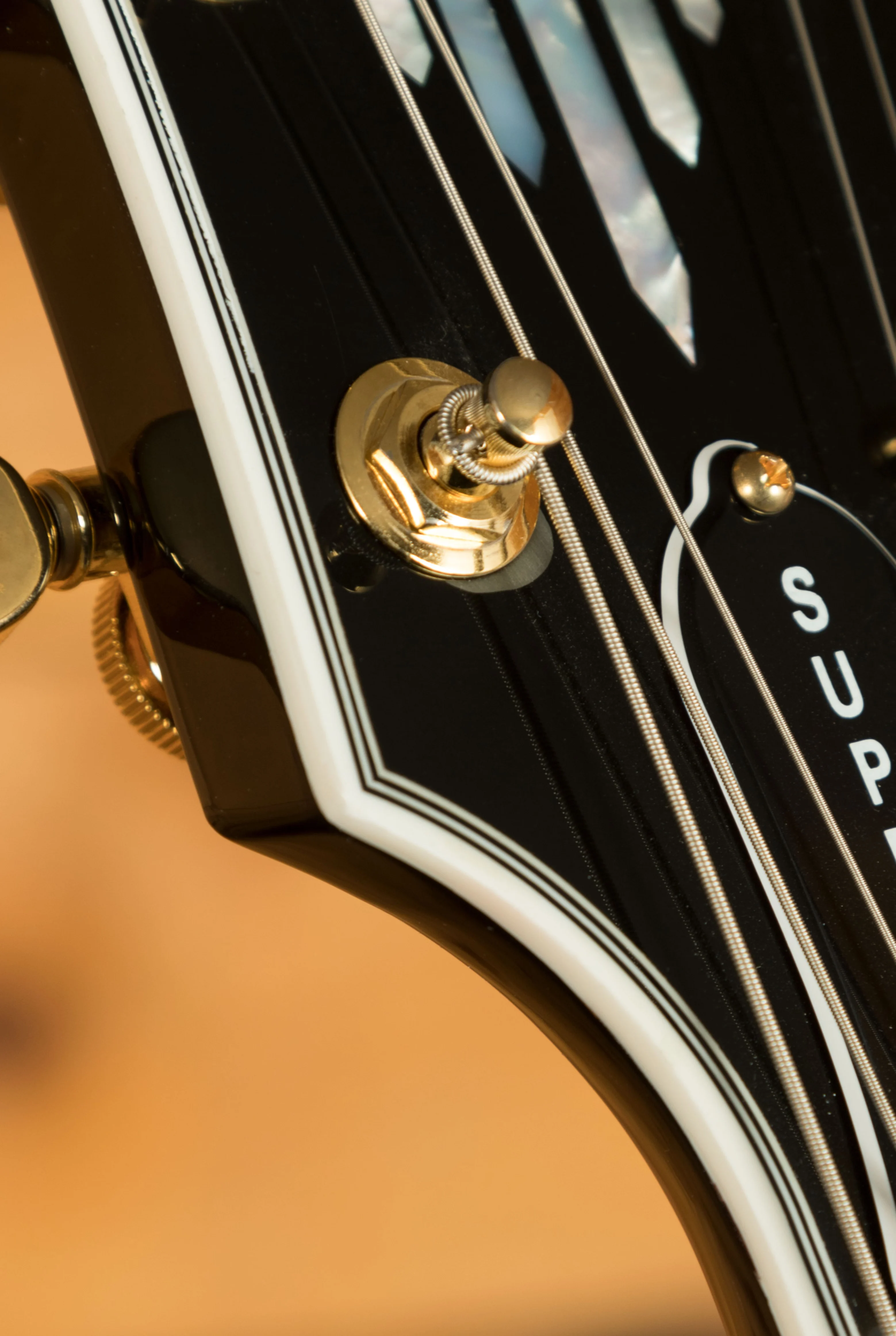 The Mahogany neck is topped with a dark Ebony fingerboard with Gibson Mother of Pearl Split block inlays, this guitar looks every bit the real deal. With a 24.75" scale length, SlimTaper neck profile, 24 frets and compound radius it remains super comfortable and easy to play. The headstock is adorned with a striking new Mother of Pearl inlay inspired by a design from the 1940’s that was recently discovered in the Gibson archives.