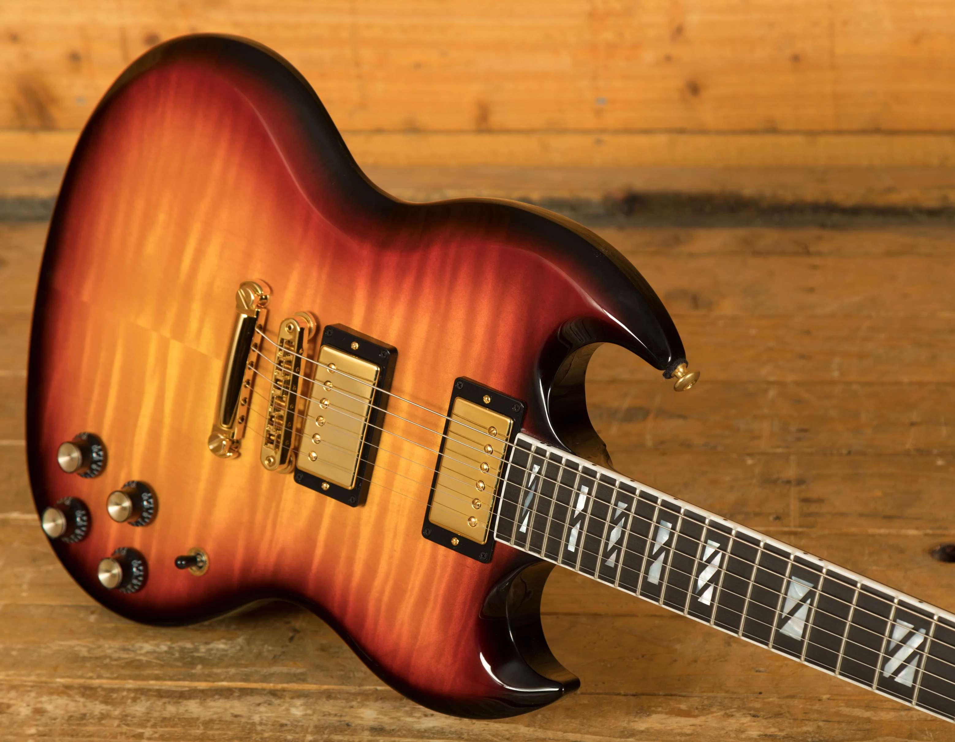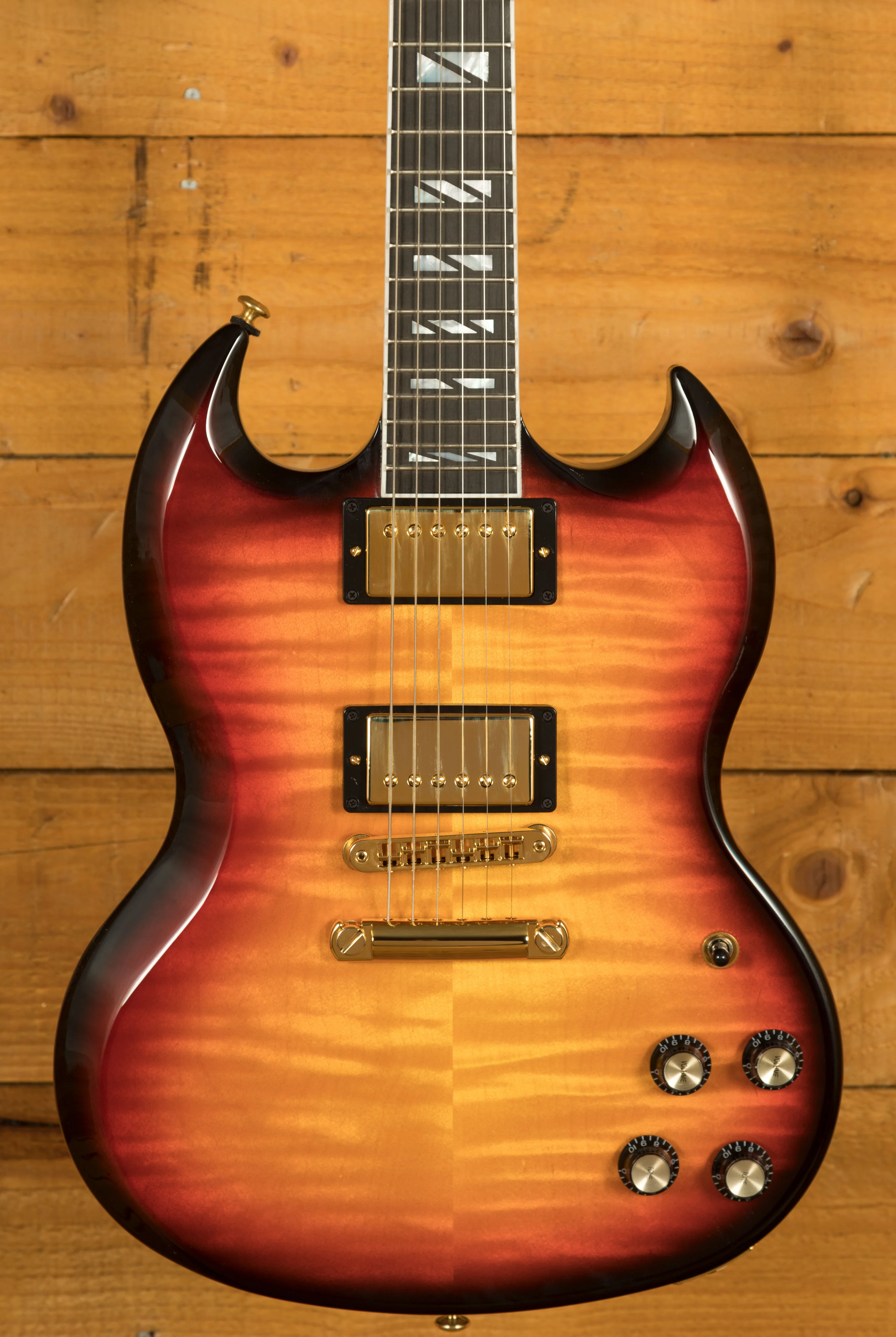 The Gibson SG Supreme begins with a traditional Mahogany body topped with a seriously impressive 3A figured Maple top, the wood selected for these models has gone through a rigorous selection process, ensuring it really is the best that Gibson USA has to offer! The Fireburst finish is super vibrant and helps to highlight the three-dimensional nature of the top.