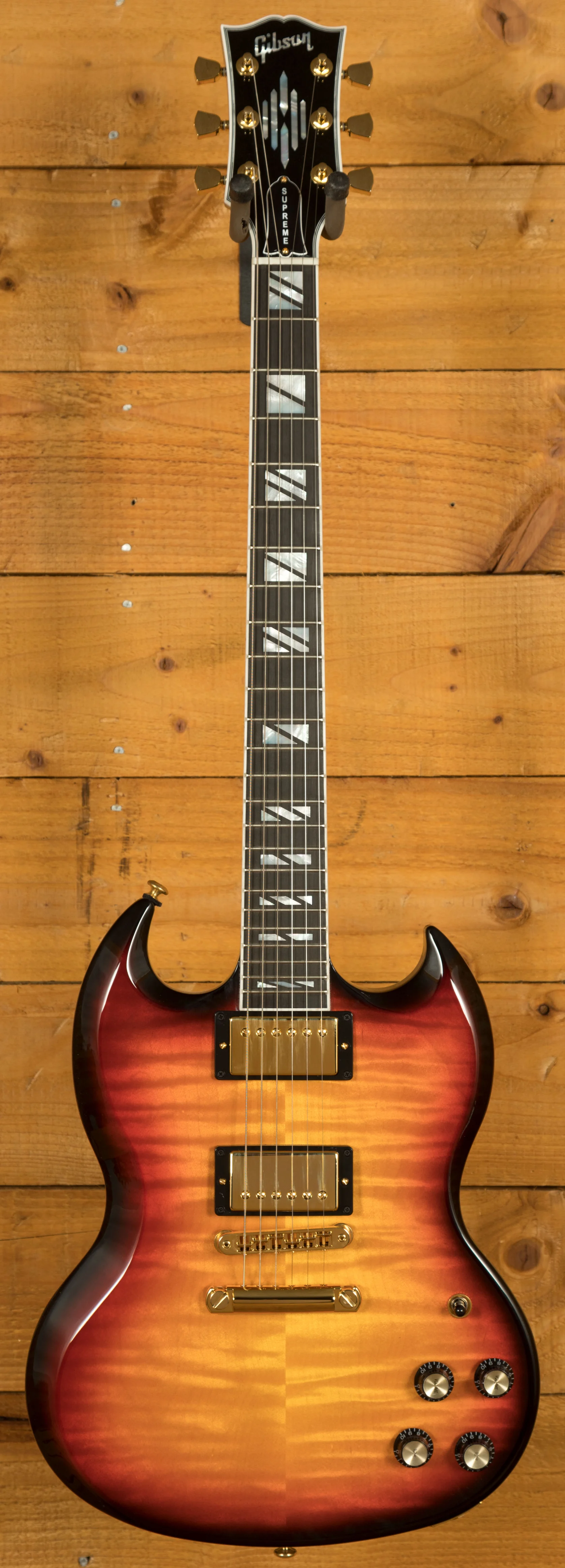 Classic Gibson tones come courtesy of Burstbucker Pro and Burstbucker Pro + humbuckers which provide a clear yet powerful tone. These pickups are paired with push/pull Volume and Tone pots for flexible coil tap. Finished off with a Tune-o-Matic bridge and locking Grover tuners this SG Supreme offers flawless tuning stability. It's an elegant powerhouse well deserving of the SG name.
