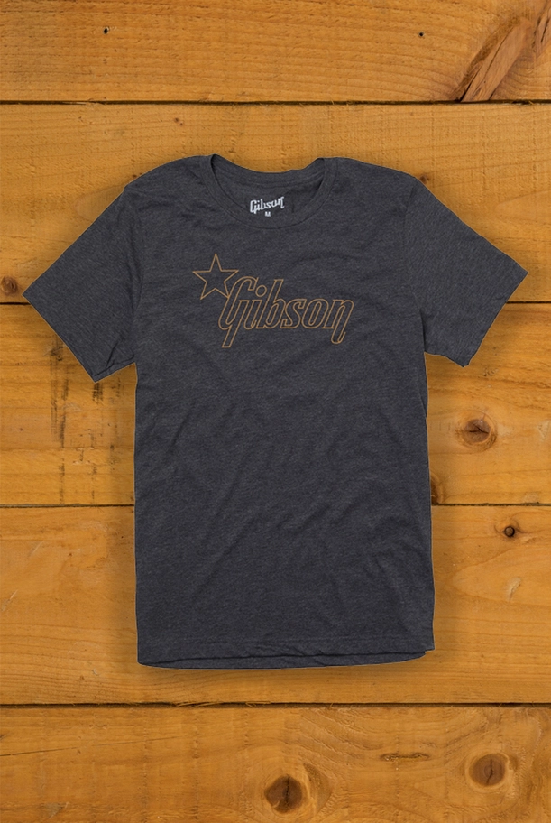Charcoal grey tee featuring the iconic Gibson "Star" logo used on nearly all Gibson products from the early 1950s-1960s including string boxes, guitar cases, and dealer signs.
