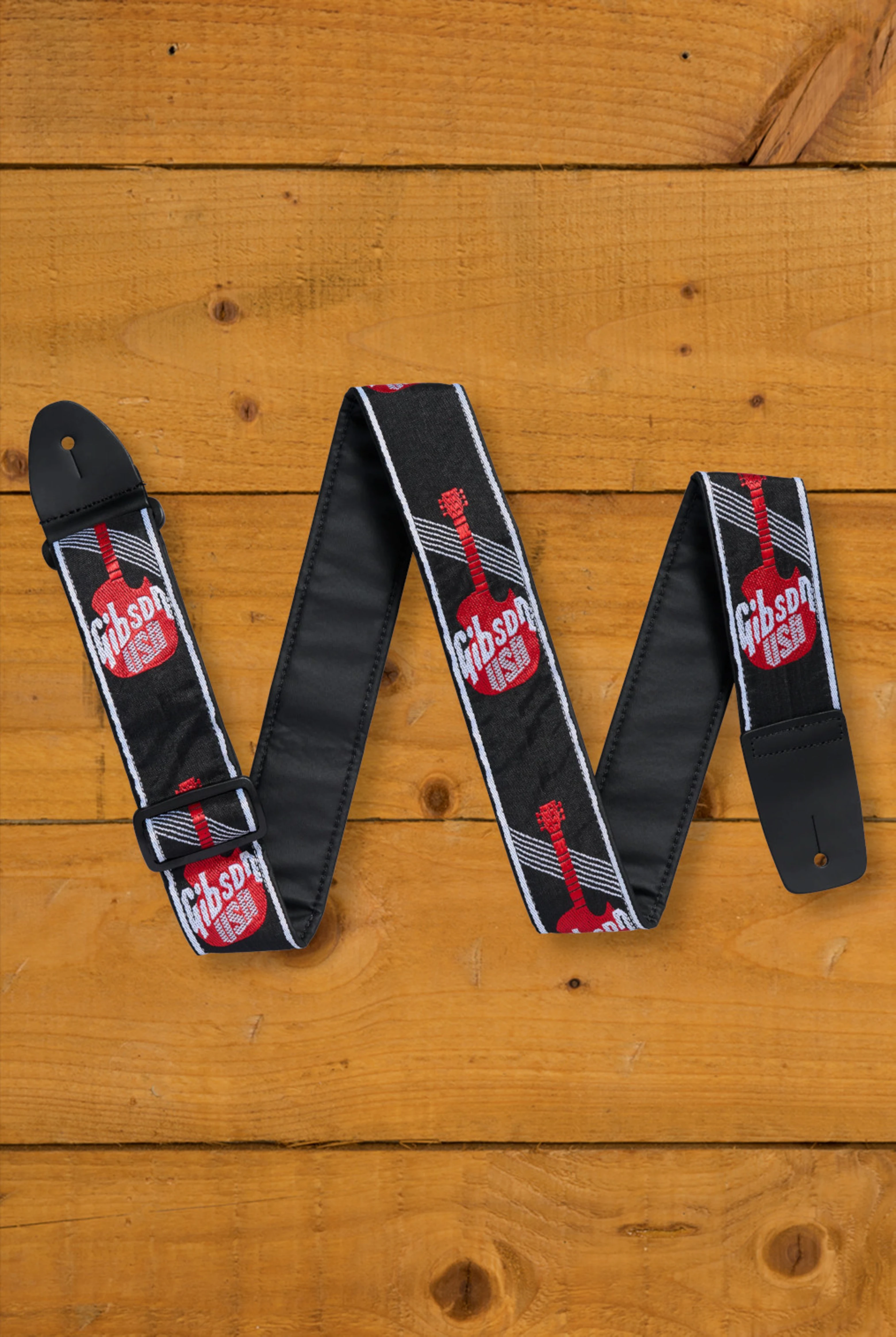 The high-quality, 2"-wide woven guitar strap is covered in vintage Gibson USA logos, placed over the timeless silhouette of a Les Paul Standard guitar.