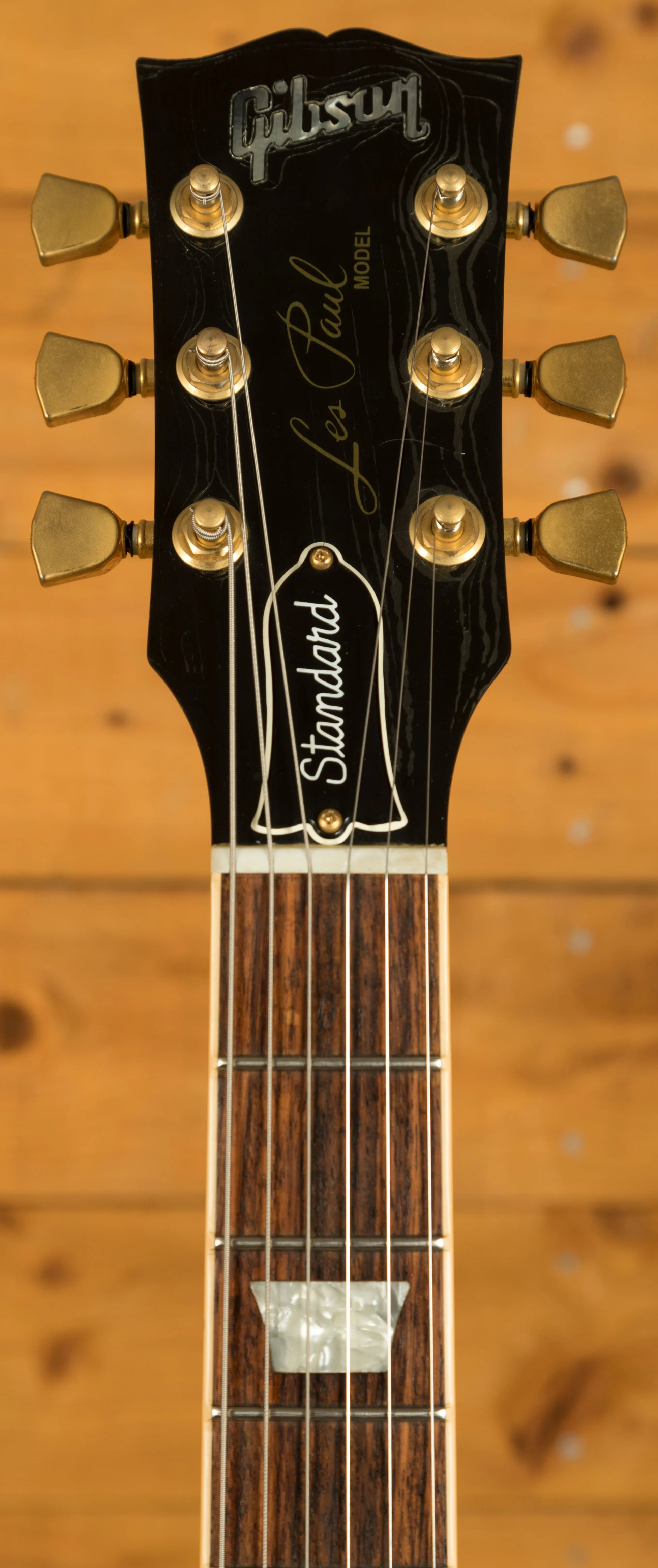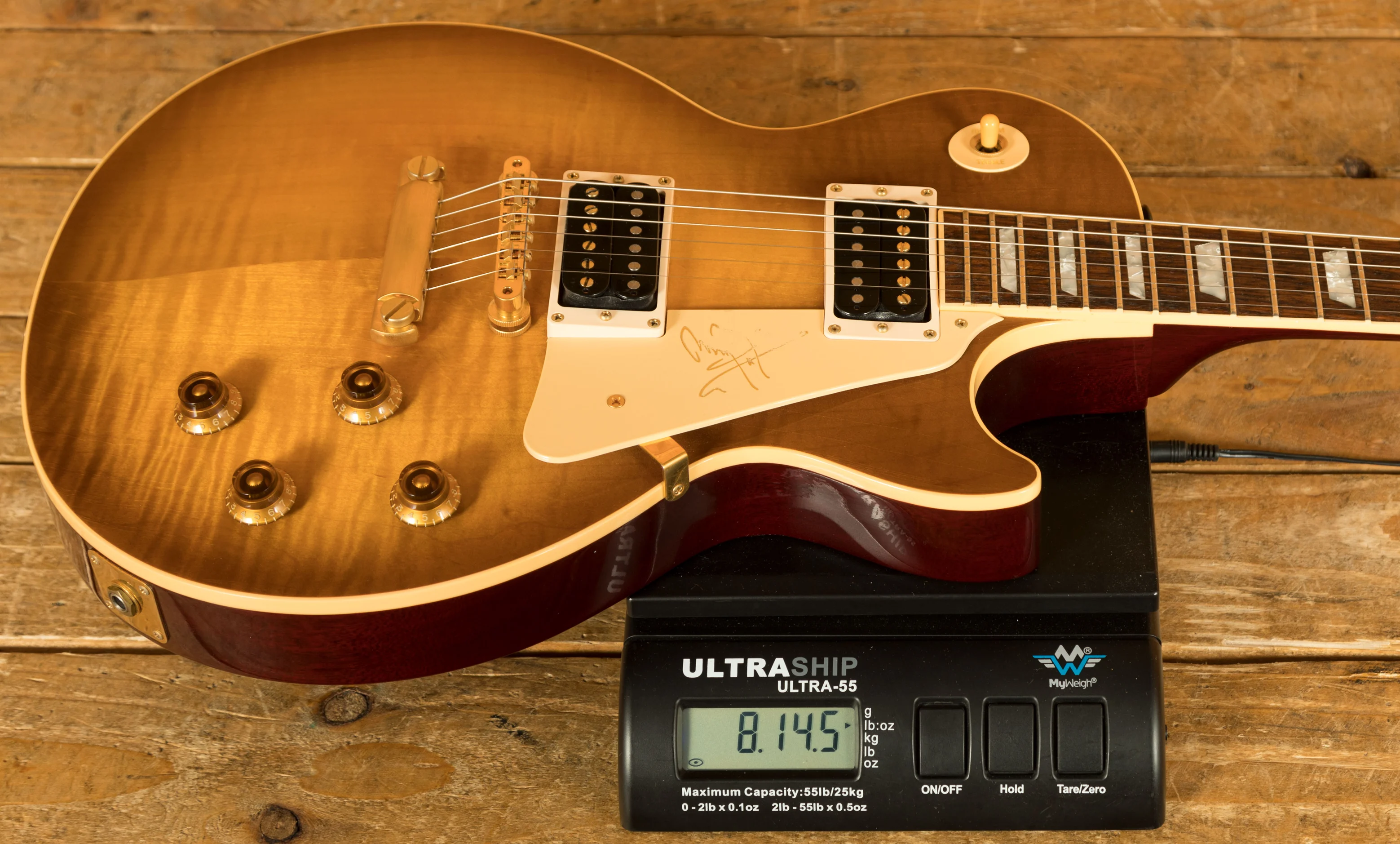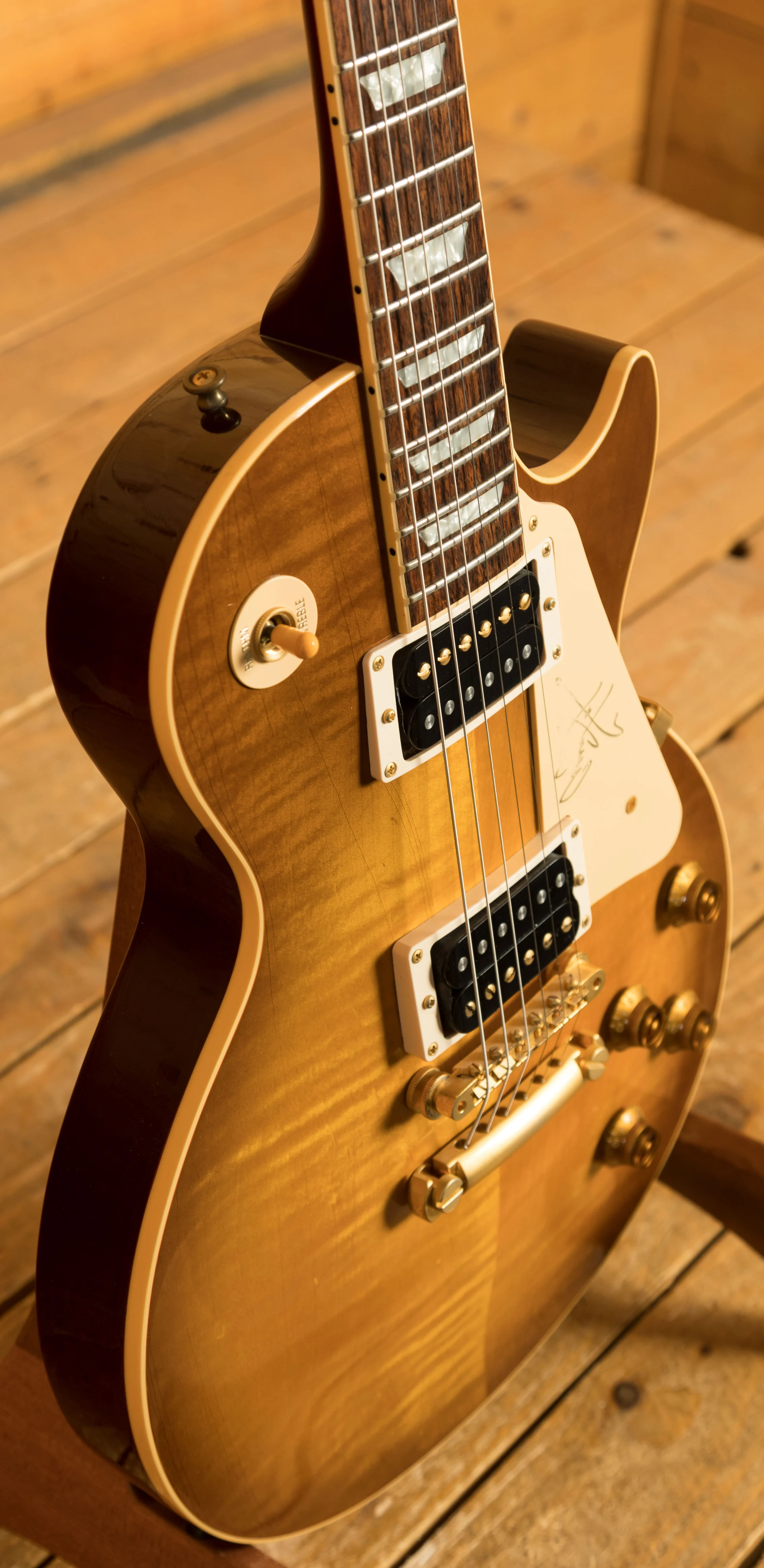 This used Gibson USA Jimmy Page Signature Les Paul Standard is a 1996-built icon, featuring a flame maple top, mahogany body, and custom neck profile with Jimmy Pages signature specs, in fair condition with lots of lacquer checking and lacquer cracking on the headstock but structurally sound, complete with its original hardshell case. Professionally set up by our skilled luthiers, this Les Paul delivers the iconic tone of a rock legend.