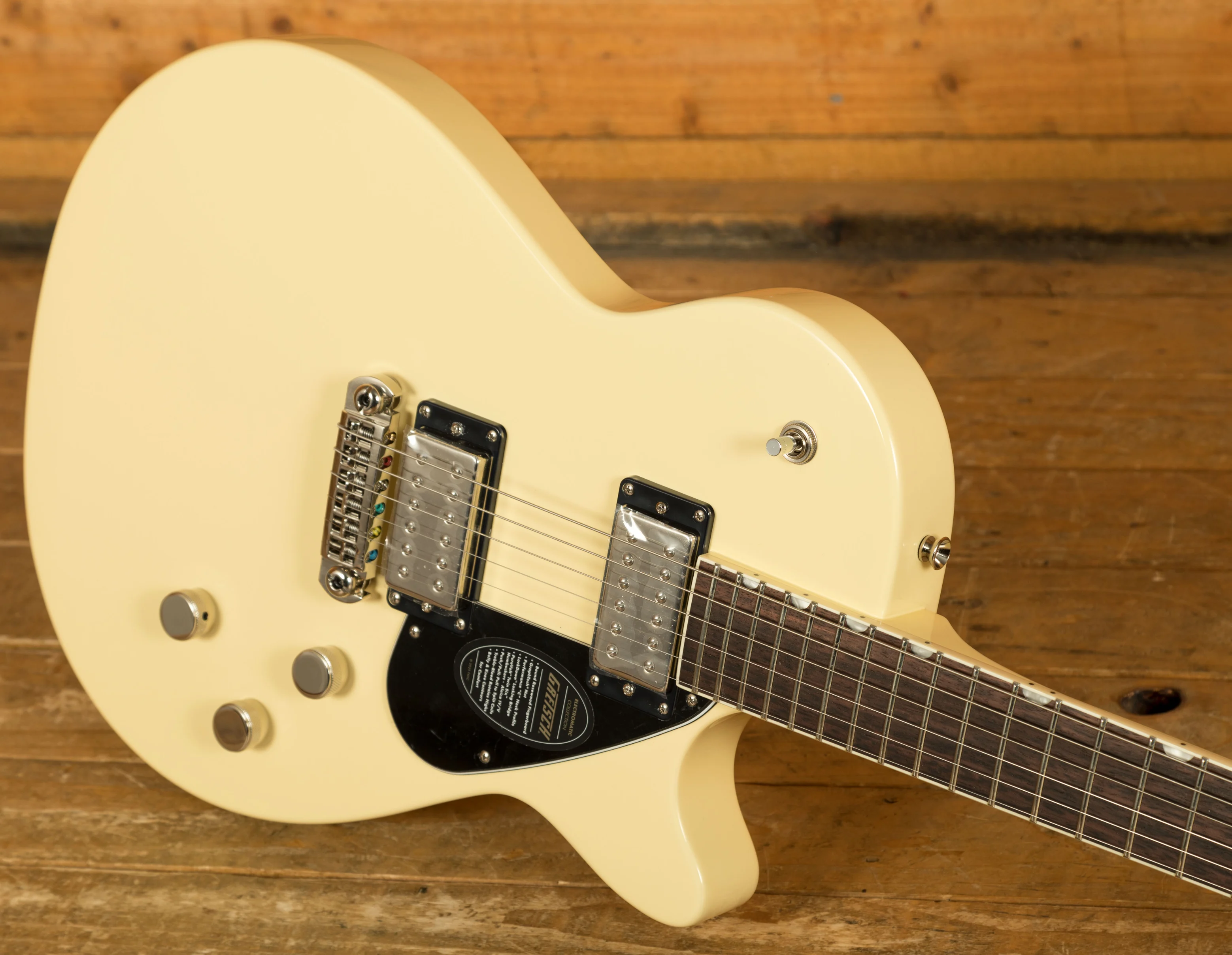 Equipped with PureVolt Twin Six humbuckers, the Electromatic Jet Club delivers a broad tonal range from articulate cleans to powerful overdrive. Each pickup features adjustable pole pieces and Alnico magnets, providing excellent clarity, output, and flexibility. The advanced electronic circuit includes a master volume with treble bleed for consistent brightness at lower volumes, individual tone controls for precise shaping, and push/pull coil-splitting for true single-coil tones without unwanted noise. Additional features such as the GraphTech NuBone nut ensure stable tuning and long-lasting sustain, while the Lockdown adjustable wraparound bridge enhances resonance, sustain, and intonation accuracy. Every element of the Electromatic Jet Club is designed to provide dependable performance, tonal versatility, and lasting quality.