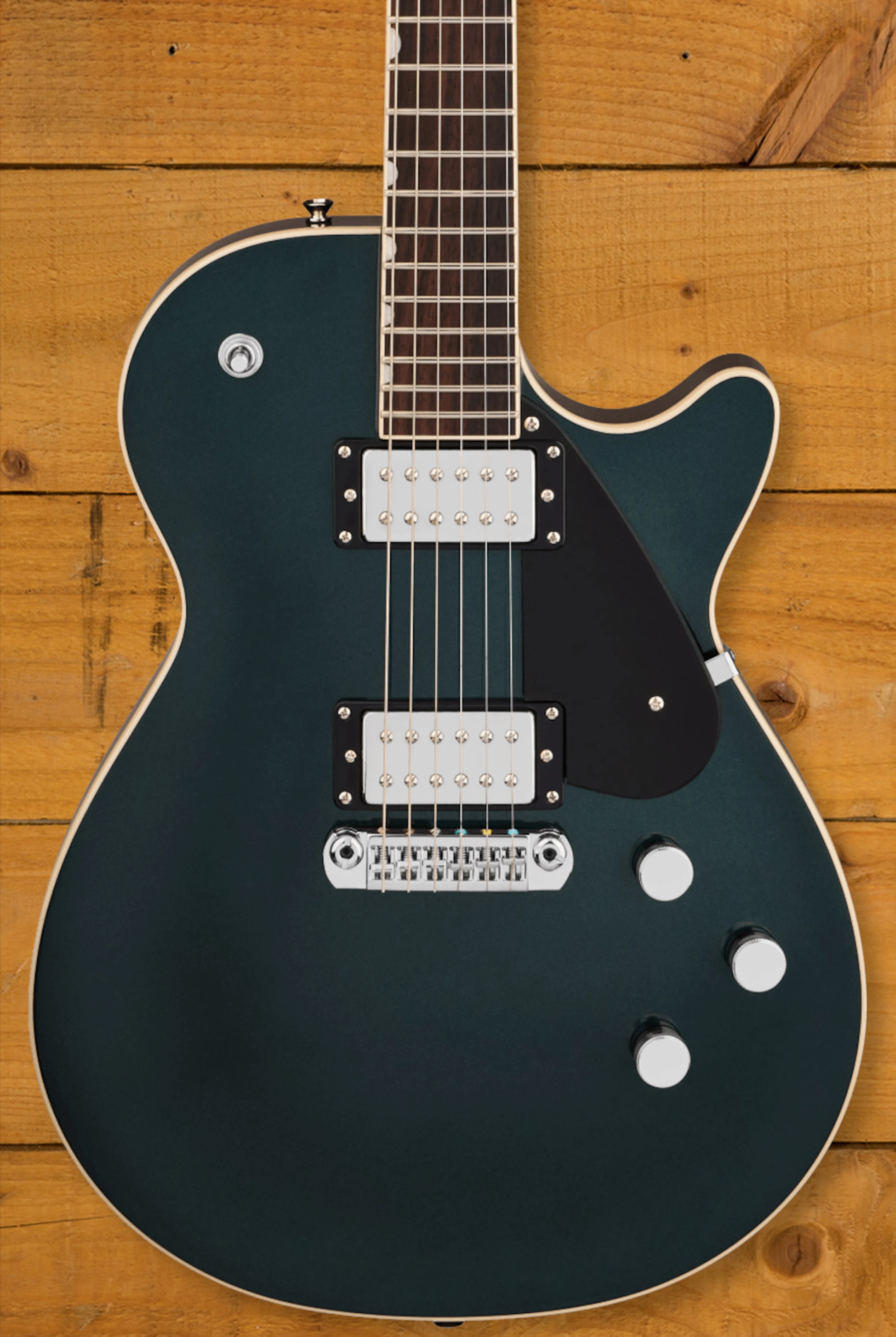 Equipped with PureVolt Twin Six humbuckers, the Electromatic Jet delivers a wide range of tones with impressive clarity and responsiveness. Each pickup features adjustable pole pieces for fine-tuning the output and balance. The advanced electronics include a master volume with treble bleed circuit for maintaining brightness at any level, individual tone controls for each pickup, and push/pull tone pots that offer true single-coil options with hum-cancelling performance in the middle position. Additional hardware features such as a GraphTech NuBone nut and Lockdown locking adjustable wraparound bridge provide excellent tuning stability, sustain, and easy string changes, ensuring consistent performance and reliability every time you play.