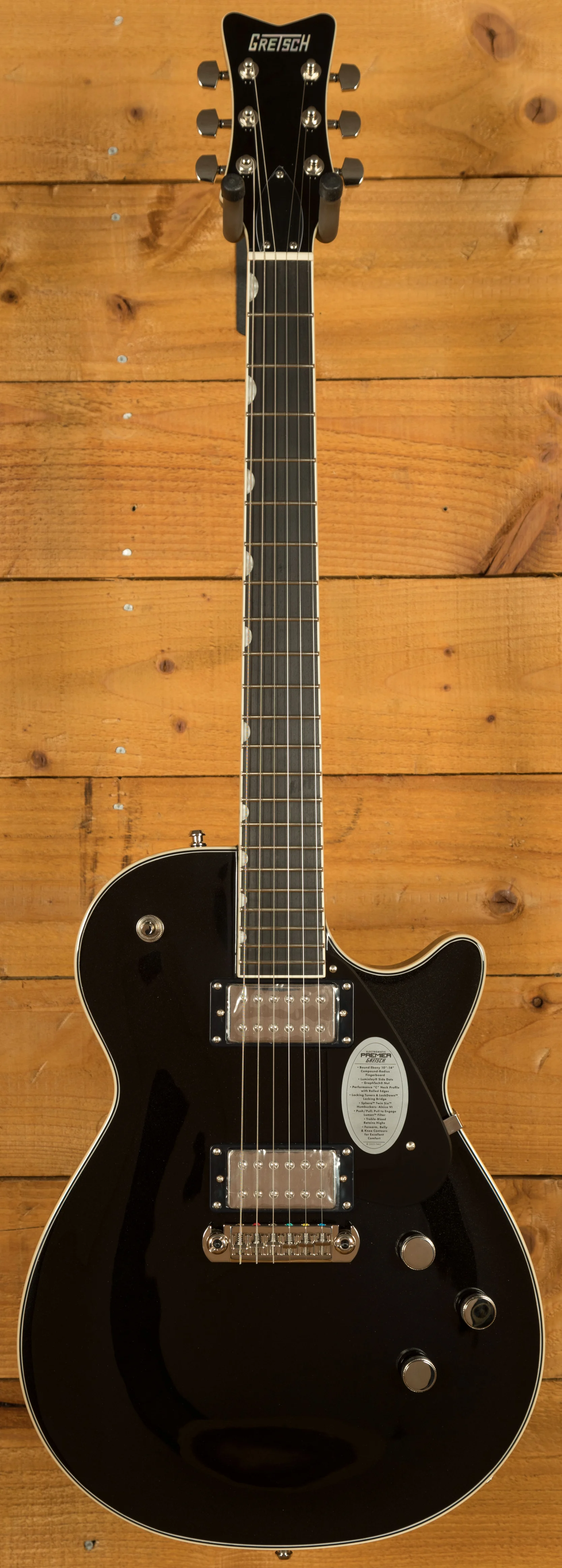 Equipped with Sphera Twin Six humbuckers, the Electromatic Jet delivers a wide range of tones with impressive clarity, dynamics, and responsiveness. Each pickup features 12 adjustable pole pieces for fine-tuning the output and balance. The advanced electronics include a master volume with treble bleed circuit for maintaining brightness at any level, individual tone controls with no-load function for each pickup, and a push/pull on the master volume that engages the custom Lumen Filter for a tighter, snappier response. Additional hardware features such as a GraphTech NuBone nut, locking tuners, and Lockdown locking adjustable wraparound bridge provide excellent tuning stability, sustain, and easy string changes, ensuring consistent performance and reliability every time you play.