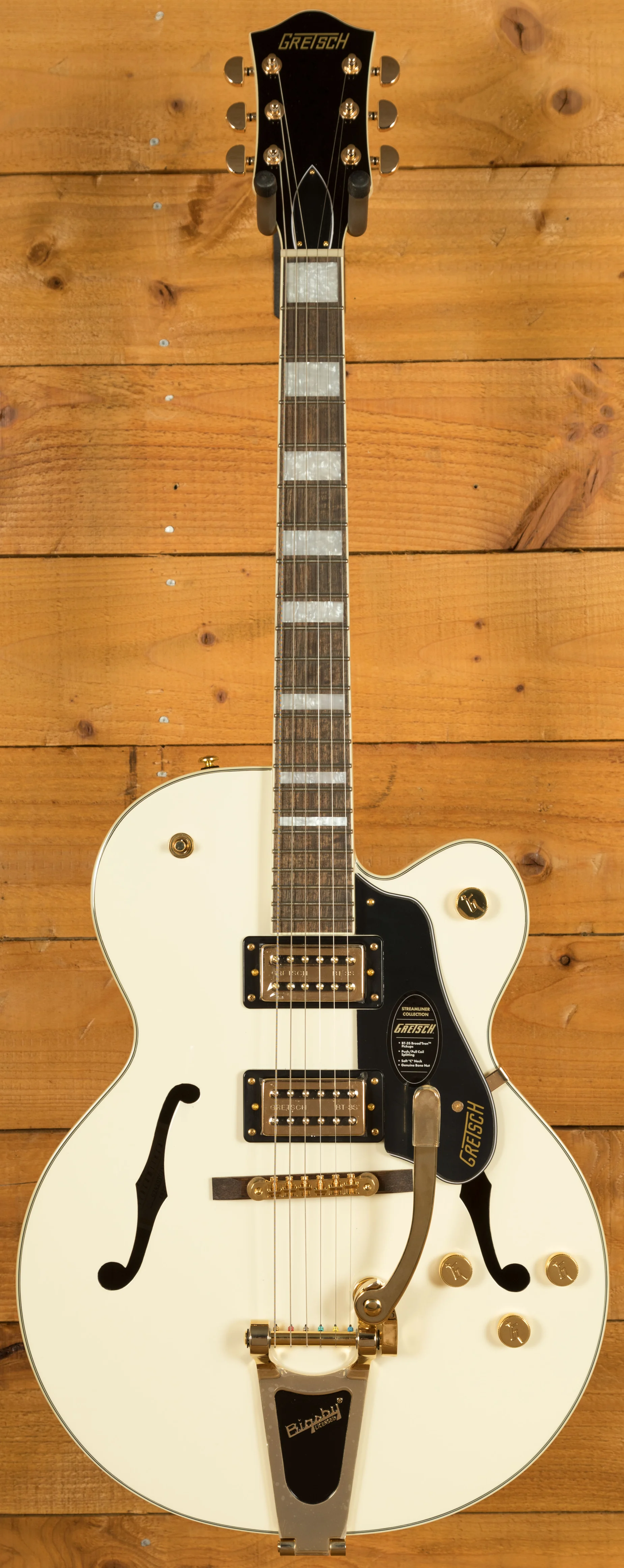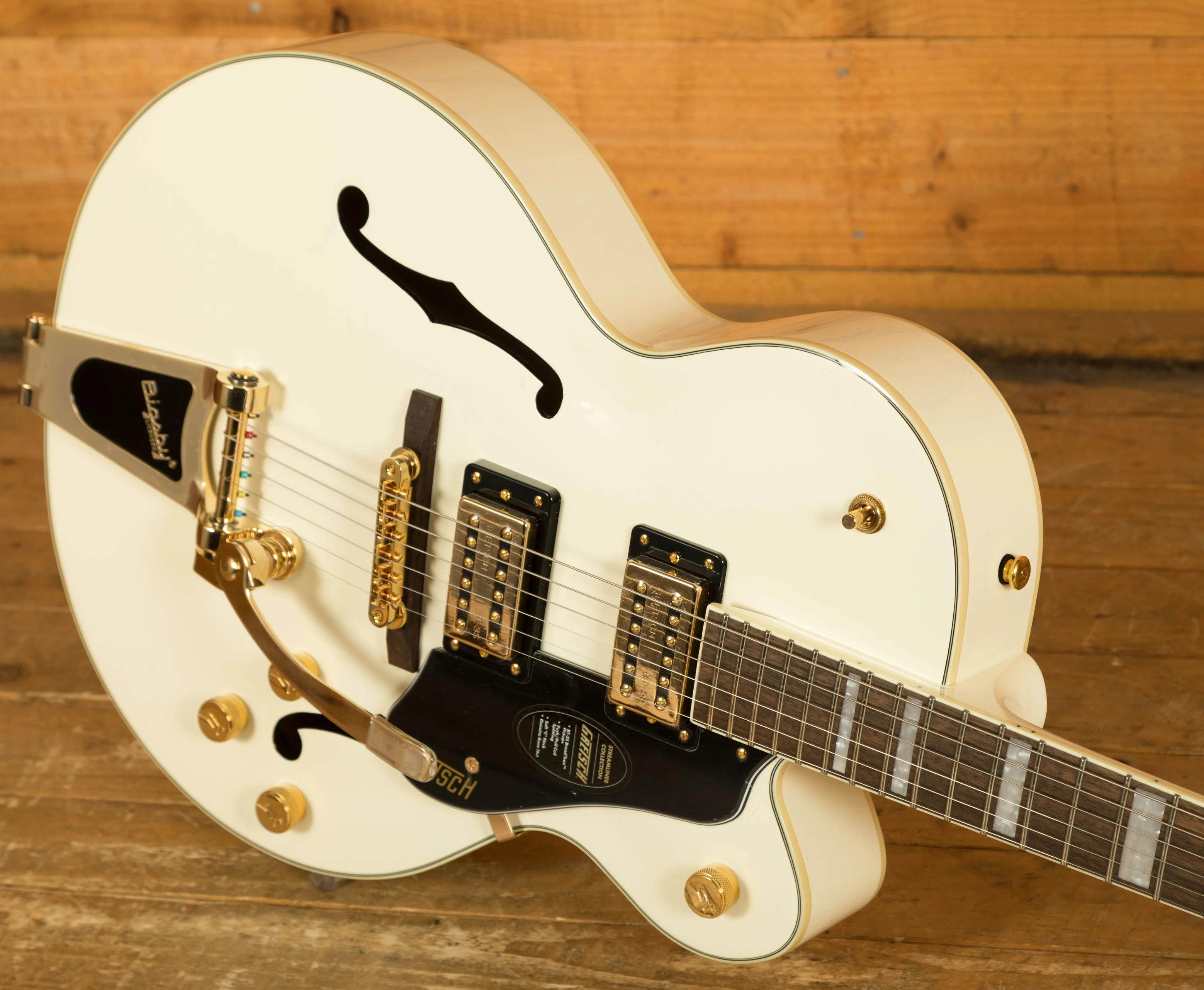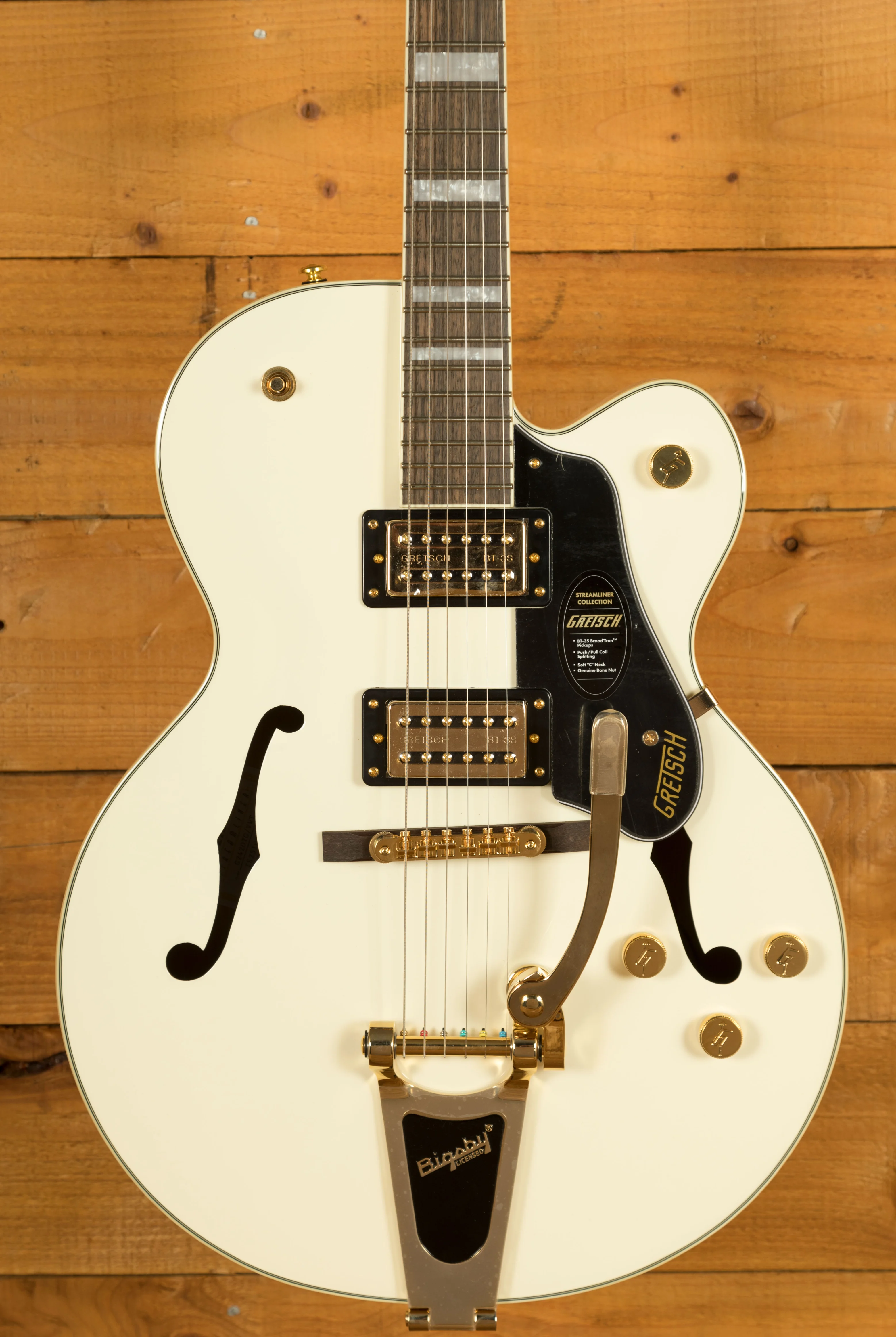 The Limited Edition Gretsch G2420TG Streamliner Hollow Body Single-Cut with Bigsby in Vintage White delivers the rich resonance, bold style and unmistakable character that define classic Gretsch hollow bodies, now enhanced with modern electronics and premium LTD appointments. With its gleaming gold hardware, metal G-Arrow control knobs and pearloid Big Block inlays, this model is built for players who want something beyond the ordinary while retaining the essence of That Great Gretsch Sound.