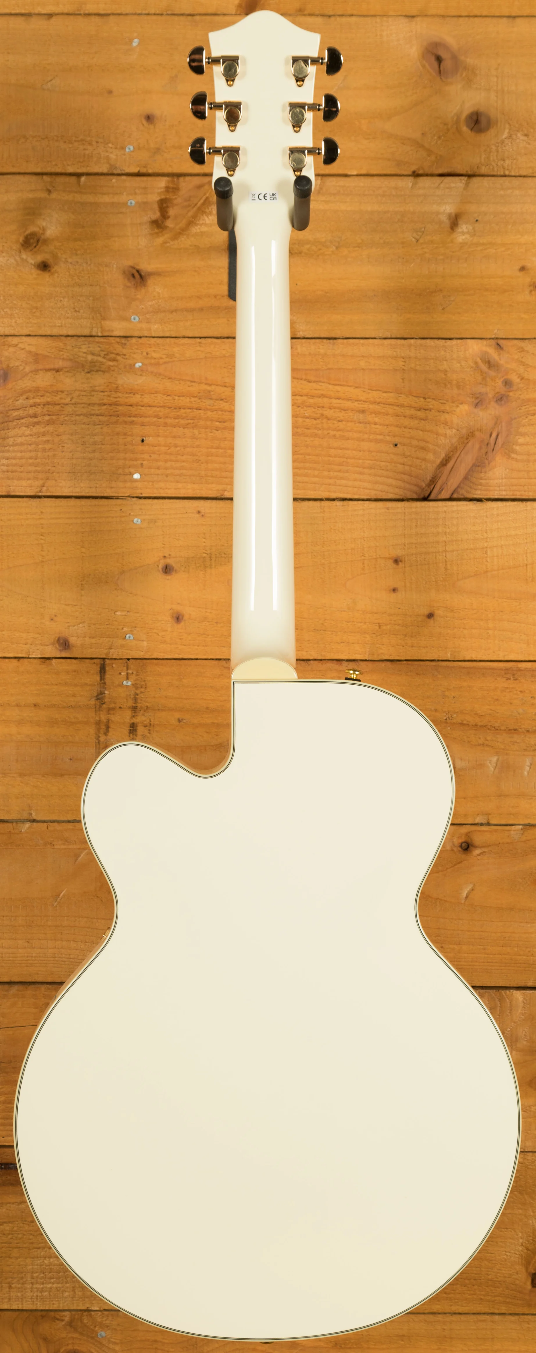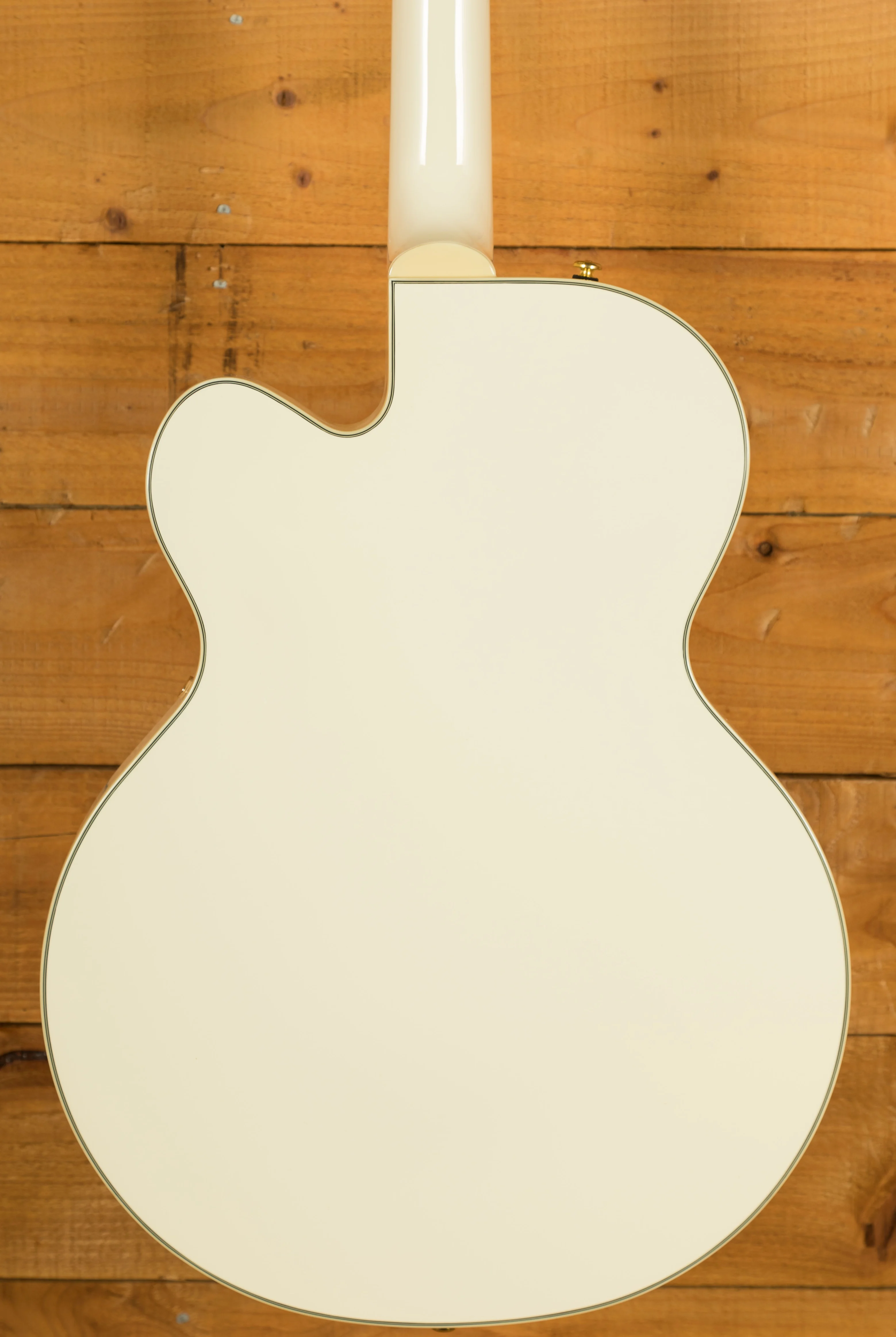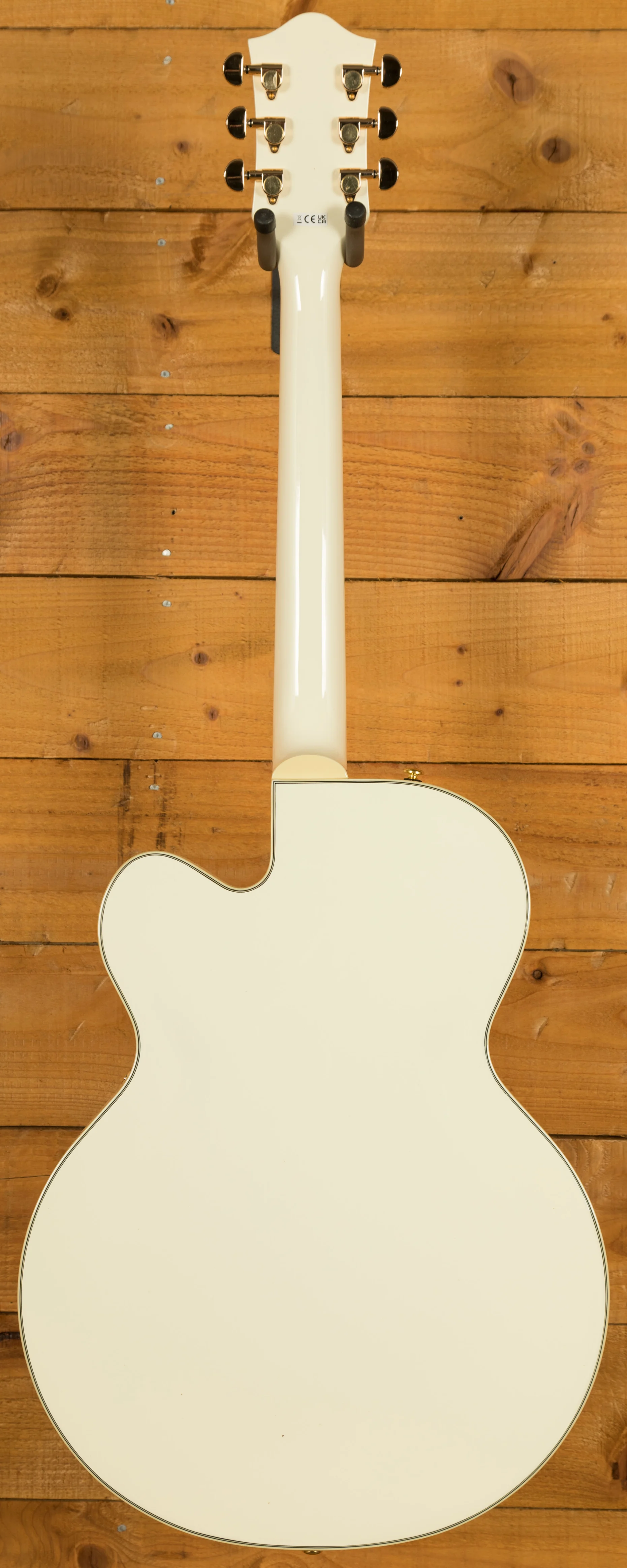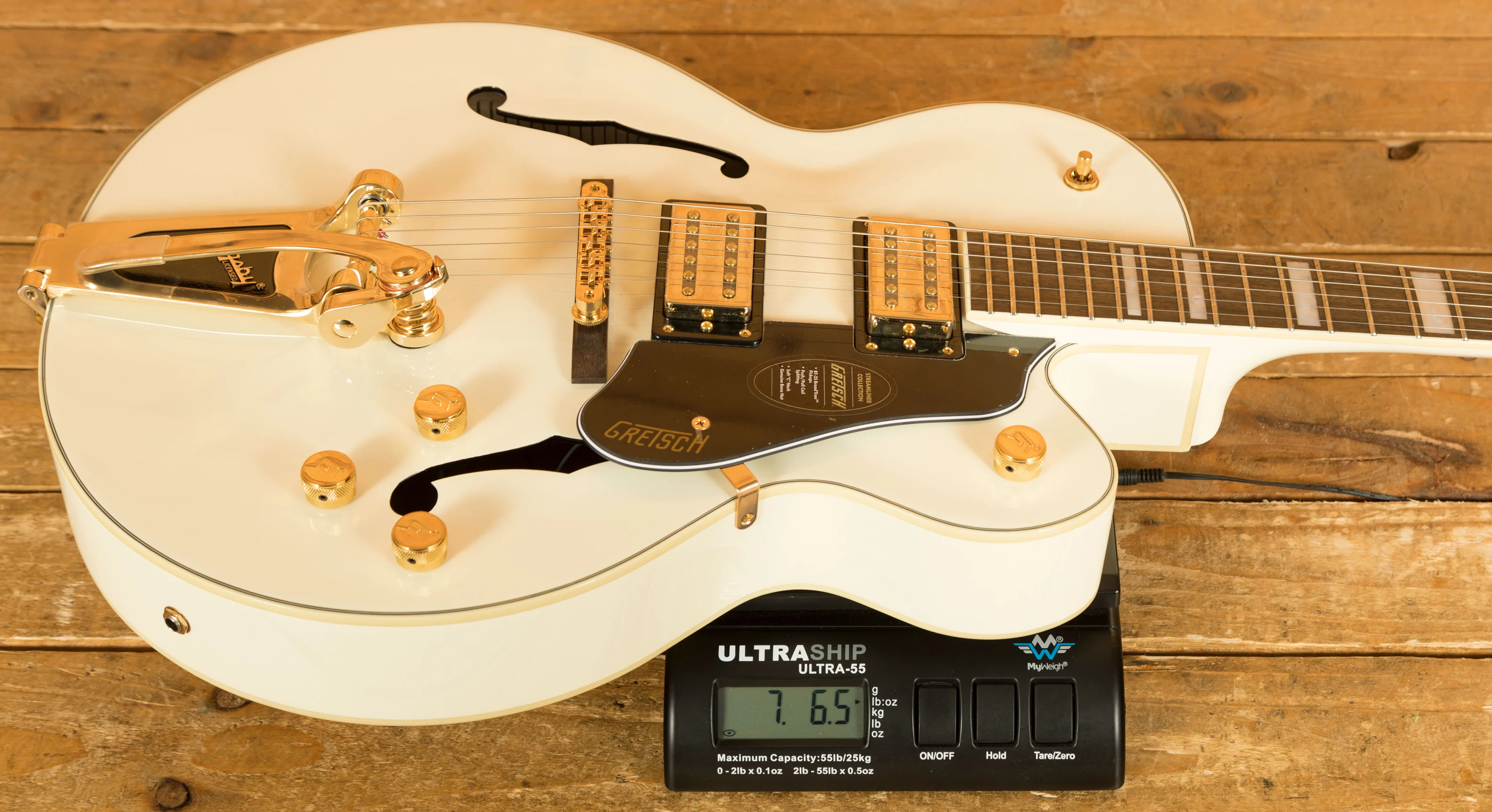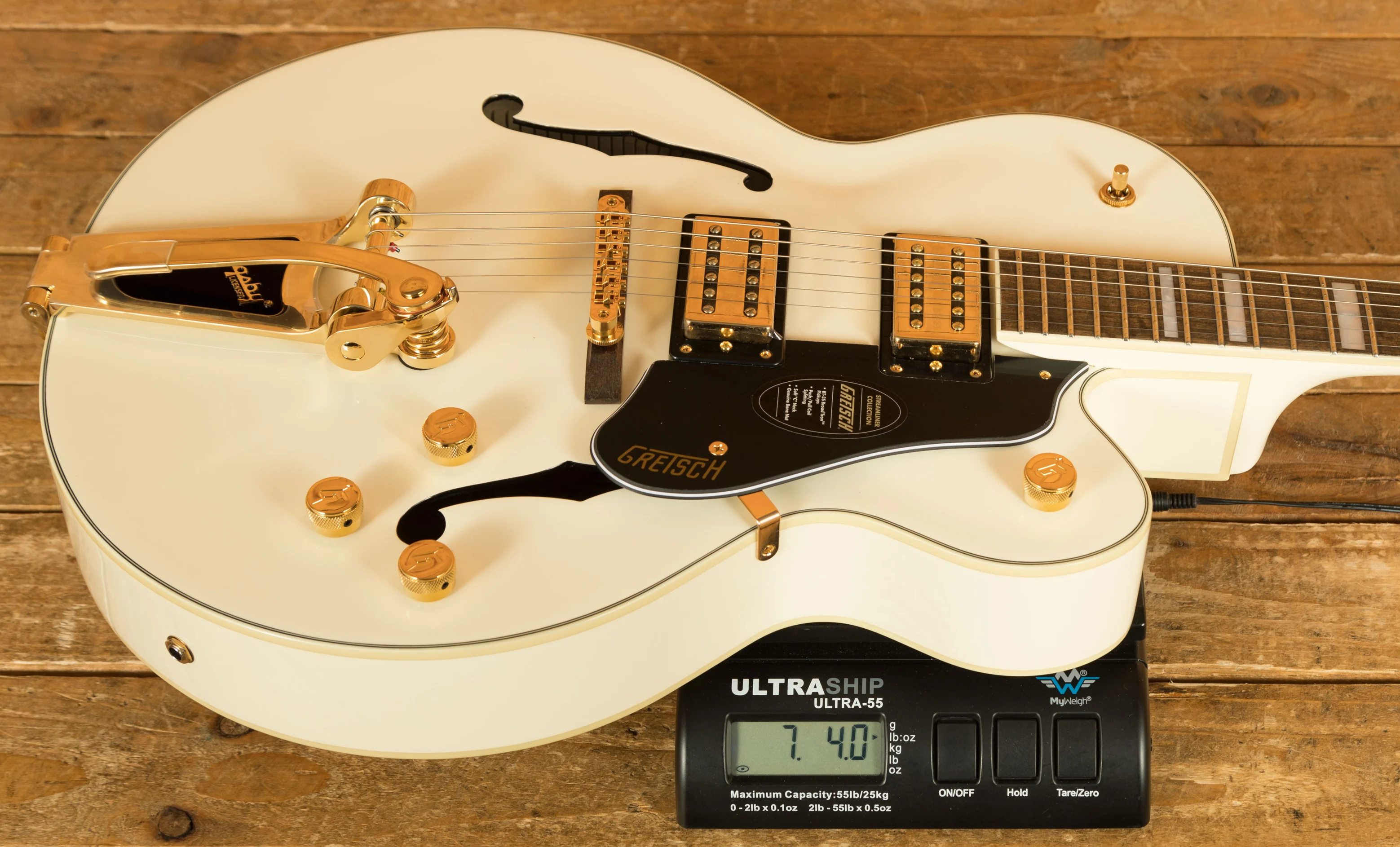 The fully hollow arched maple body produces deep resonance, airy projection and the unmistakable big-body tone that hollow Gretsch guitars are known for. Whether you're comping jazz chords, playing rootsy Americana or pushing into gritty blues and rock, the G2420TG offers a warm, open voice with plenty of character. The Vintage White finish paired with gold hardware gives the guitar a refined, elegant aesthetic that stands out on any stage.