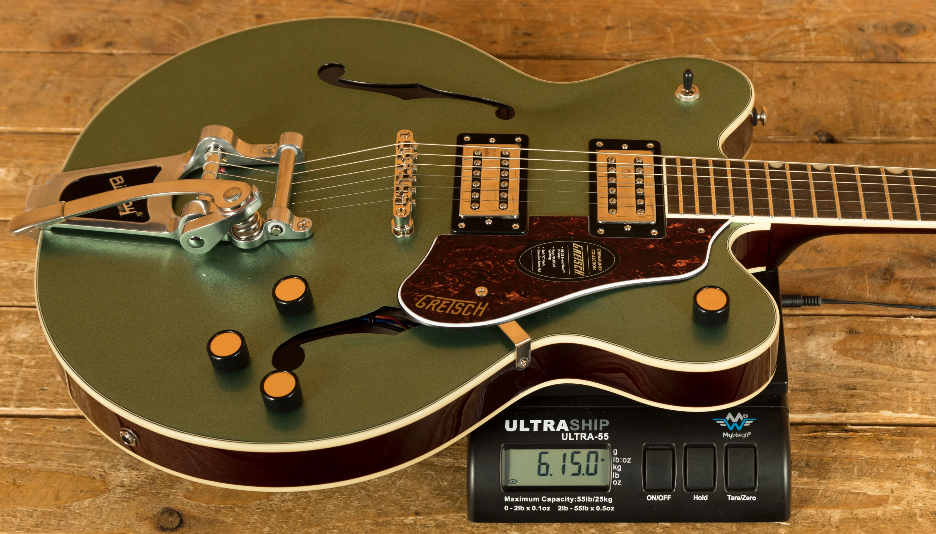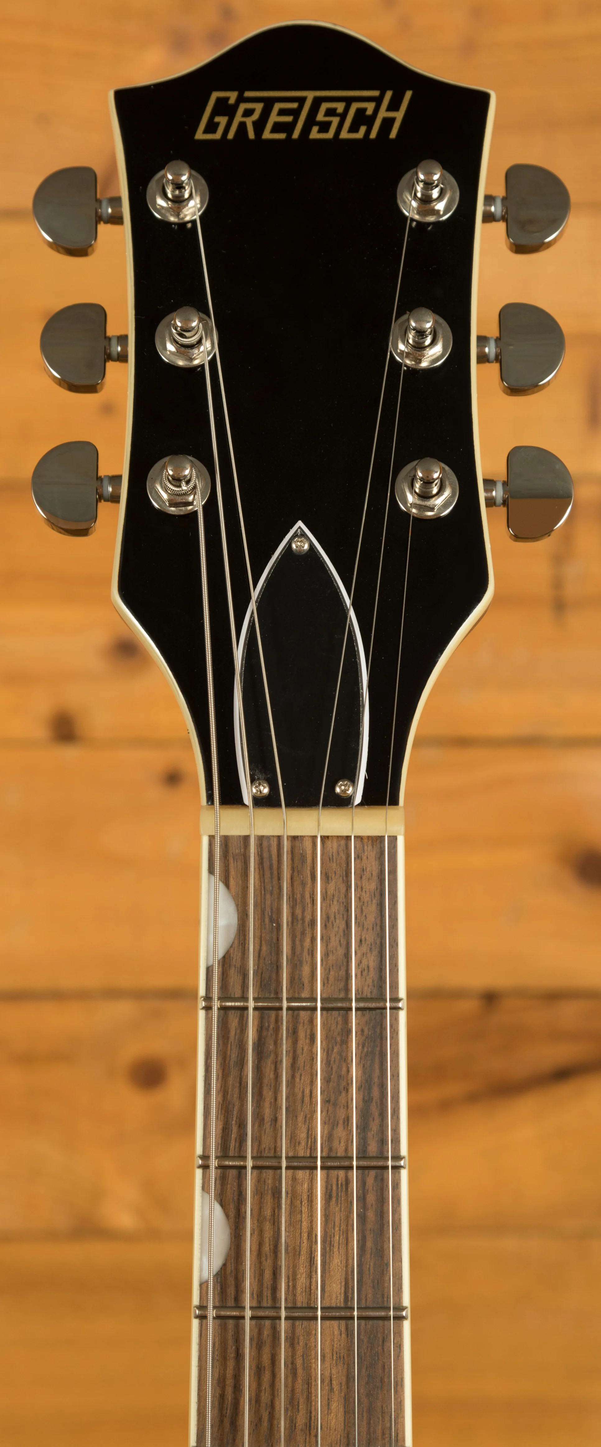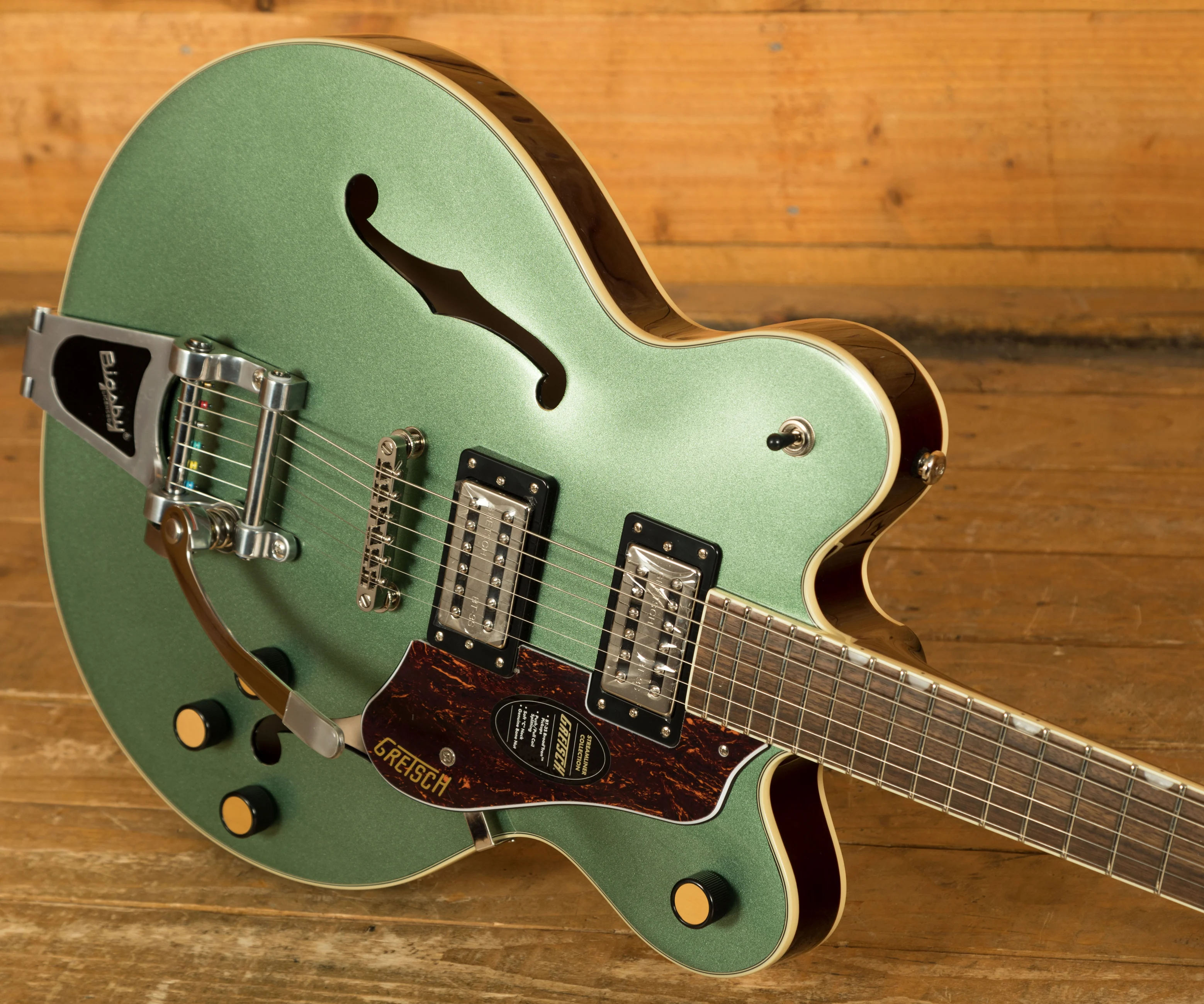 The G2622T also features a master volume, master tone, and individual pickup volume controls, giving players full control over their sound. The push/pull coil-splitting function on the master volume allows for even greater tonal flexibility, enabling the player to switch between humbucking and single-coil sounds. Additionally, the guitar is equipped with an anchored Adjusto-Matic bridge for superior tuning stability and a Bigsby B70 vibrato tailpiece, providing smooth pitch-bending capabilities. Other thoughtful details include a three-ply tortoise pickguard and nickel hardware, which add both durability and aesthetic appeal to the instrument.