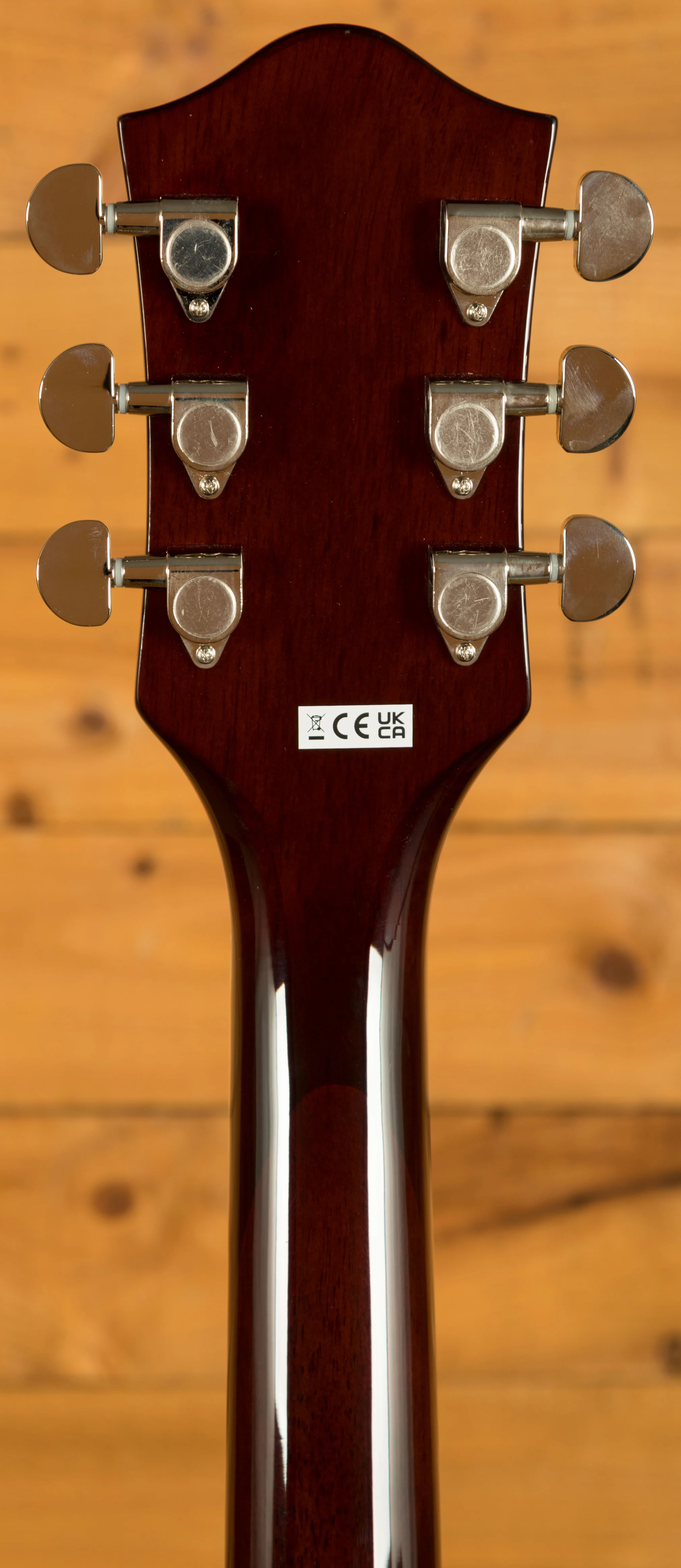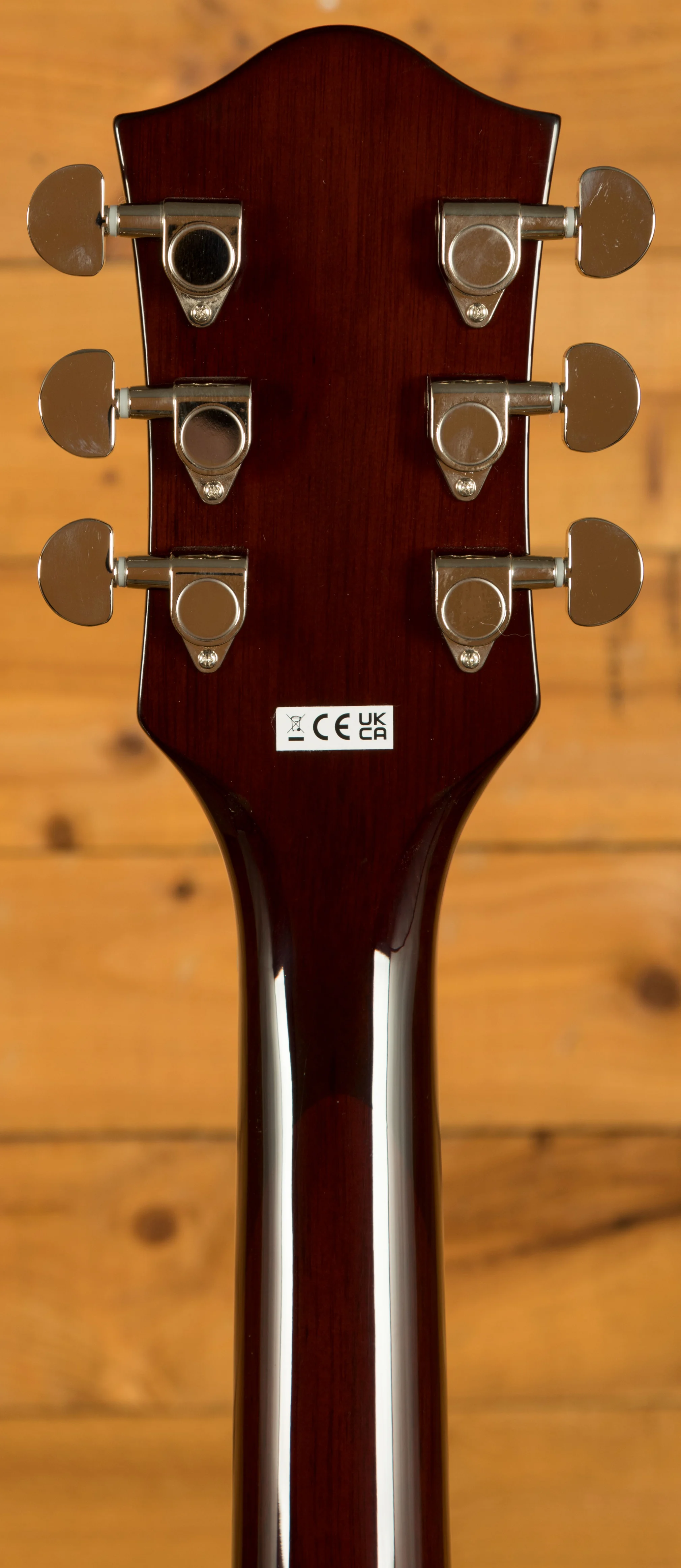 The guitar's double-cutaway 16" arched maple body is equipped with a chambered centre block, which enhances sustain and reduces feedback, making it ideal for high-volume performances. The soft "C" shaped nato neck provides comfort and ease of playability, while the 12"-radius laurel fingerboard, complete with pearloid Neo Classic thumbnail inlays, offers a smooth playing surface. The 22 medium jumbo frets make it easy to navigate the fretboard, providing ample space for both chord work and lead solos.