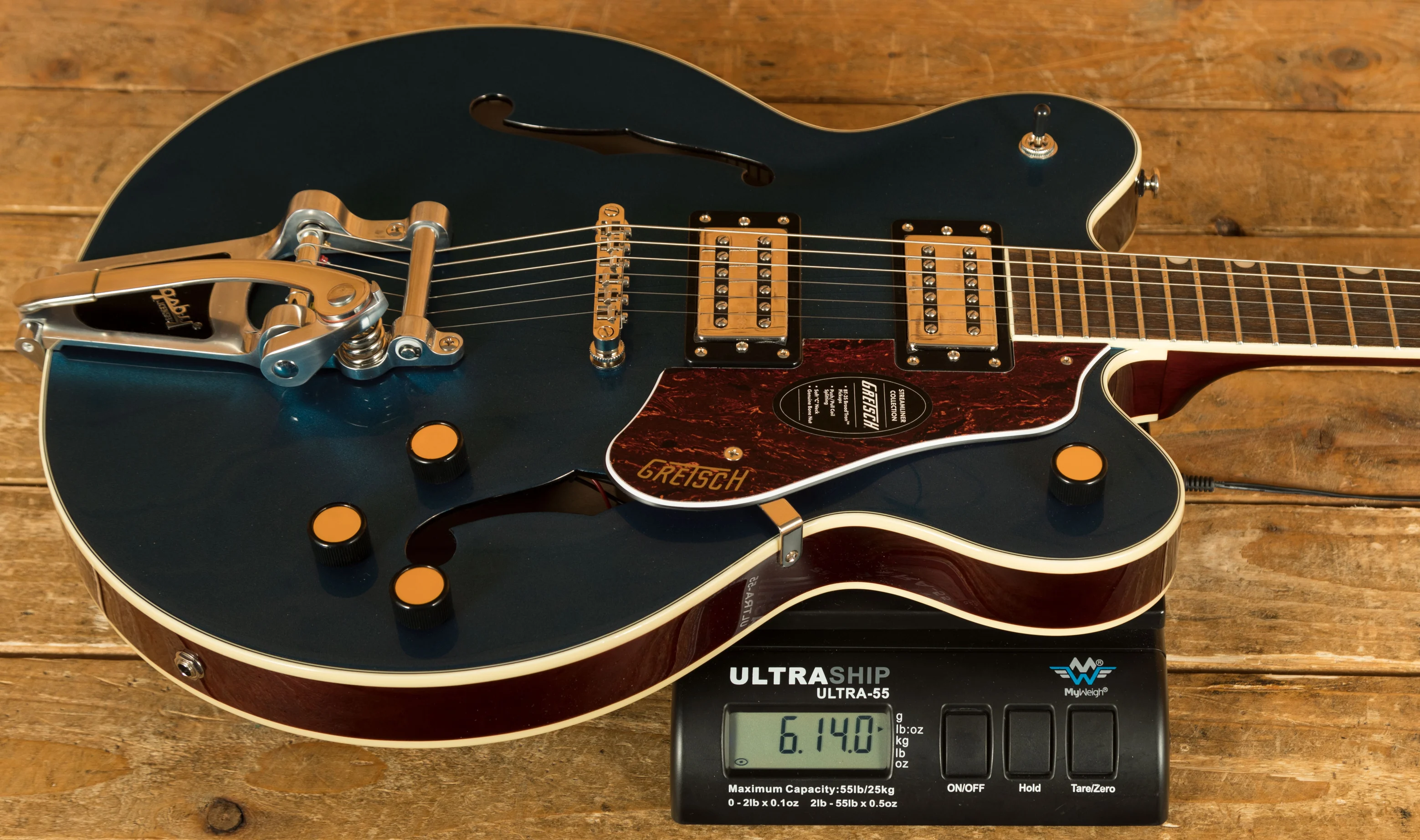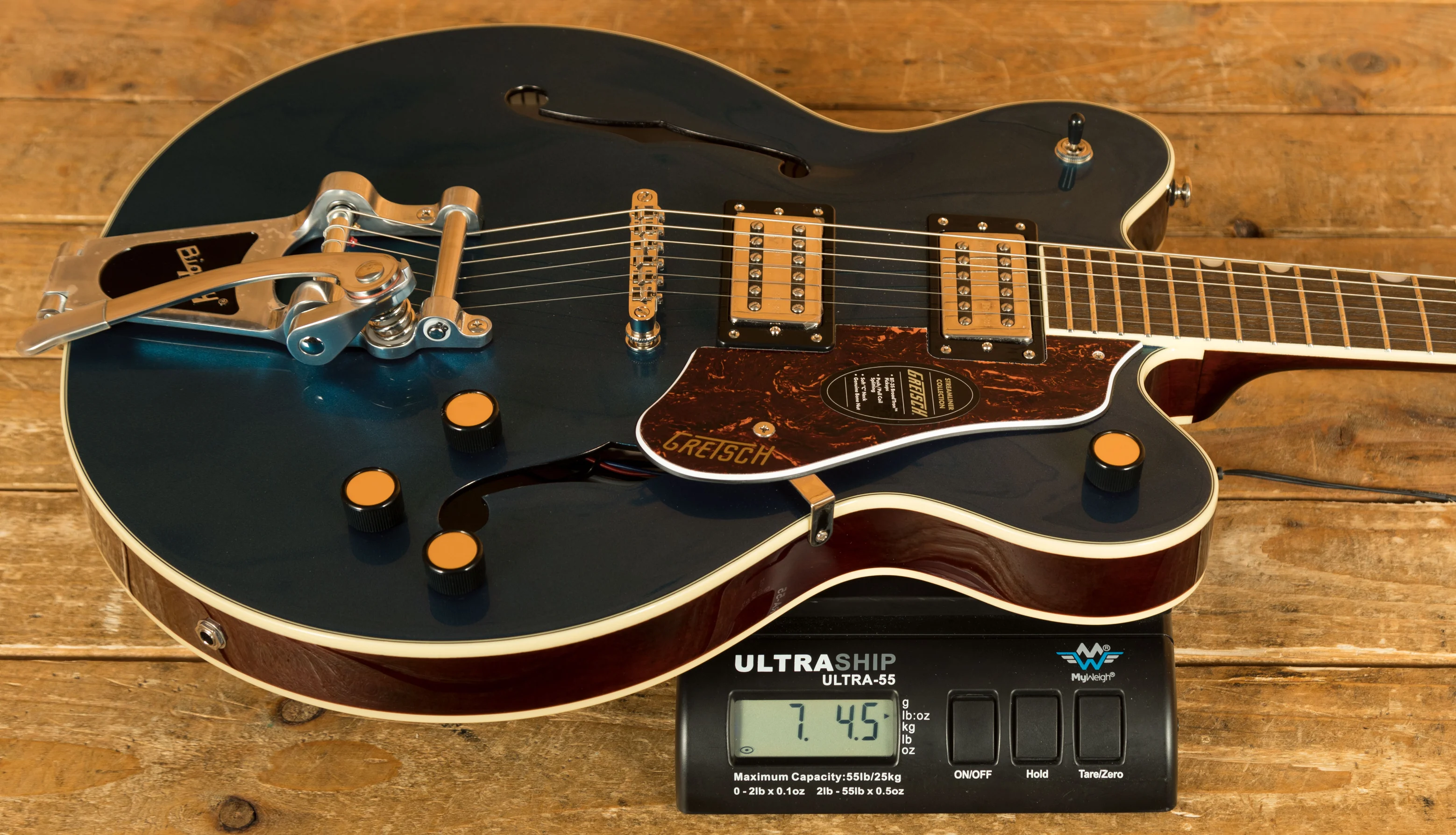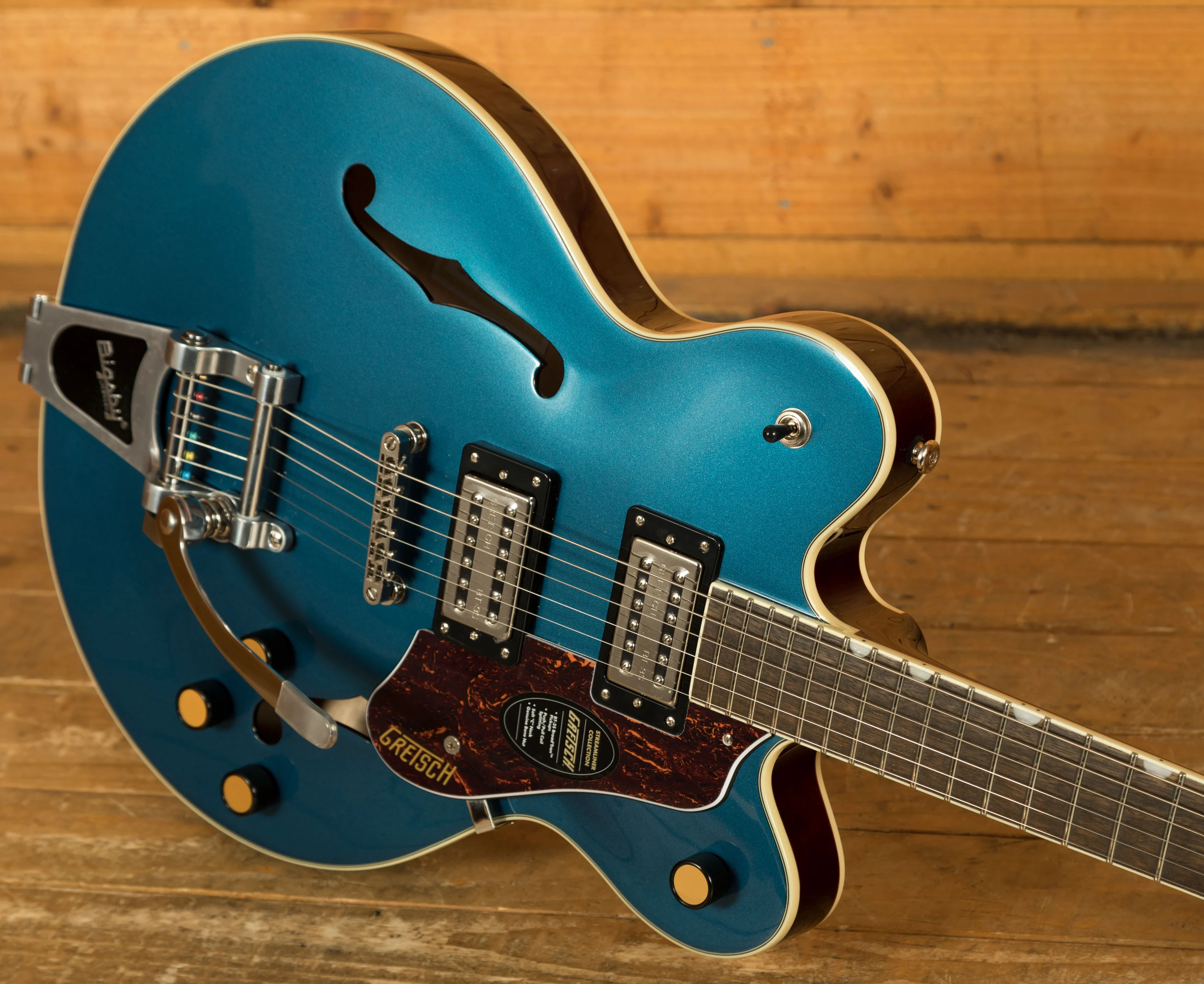 Additional features include a 1.6875" real bone nut for improved tuning stability and tonal integrity, and an anchored Adjusto-Matic bridge for consistent intonation and sustain. The Bigsby B70 vibrato tailpiece adds expressive pitch modulation capabilities, ideal for subtle vibrato effects or vintage-style bends.