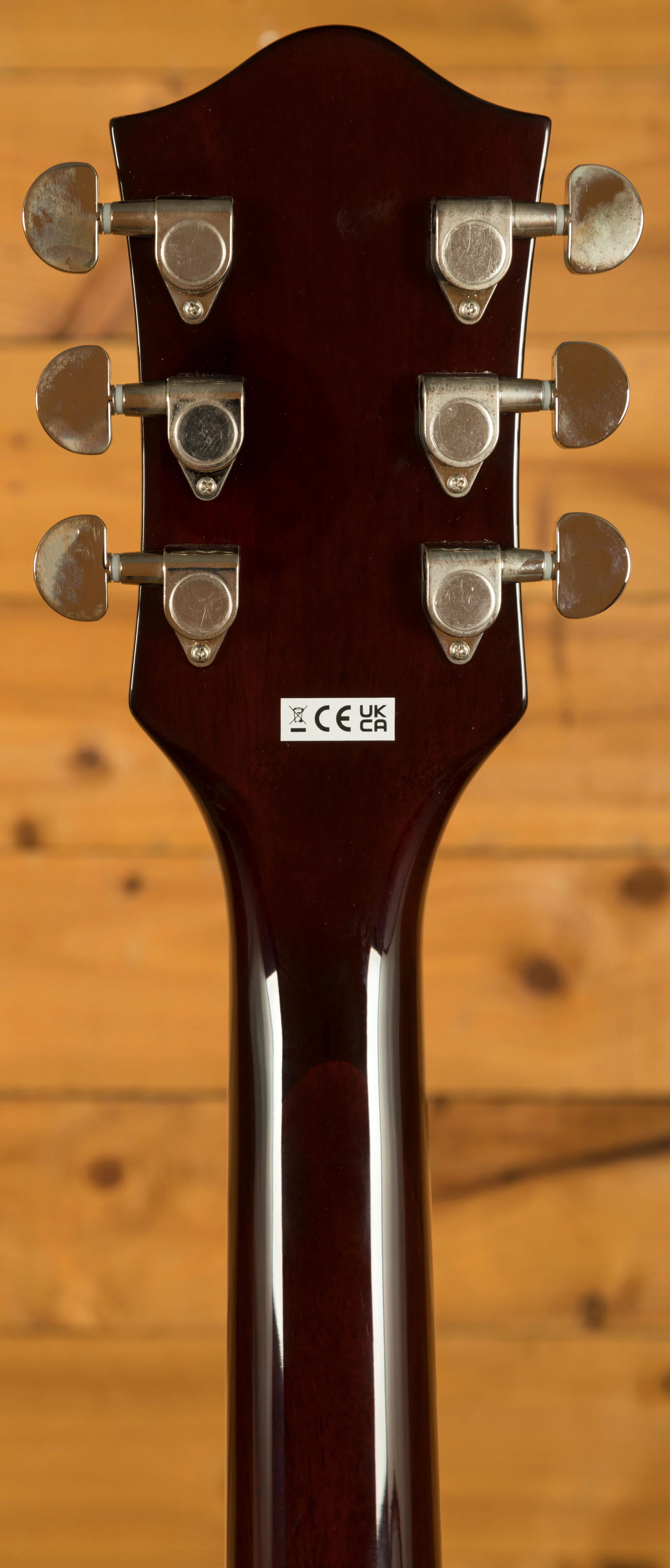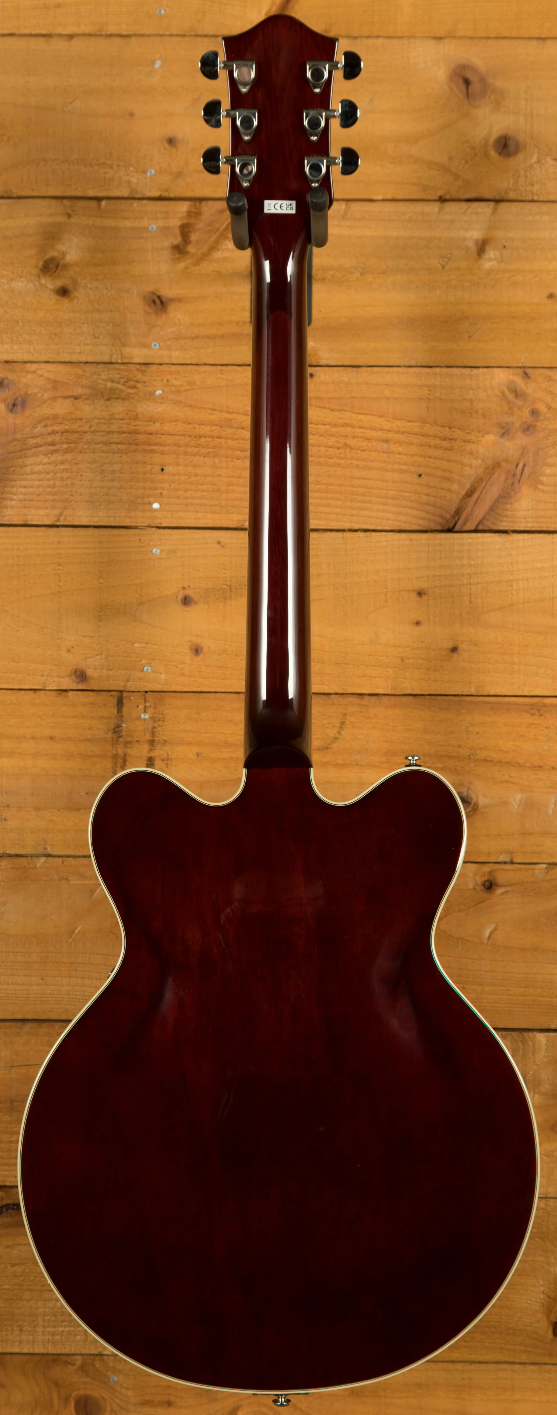 The guitar features a double-cutaway 16" arched maple body with a chambered centre block, which helps reduce feedback while enhancing sustain and resonance. This design makes it well-suited for live performance and recording, particularly in louder environments. The combination of the soft "C" shaped nato neck and 12" radius laurel fingerboard provides a comfortable and smooth playing experience, while the 24.75" scale length and 22 medium jumbo frets offer a familiar feel for a wide range of playing styles.