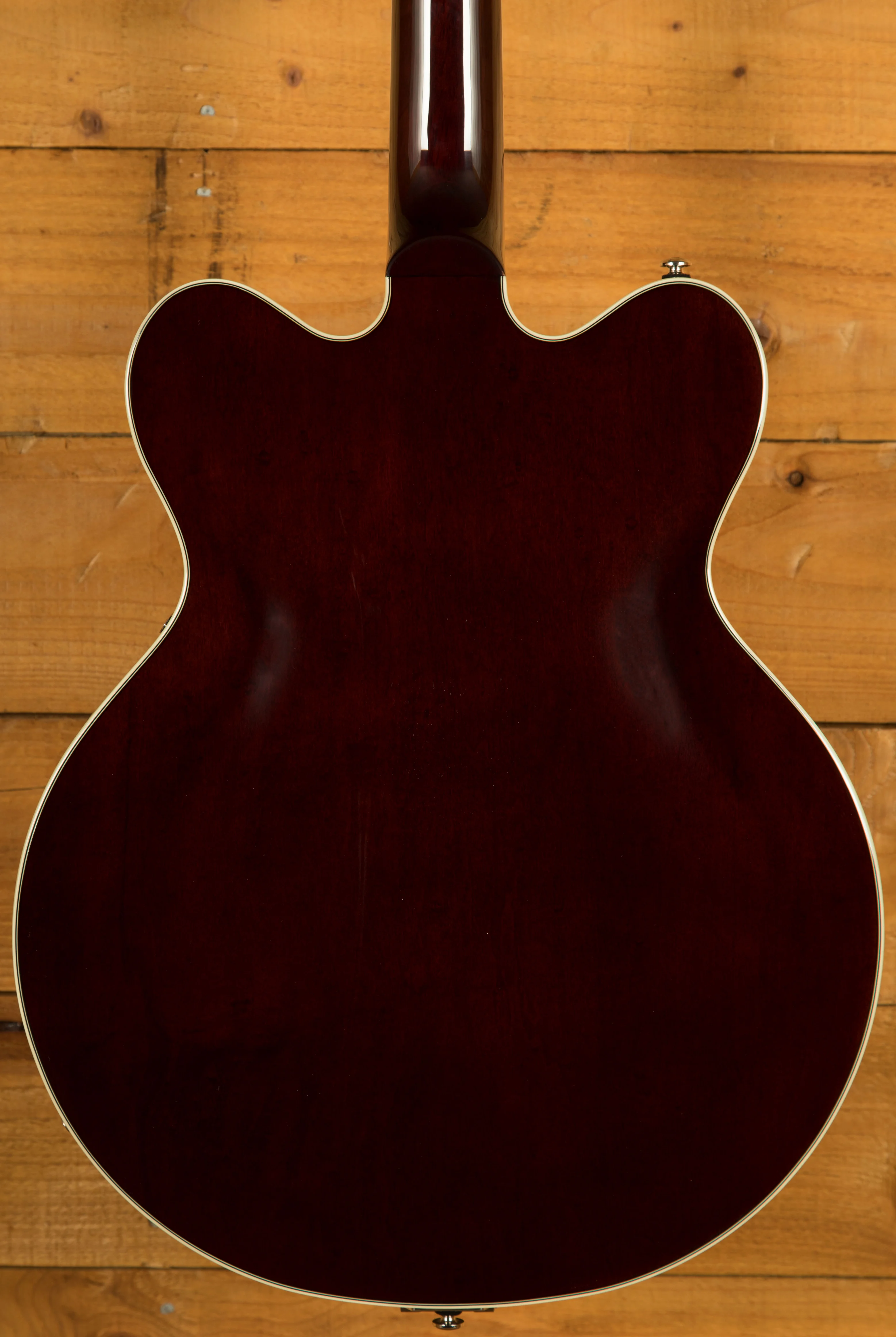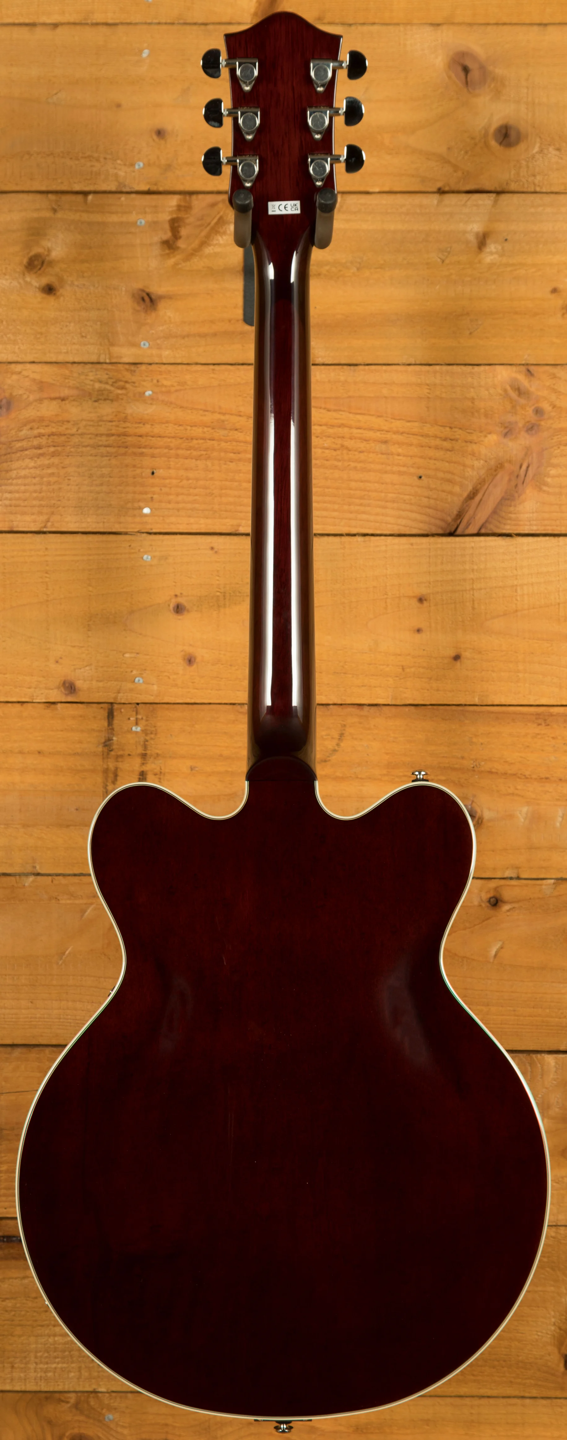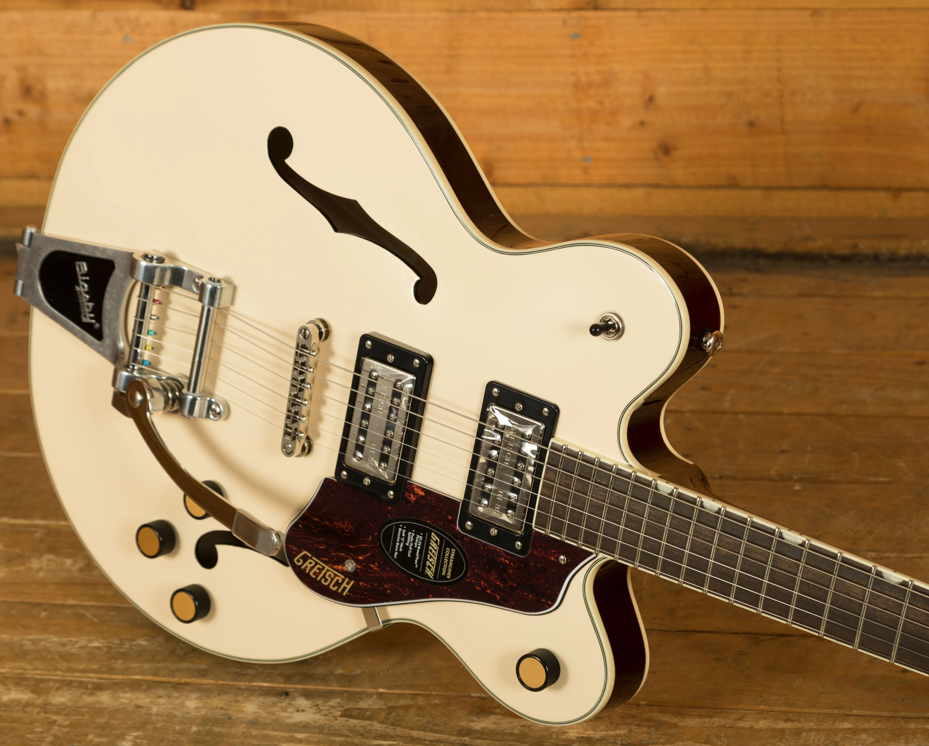 The G2622T also features a master volume, master tone, and individual pickup volume controls, giving players full control over their sound. The push/pull coil-splitting function on the master volume allows for even greater tonal flexibility, enabling the player to switch between humbucking and single-coil sounds. Additionally, the guitar is equipped with an anchored Adjusto-Matic bridge for superior tuning stability and a Bigsby B70 vibrato tailpiece, providing smooth pitch-bending capabilities. Other thoughtful details include a three-ply tortoise pickguard and nickel hardware, which add both durability and aesthetic appeal to the instrument.