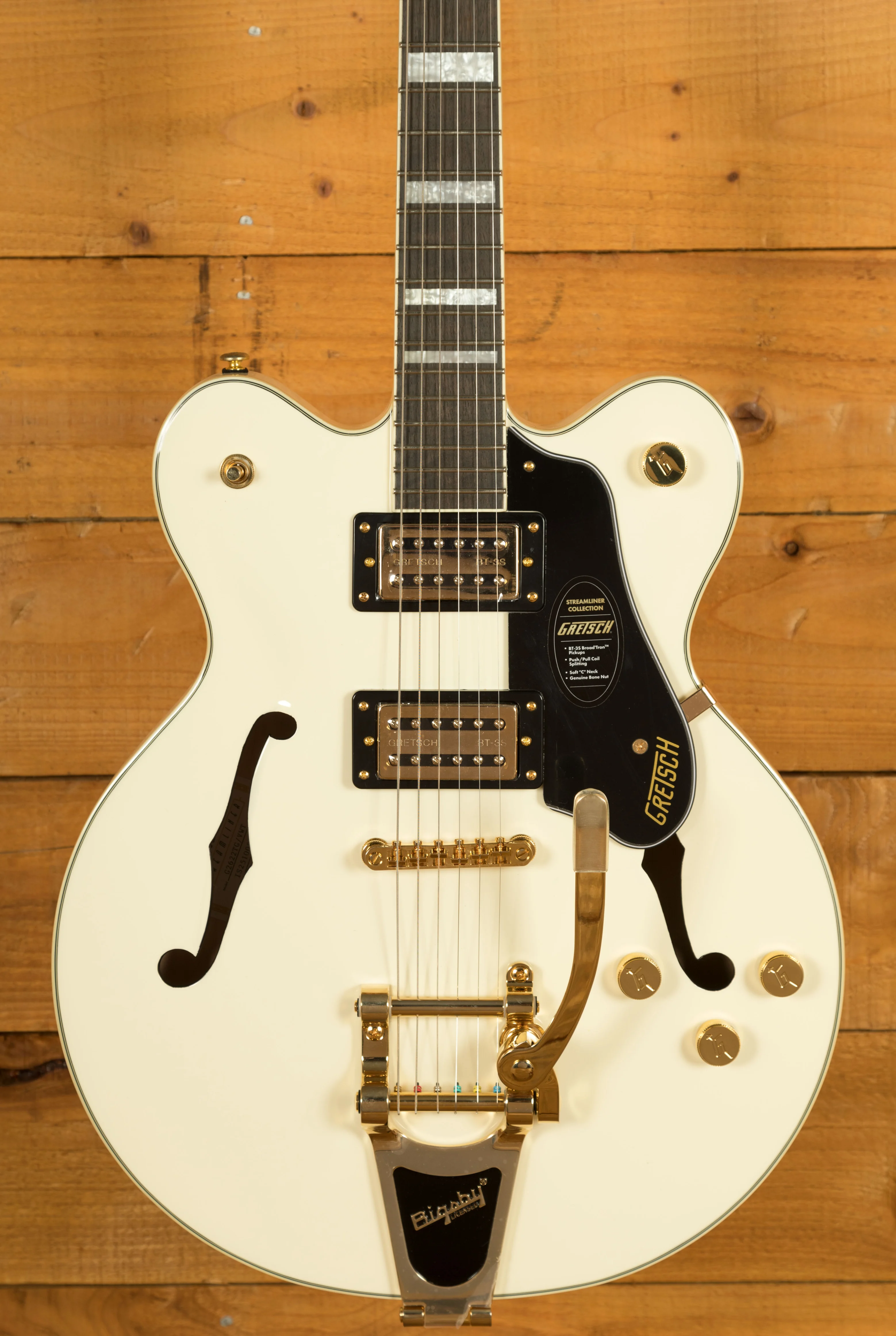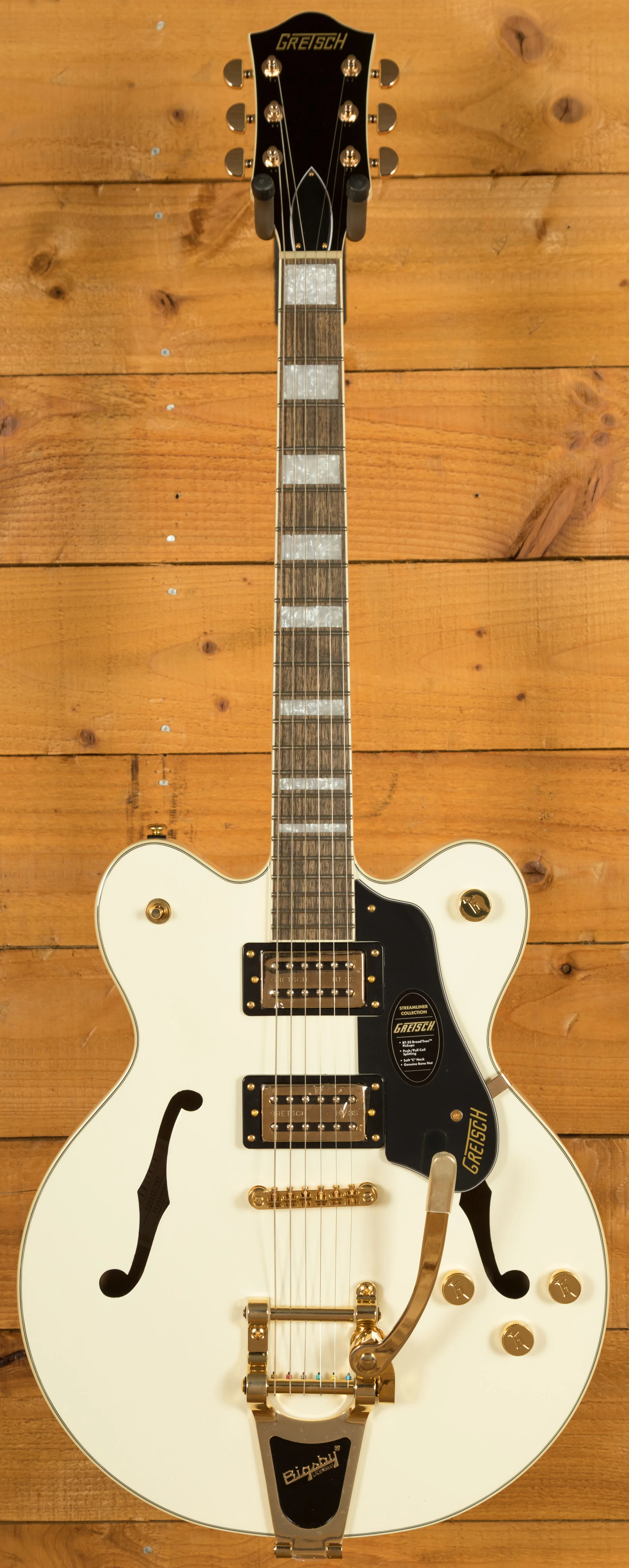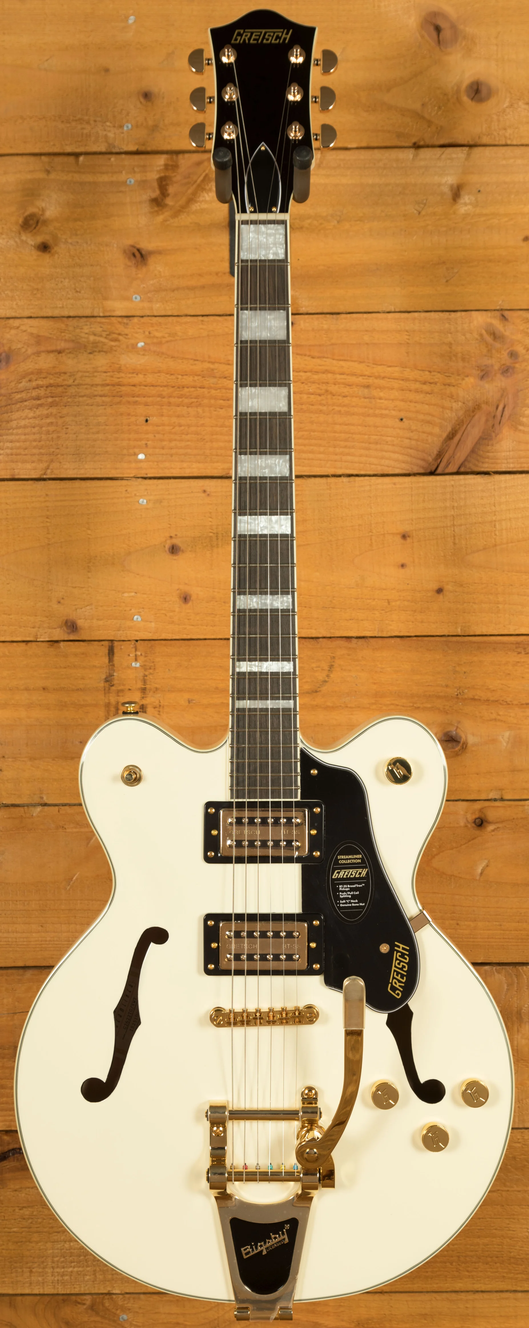 The Limited Edition Gretsch G2622TG Streamliner Centre Block Double-Cut with Bigsby in Vintage White brings bold style, modern power and unmistakable Gretsch character together in a standout package. With its gleaming gold hardware, metal G-Arrow control knobs and pearloid Big Block inlays, this LTD model is built for players who want more presence, more performance and more volume, all while retaining the classic Streamliner feel.