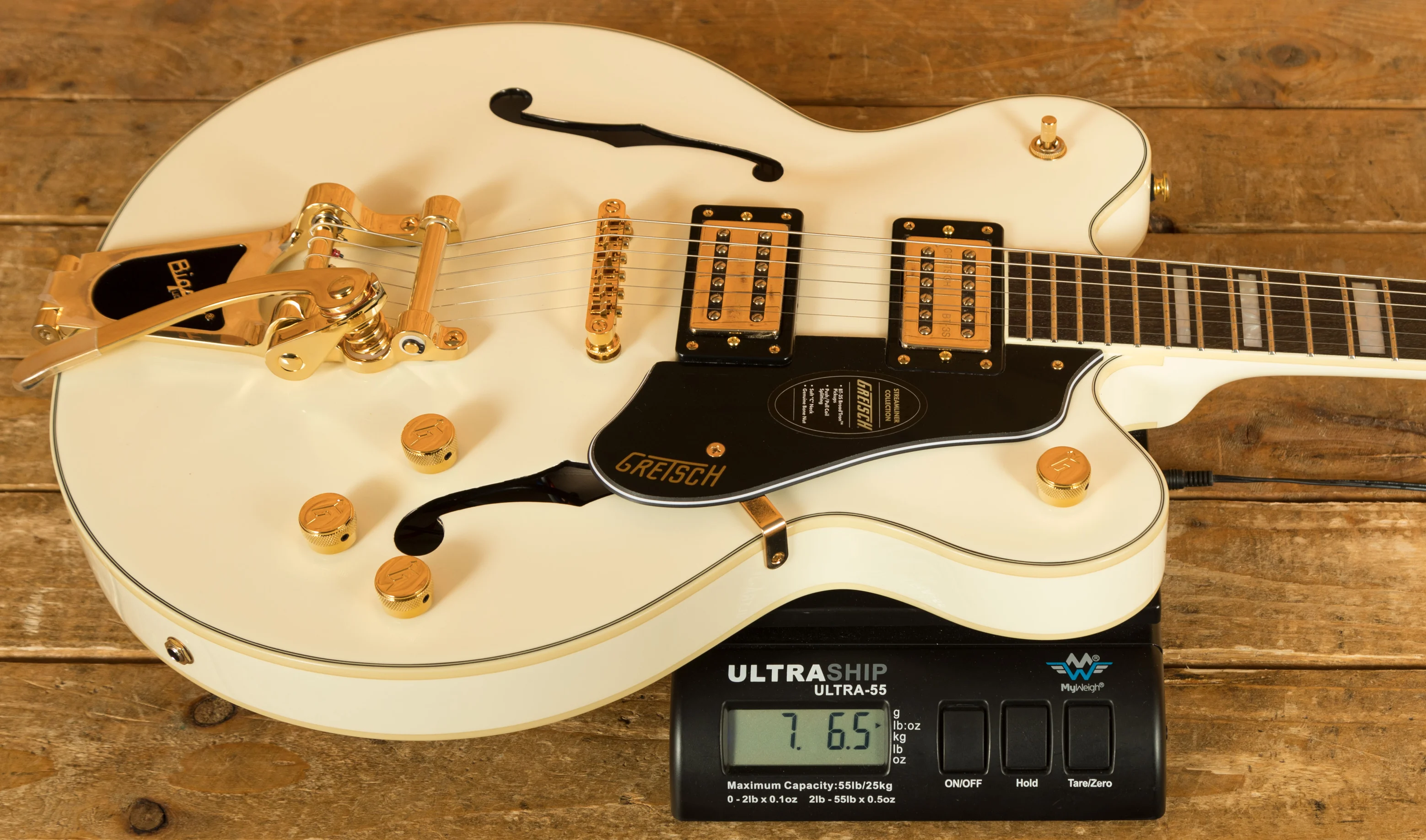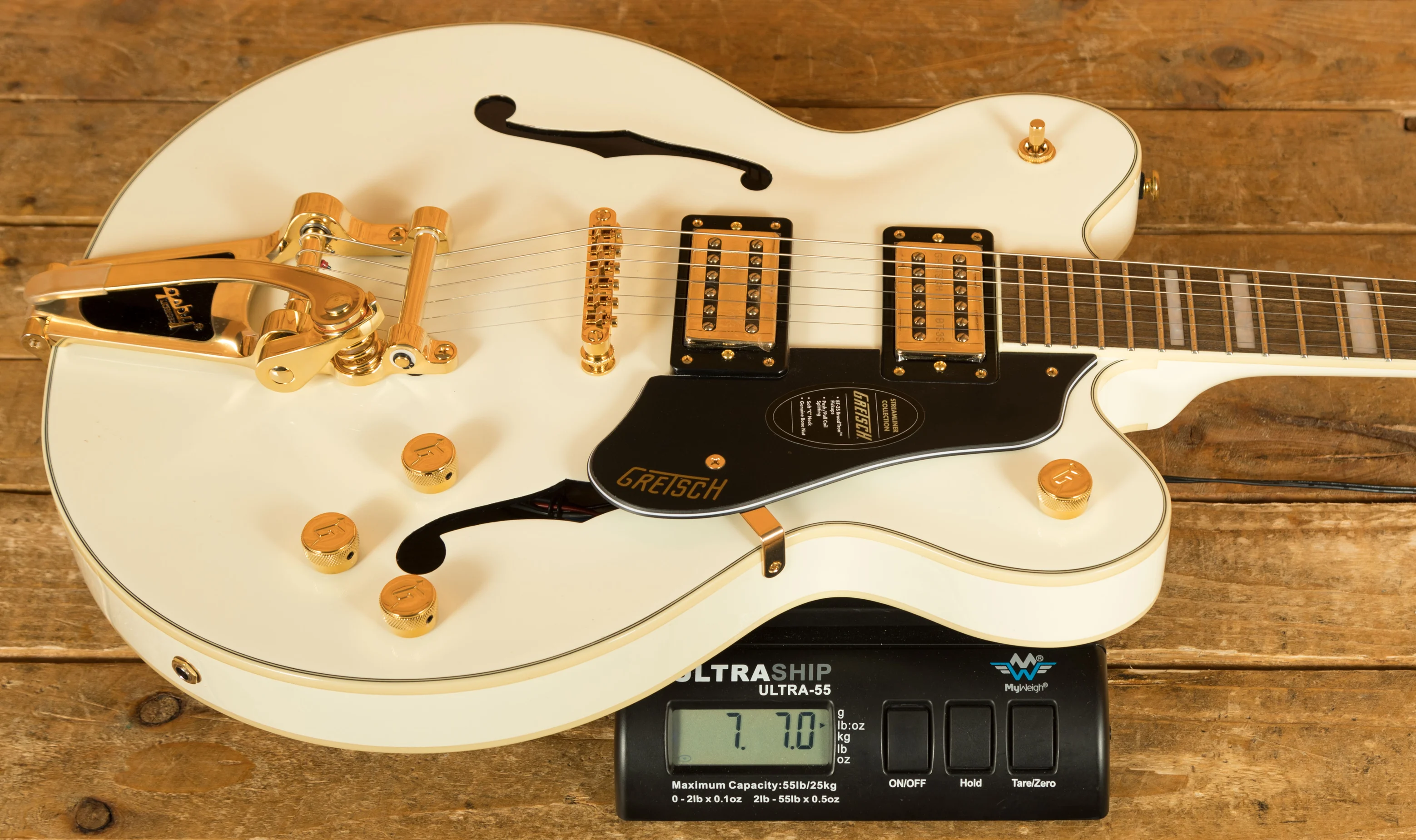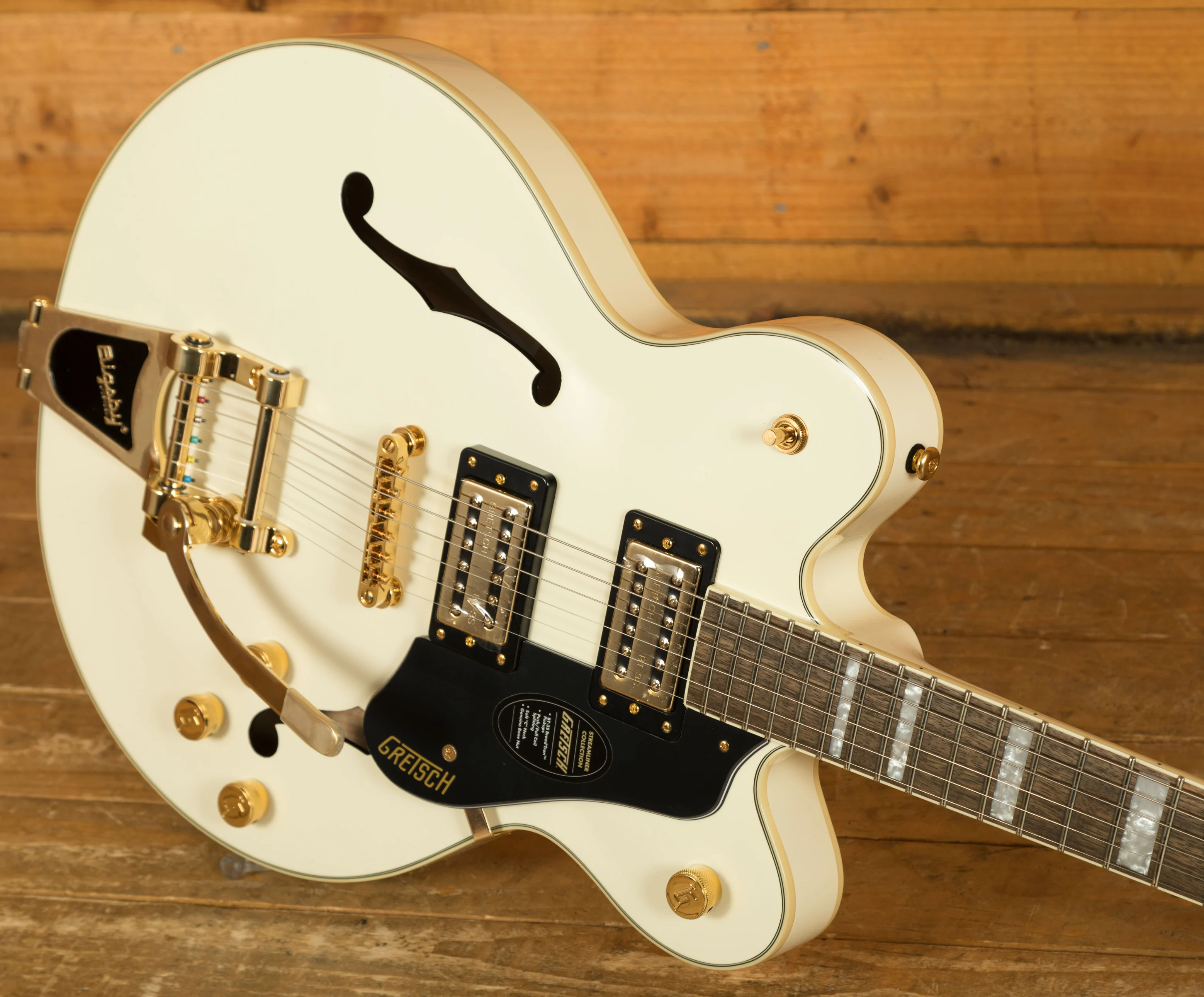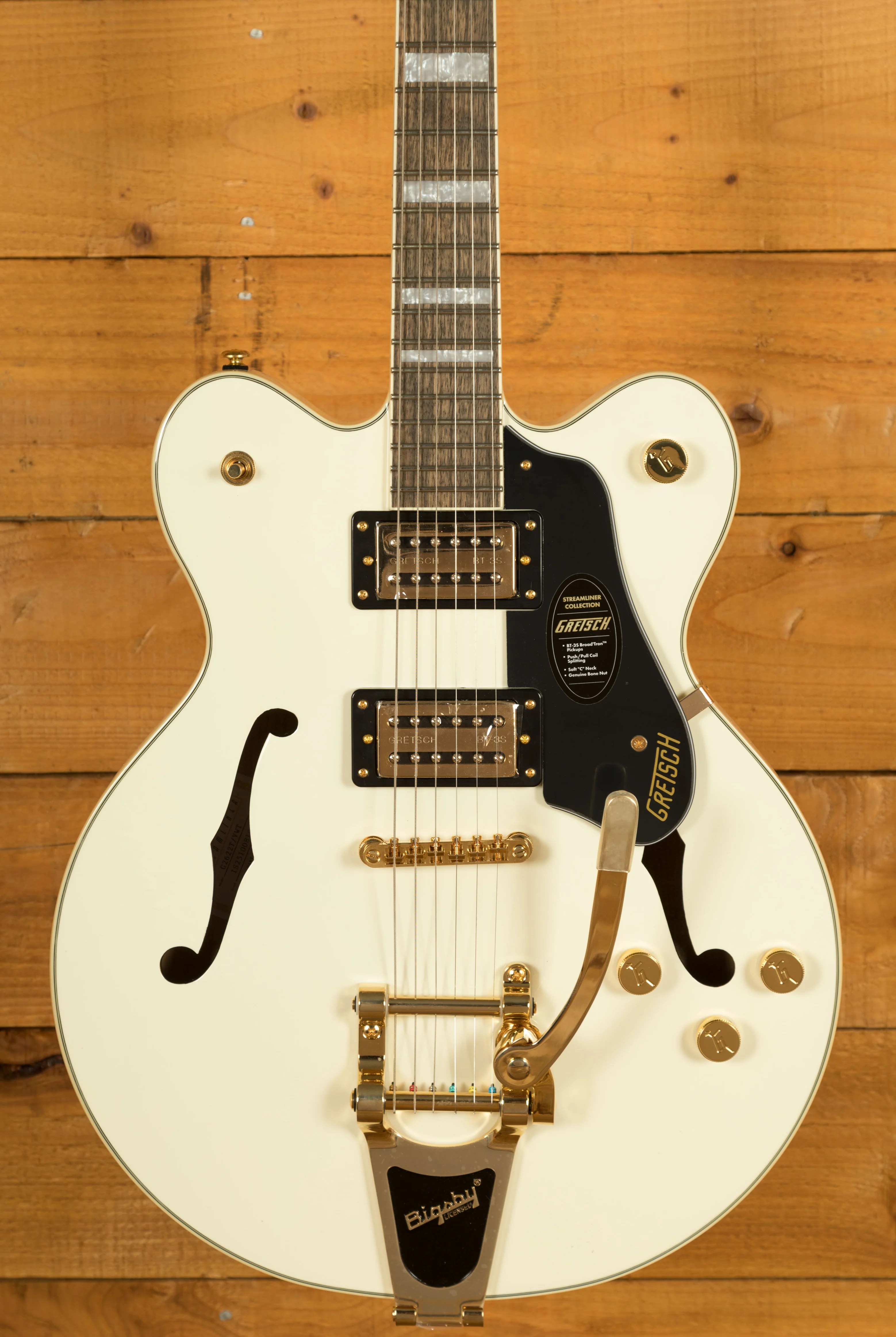The Limited Edition Gretsch G2622TG Streamliner Centre Block Double-Cut with Bigsby in Vintage White brings bold style, modern power and unmistakable Gretsch character together in a standout package. With its gleaming gold hardware, metal G-Arrow control knobs and pearloid Big Block inlays, this LTD model is built for players who want more presence, more performance and more volume, all while retaining the classic Streamliner feel.