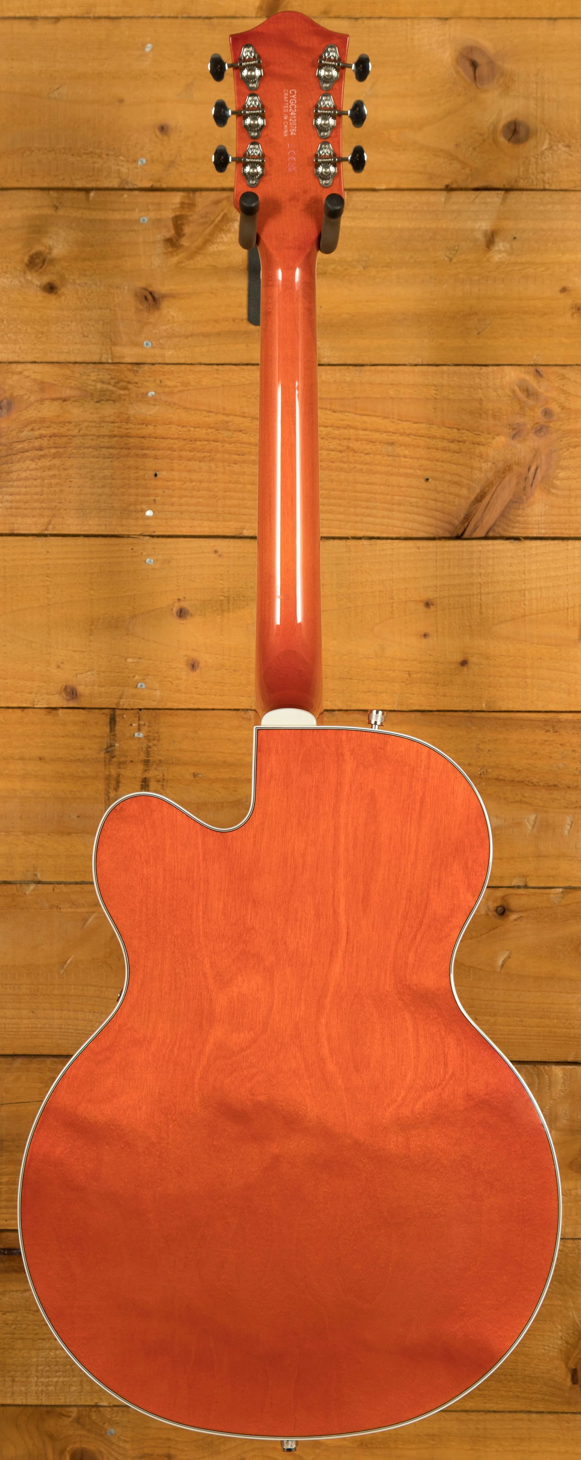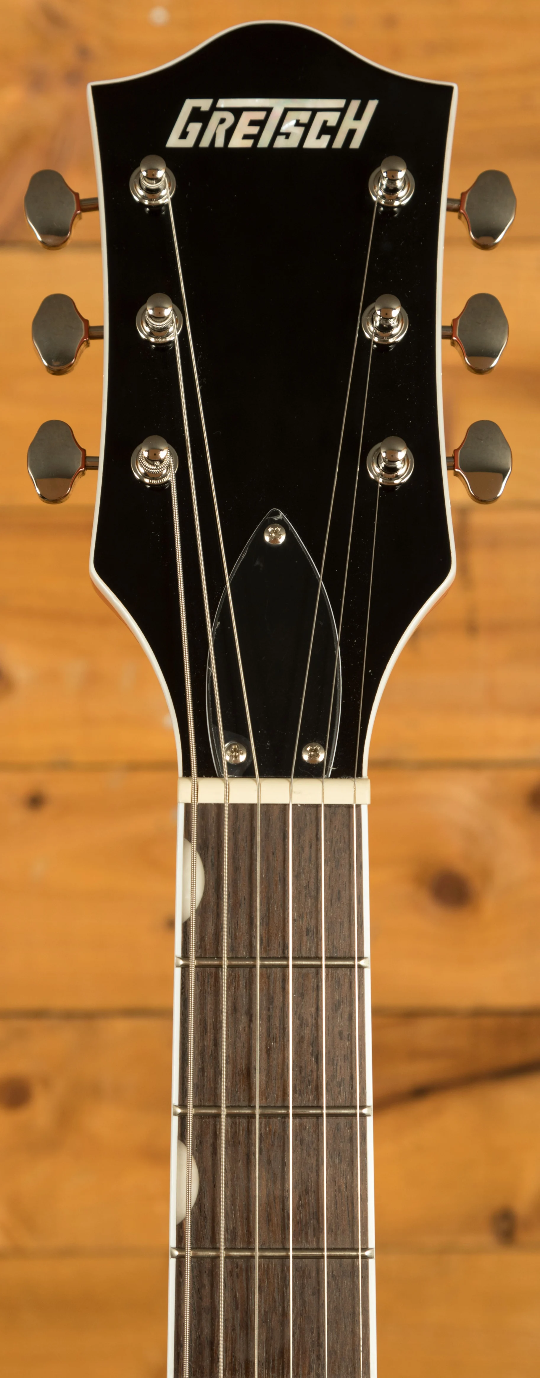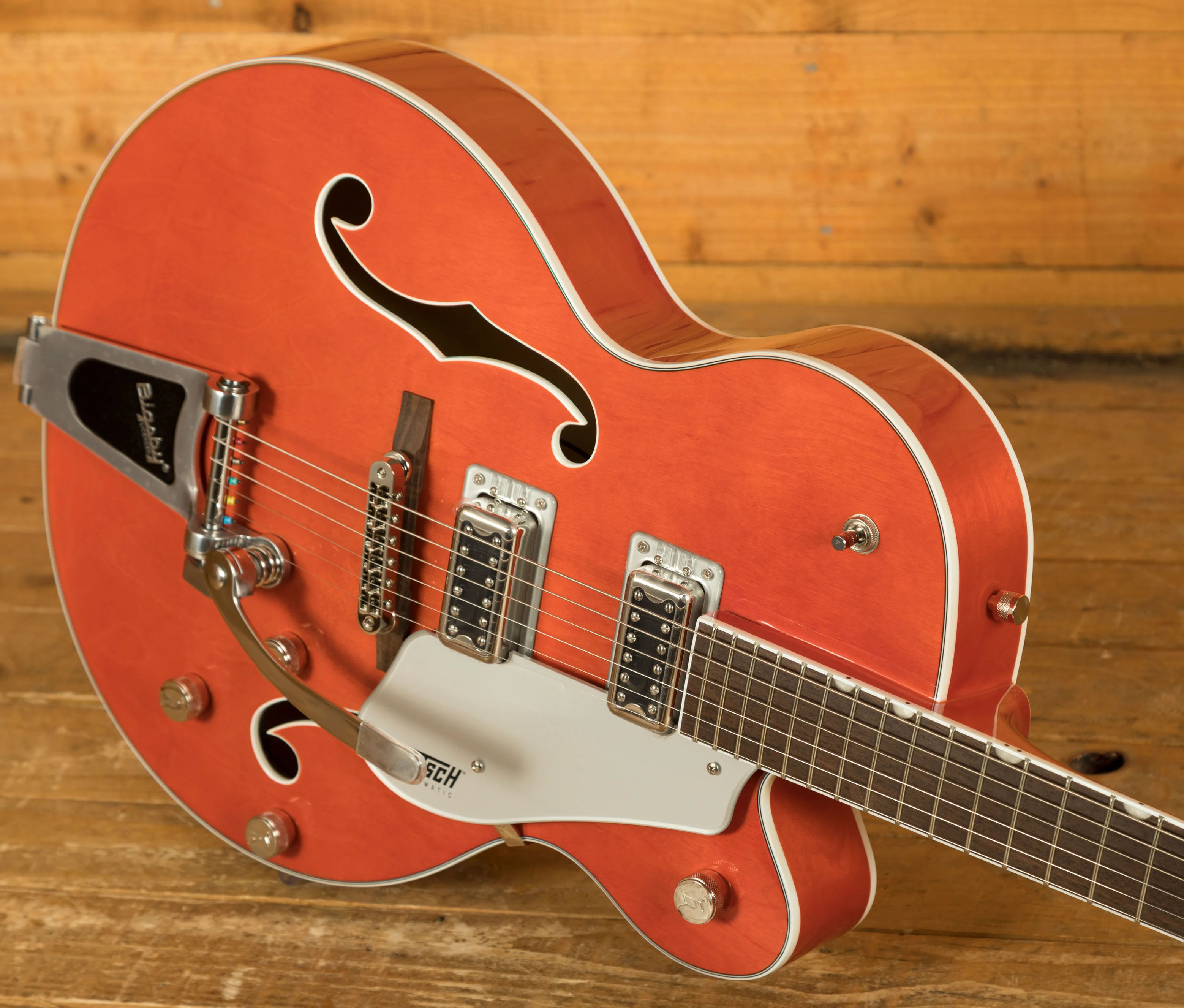 The G5420T features an innovative trestle block bracing system, which reduces unwanted feedback by increasing the rigidity and contact between the top and back of the body. This design results in faster attack, greater sustain, and more focused sound, providing enhanced clarity and note definition. The all-new FT-5E Filter'Tron pickups deliver a powerful, full-bodied punch, classic chime, and a heightened presence that makes the guitar stand out in any setting.