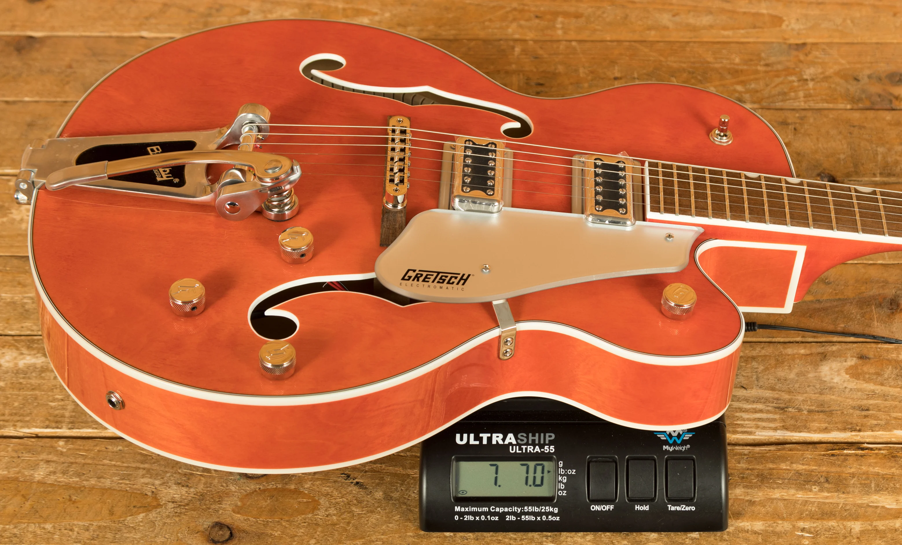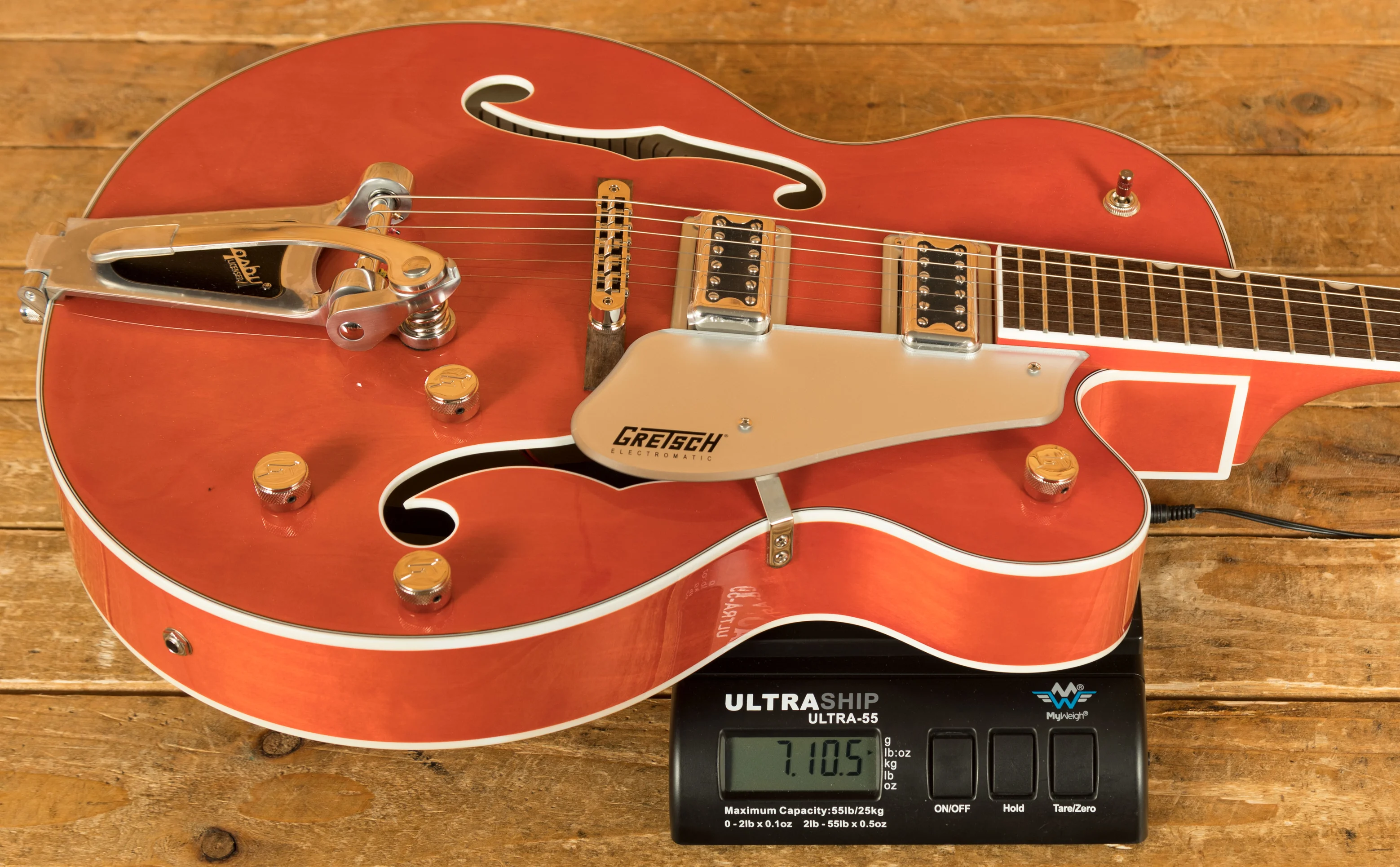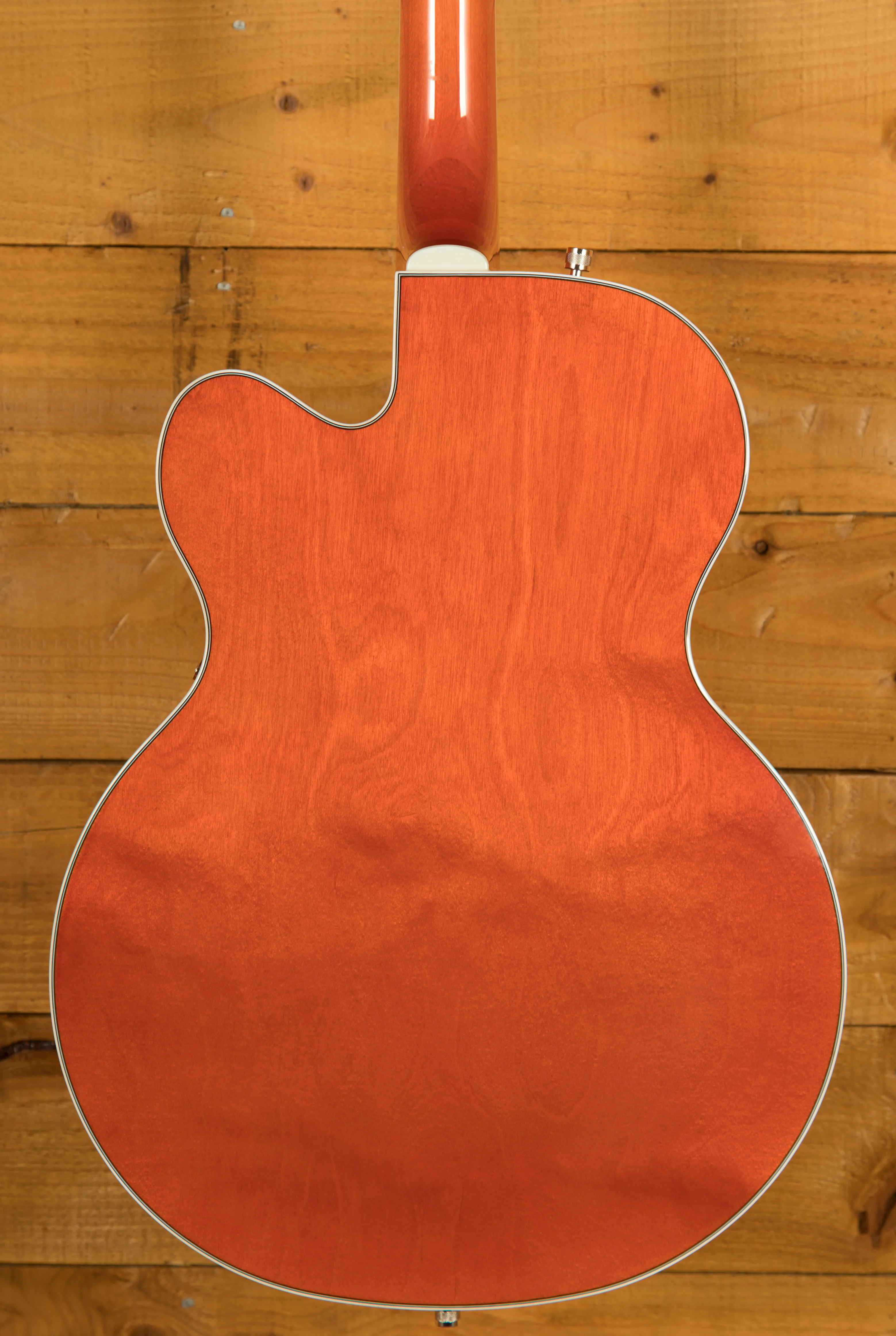 The G5420T features an innovative trestle block bracing system, which reduces unwanted feedback by increasing the rigidity and contact between the top and back of the body. This design results in faster attack, greater sustain, and more focused sound, providing enhanced clarity and note definition. The all-new FT-5E Filter'Tron pickups deliver a powerful, full-bodied punch, classic chime, and a heightened presence that makes the guitar stand out in any setting.