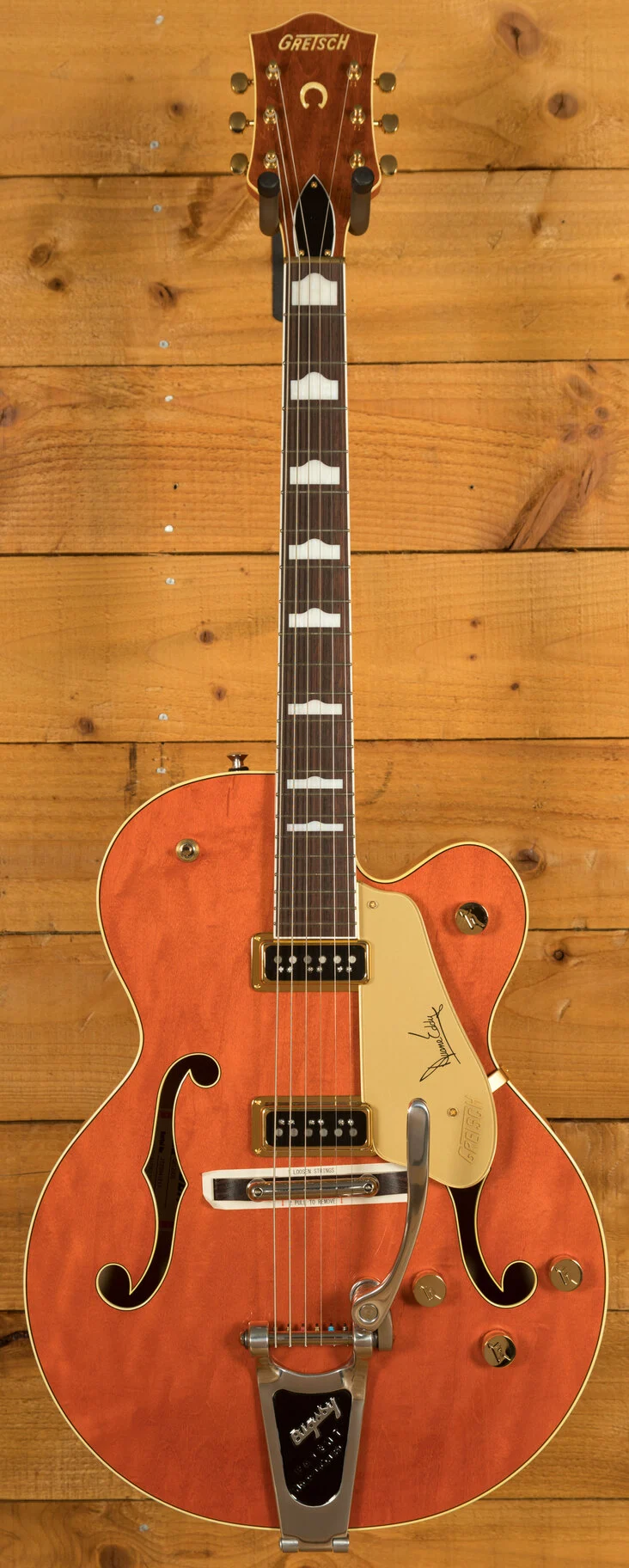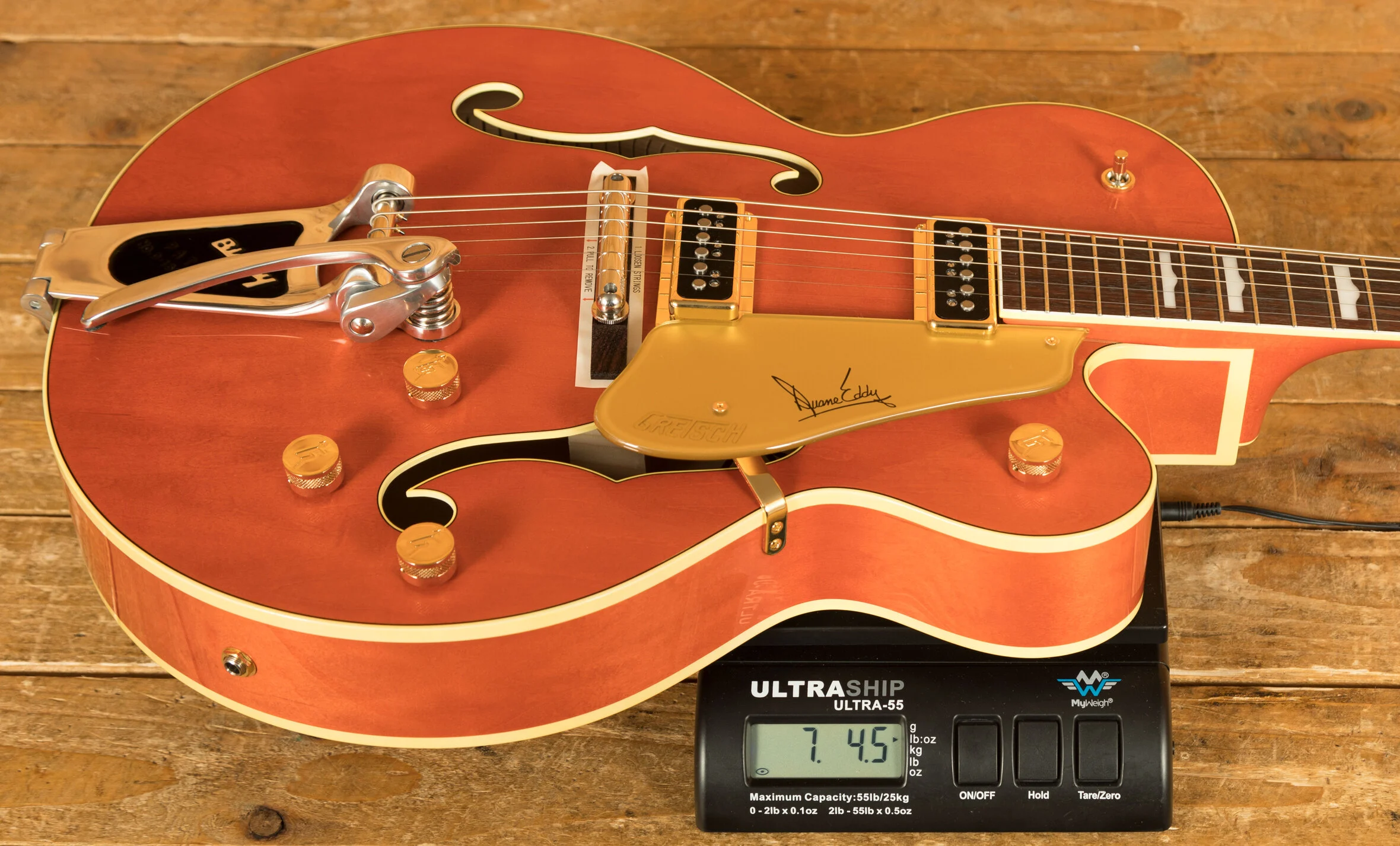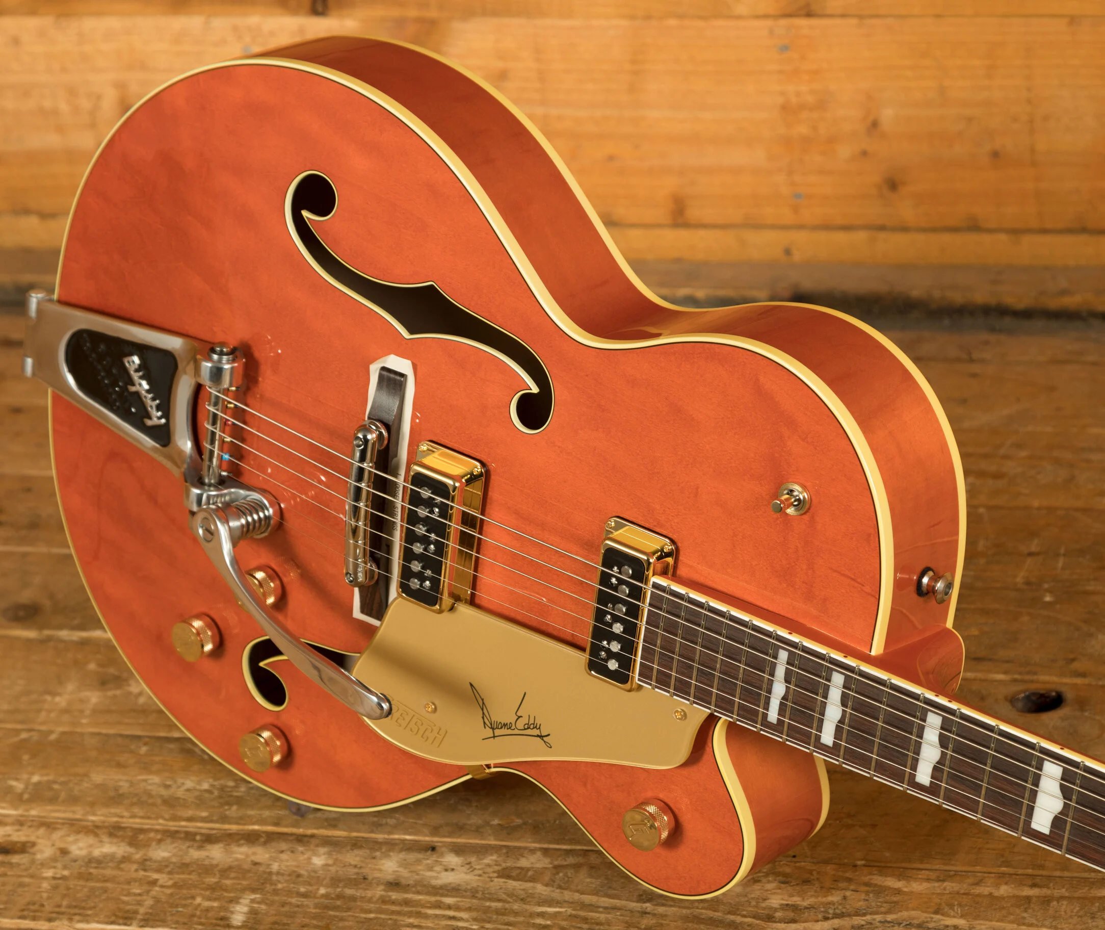 Introducing "The King of Twang!" Immerse yourself in the iconic sound of rock and roll with the Duane Eddy Gretsch signature model guitar. As a Rock and Roll Hall of Fame inductee and Grammy Award winner, Duane Eddy's legendary tone is captured flawlessly in this instrument. Featuring twin DynaSonic single-coil pickups, the guitar delivers a rich and dynamic sound that will transport you to the golden era of rock. The Tru-Arc "rocking" bar bridge ensures precise intonation and optimal sustain, while the lacquer finish adds a touch of elegance. The trestle bracing and special neck and headstock profile faithfully replicate Duane's original G6120, which resonated with countless chart-topping hits. With its hollow body construction, stunning Desert Sunrise colour, and impeccable craft skills, this guitar is a true masterpiece. Unleash your inner rock and roll spirit and experience the unmatched legacy of Duane Eddy with the Gretsch signature model guitar.
