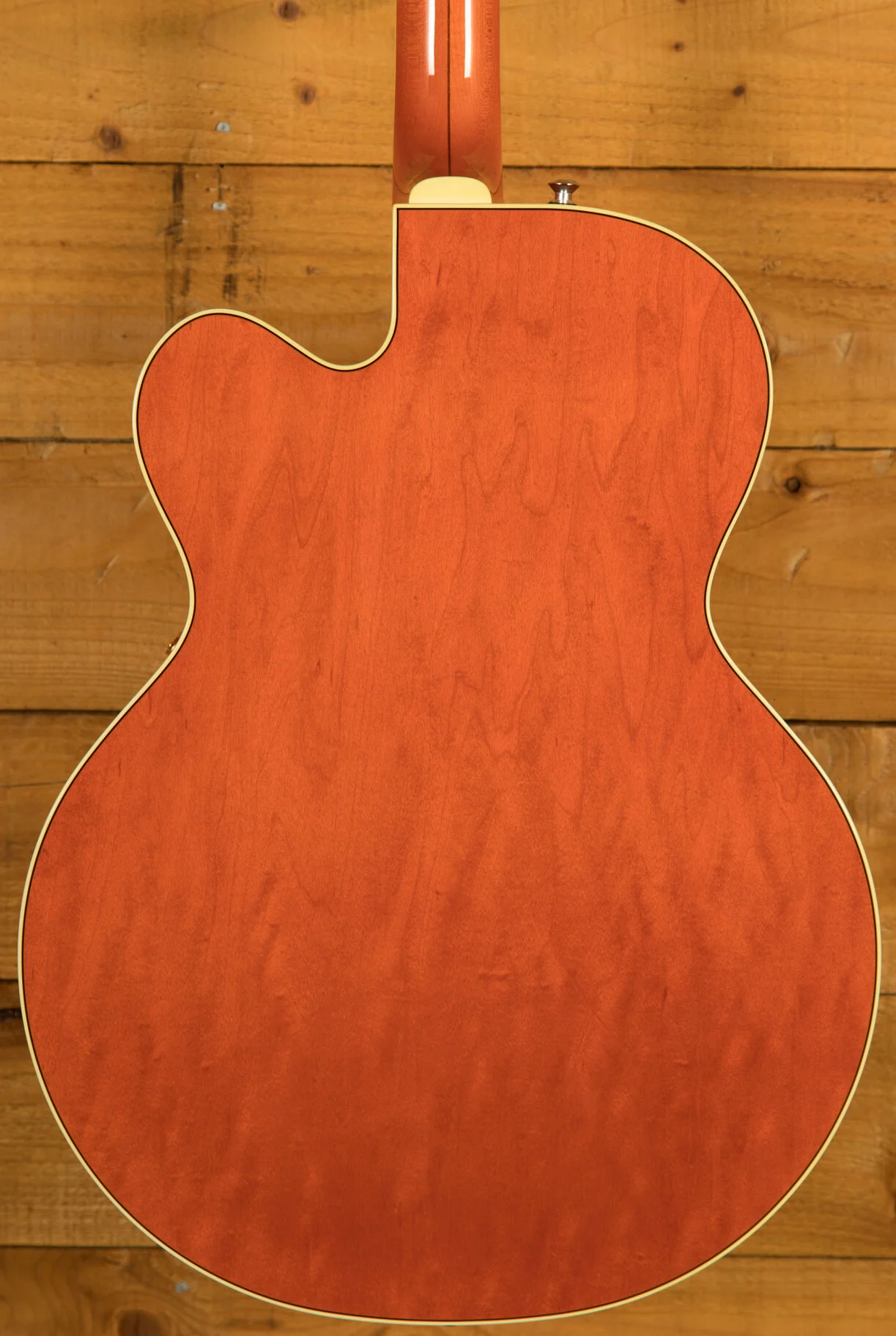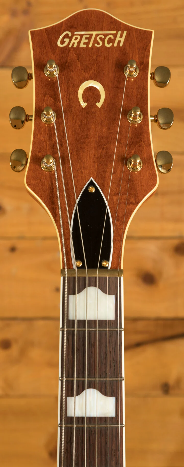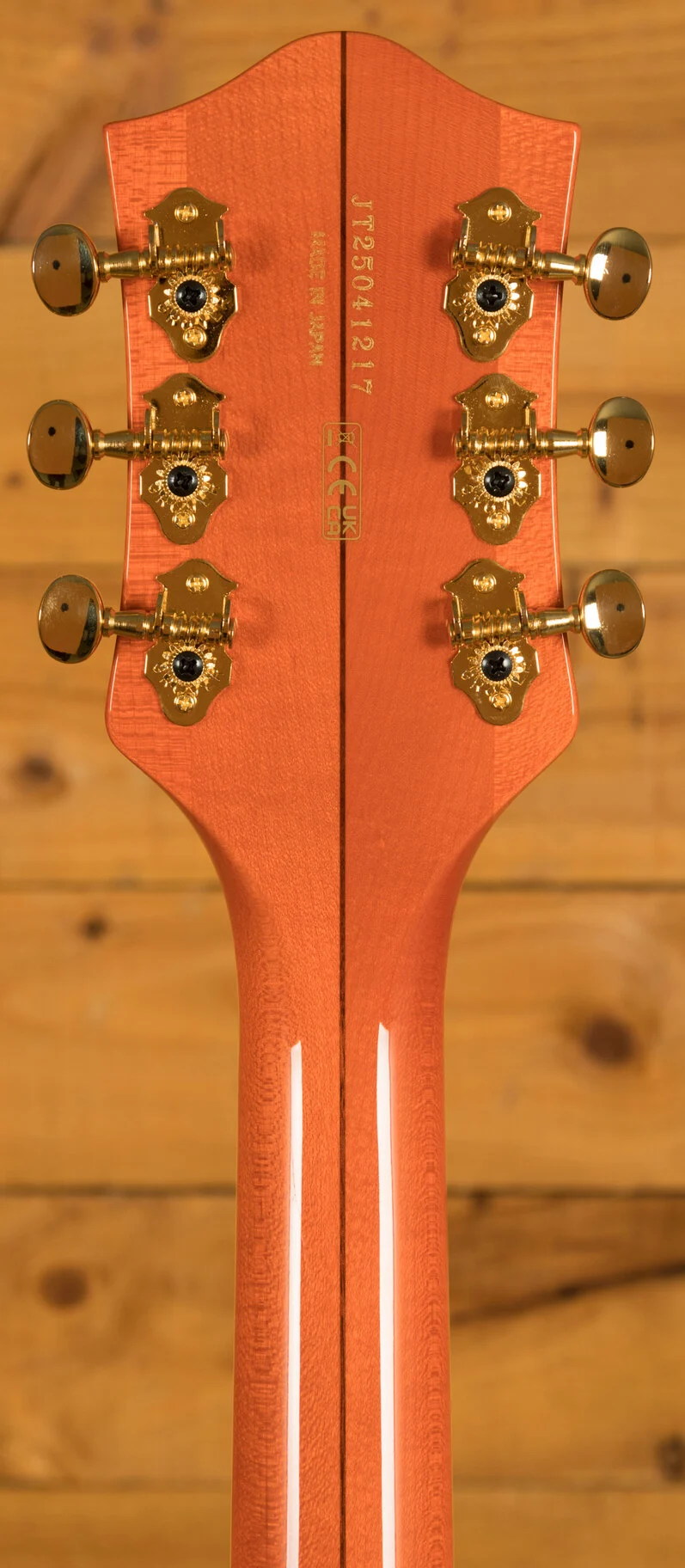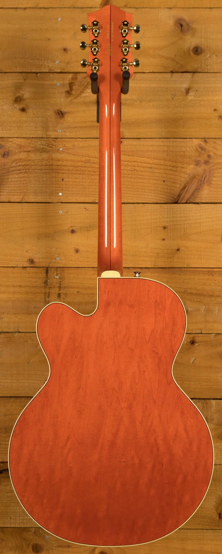 Introducing "The King of Twang!" Immerse yourself in the iconic sound of rock and roll with the Duane Eddy Gretsch signature model guitar. As a Rock and Roll Hall of Fame inductee and Grammy Award winner, Duane Eddy's legendary tone is captured flawlessly in this instrument. Featuring twin DynaSonic single-coil pickups, the guitar delivers a rich and dynamic sound that will transport you to the golden era of rock. The Tru-Arc "rocking" bar bridge ensures precise intonation and optimal sustain, while the lacquer finish adds a touch of elegance. The trestle bracing and special neck and headstock profile faithfully replicate Duane's original G6120, which resonated with countless chart-topping hits. With its hollow body construction, stunning Desert Sunrise colour, and impeccable craft skills, this guitar is a true masterpiece. Unleash your inner rock and roll spirit and experience the unmatched legacy of Duane Eddy with the Gretsch signature model guitar.