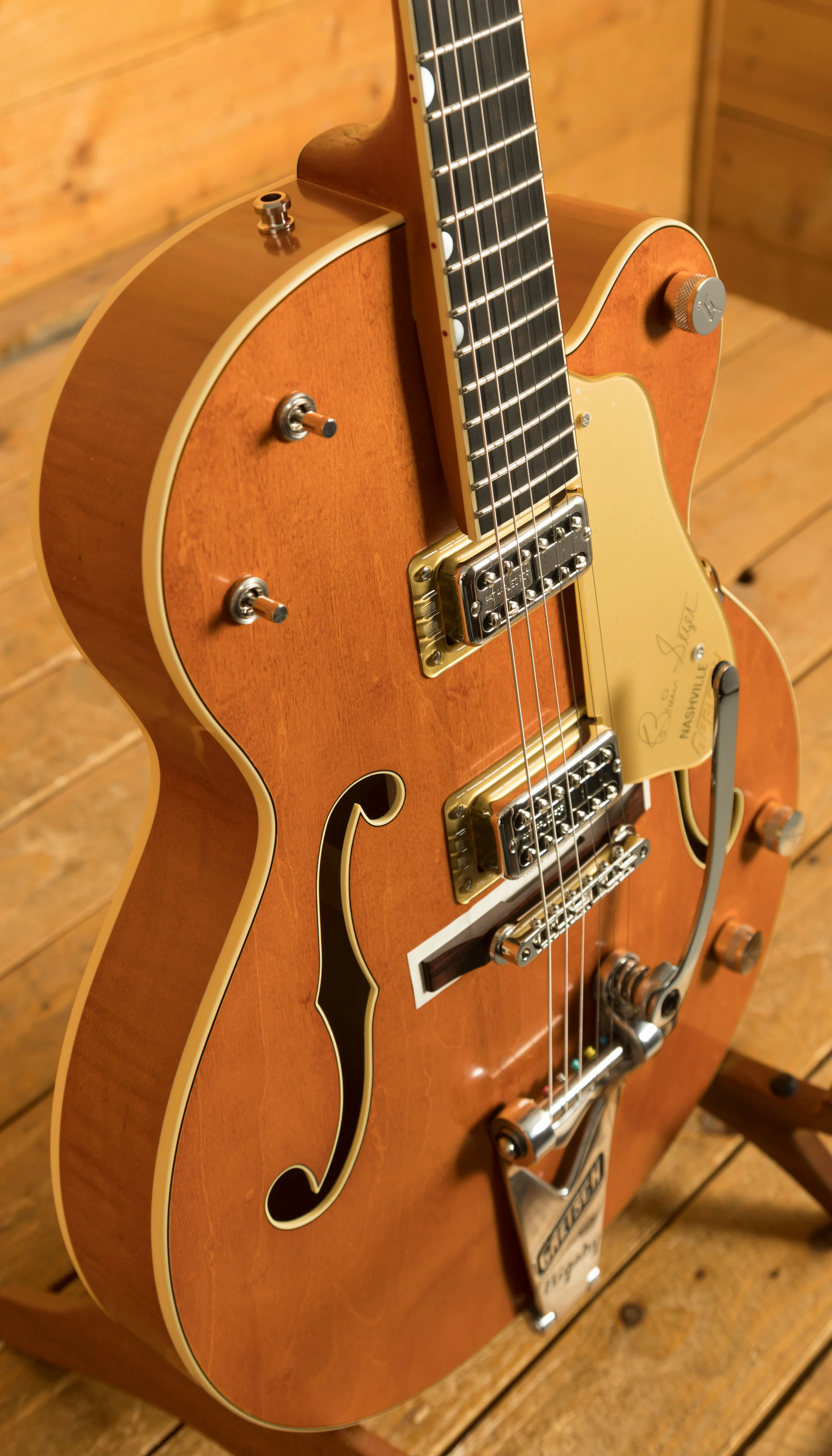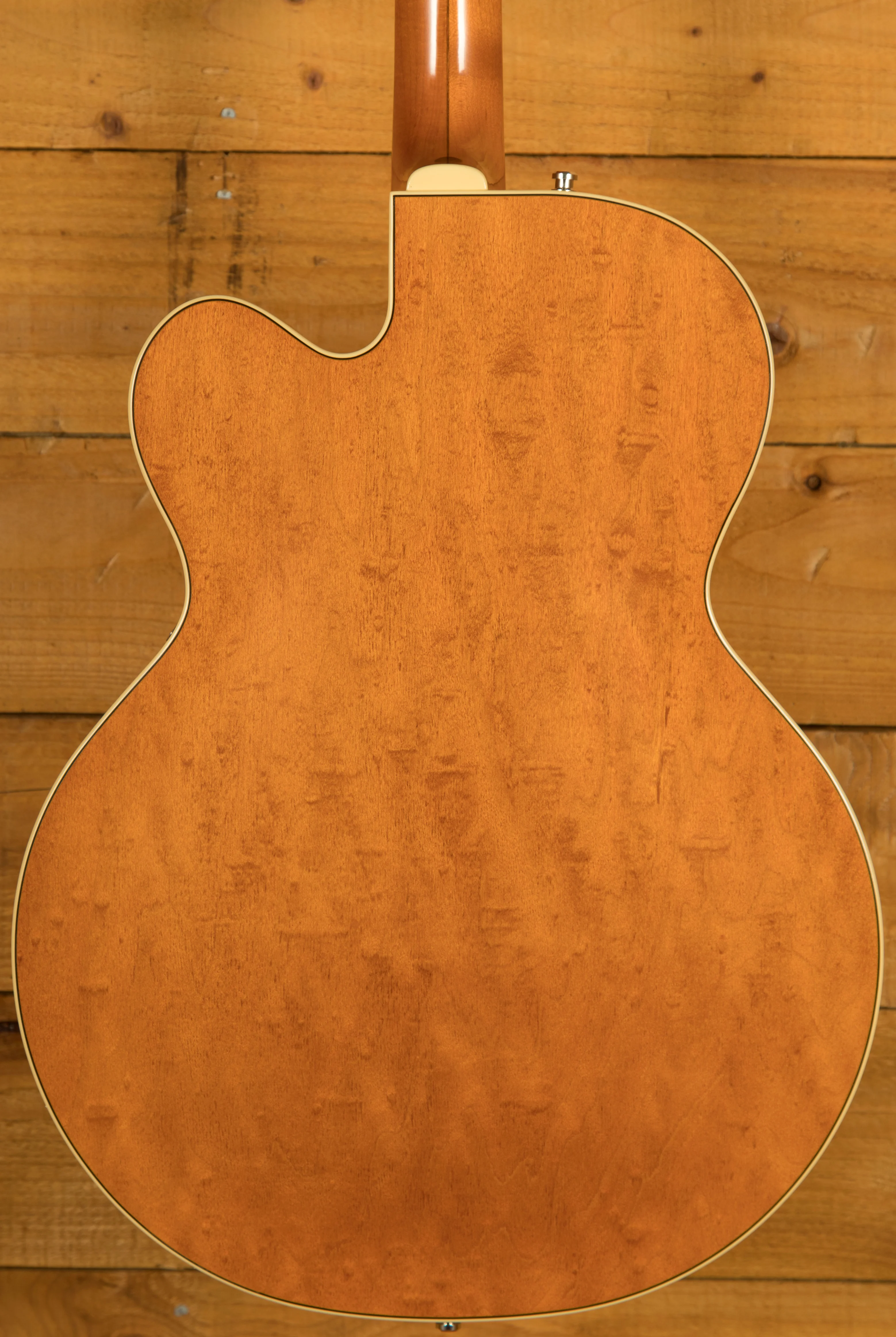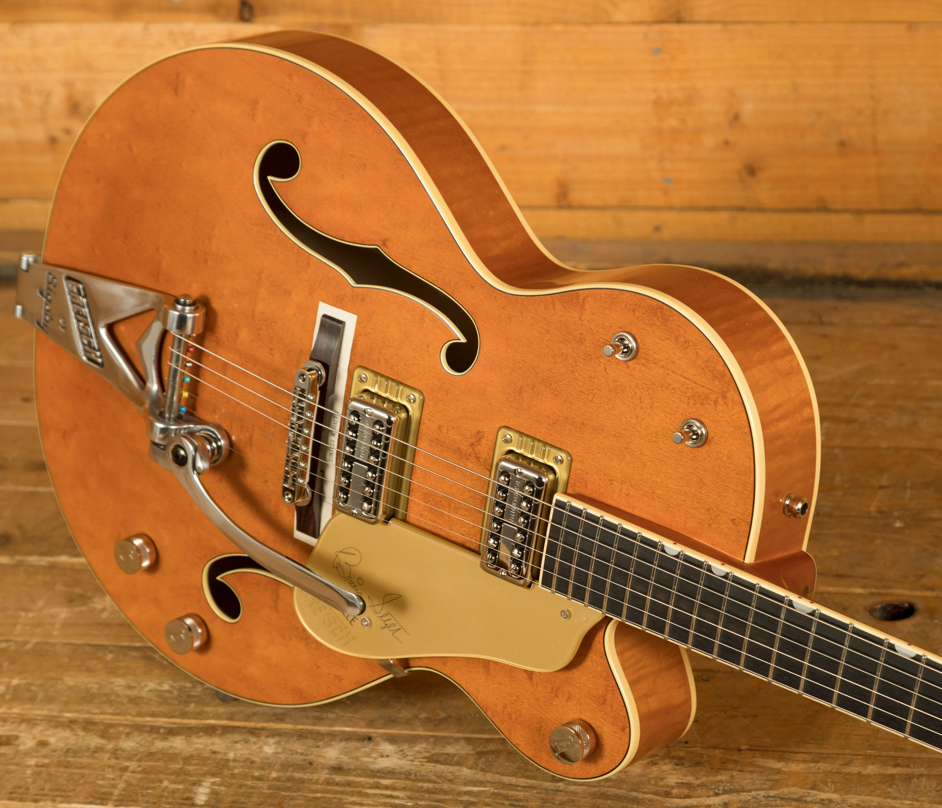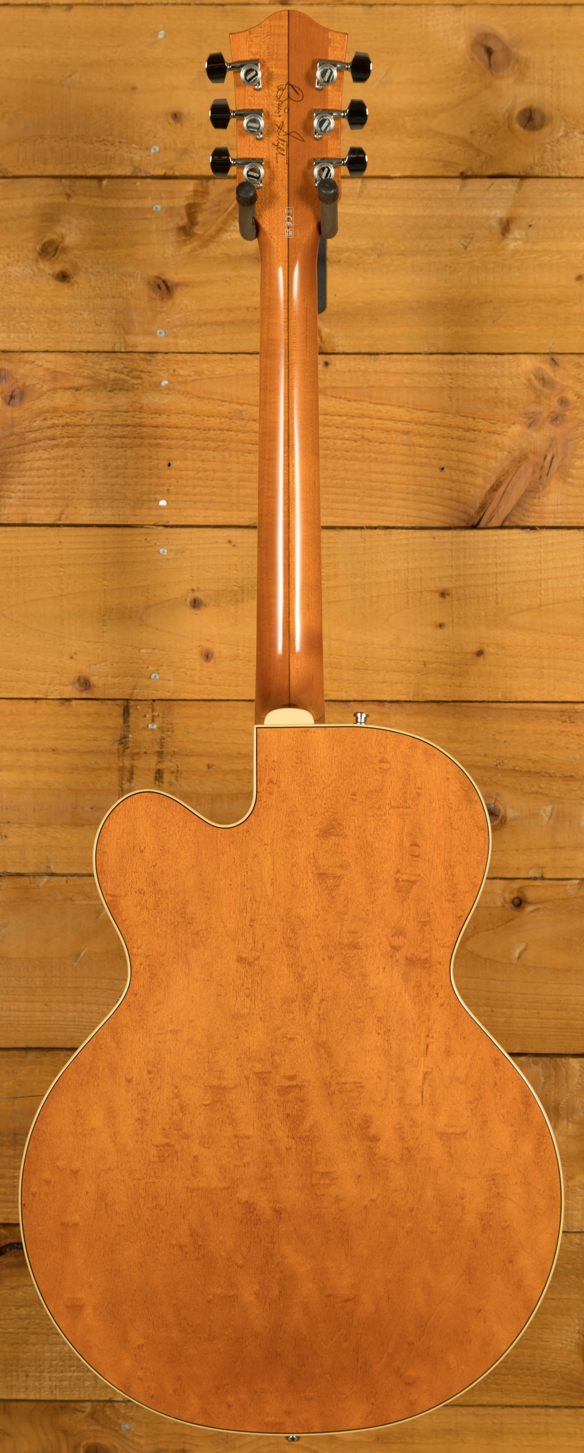 The "Smoke" features a 2.5" single-cutaway hollow body constructed with an arched laminated maple top and 1959 trestle bracing. These features, combined with oversized F-holes, contribute to improved sonic projection, making the guitar acoustically resonant and suitable for stage use. The semi-gloss "Smoke Orange" lacquer finish, along with rolled fingerboard and body edges, provides a comfortable, broken-in feel reminiscent of vintage G6120s from the 1950s.