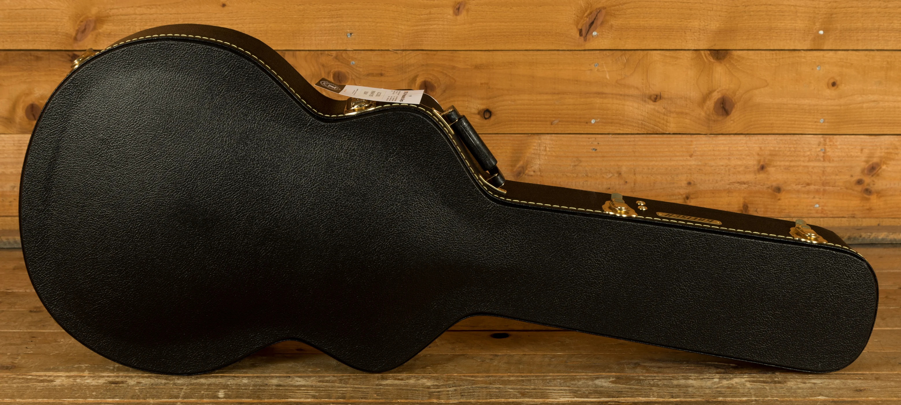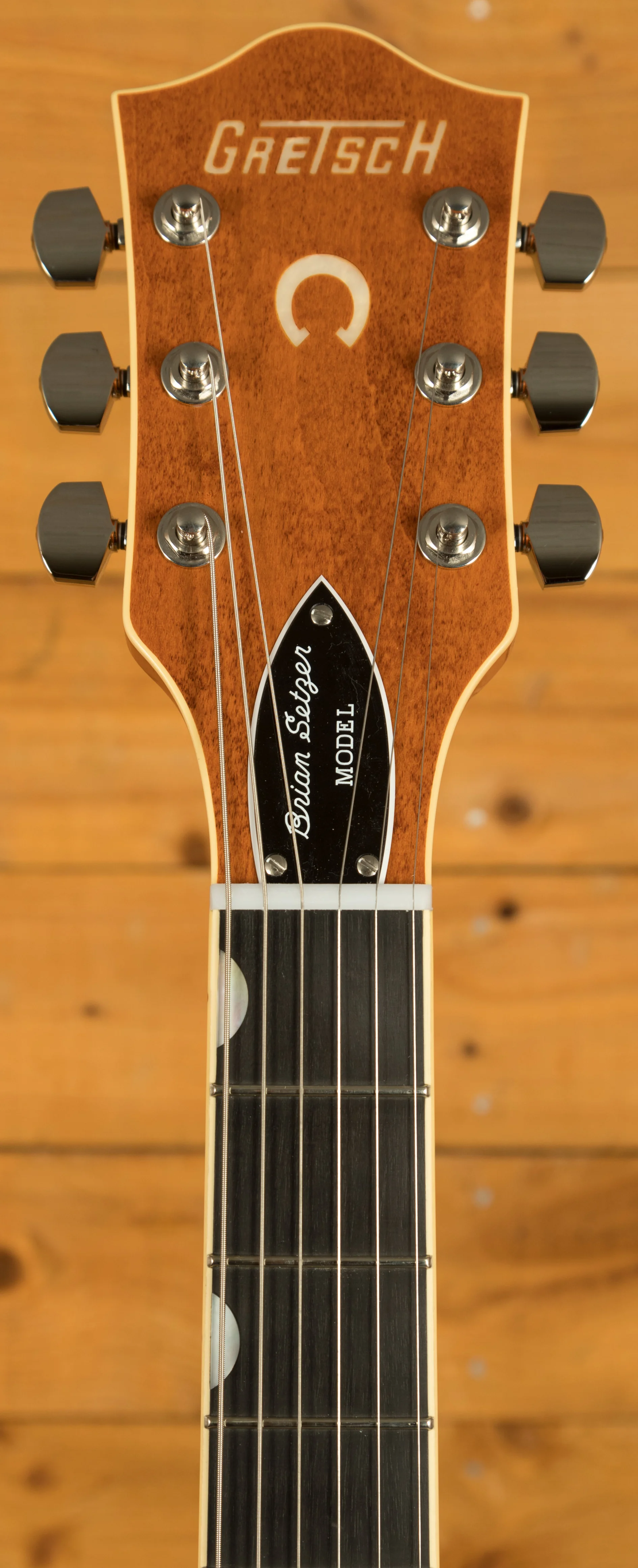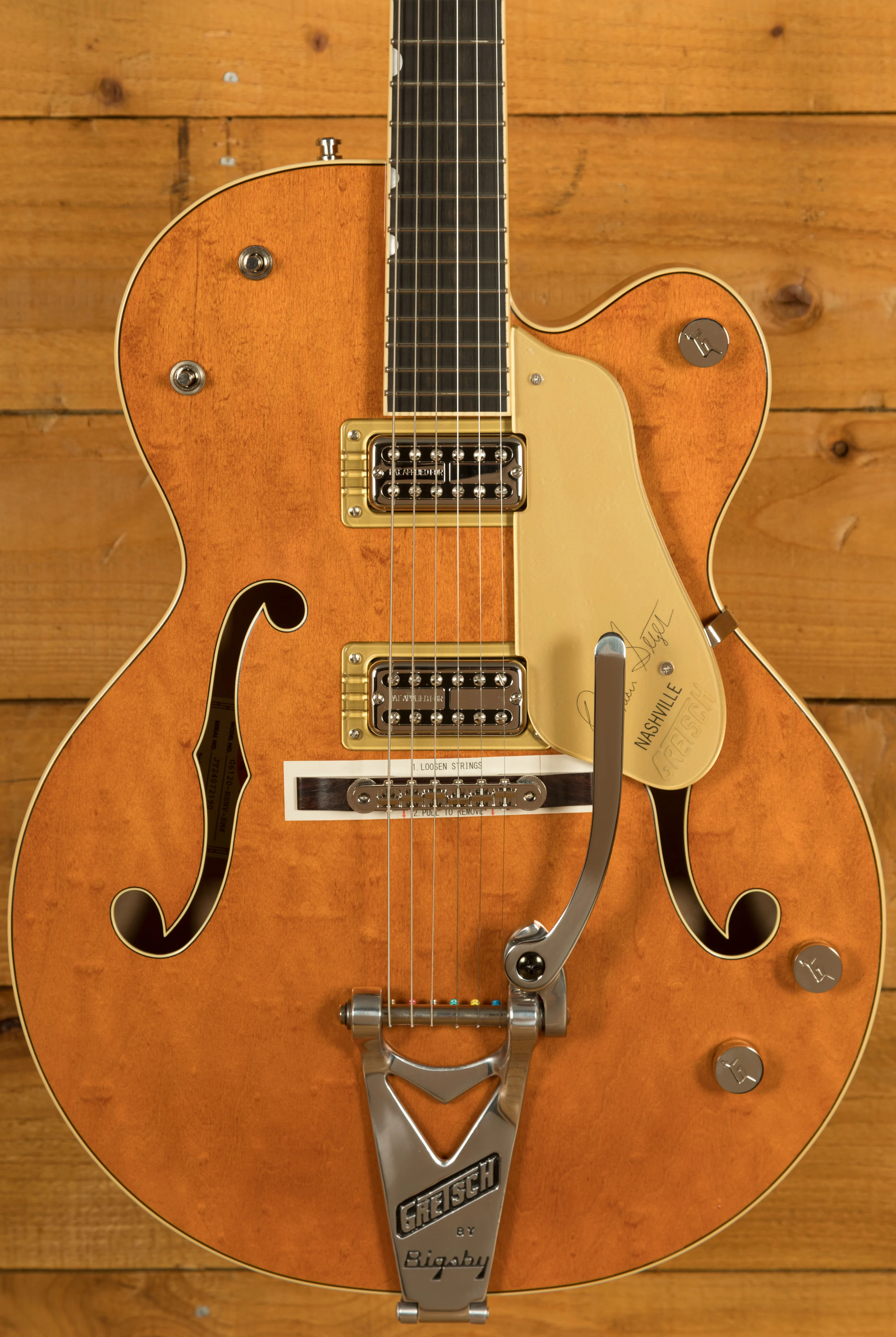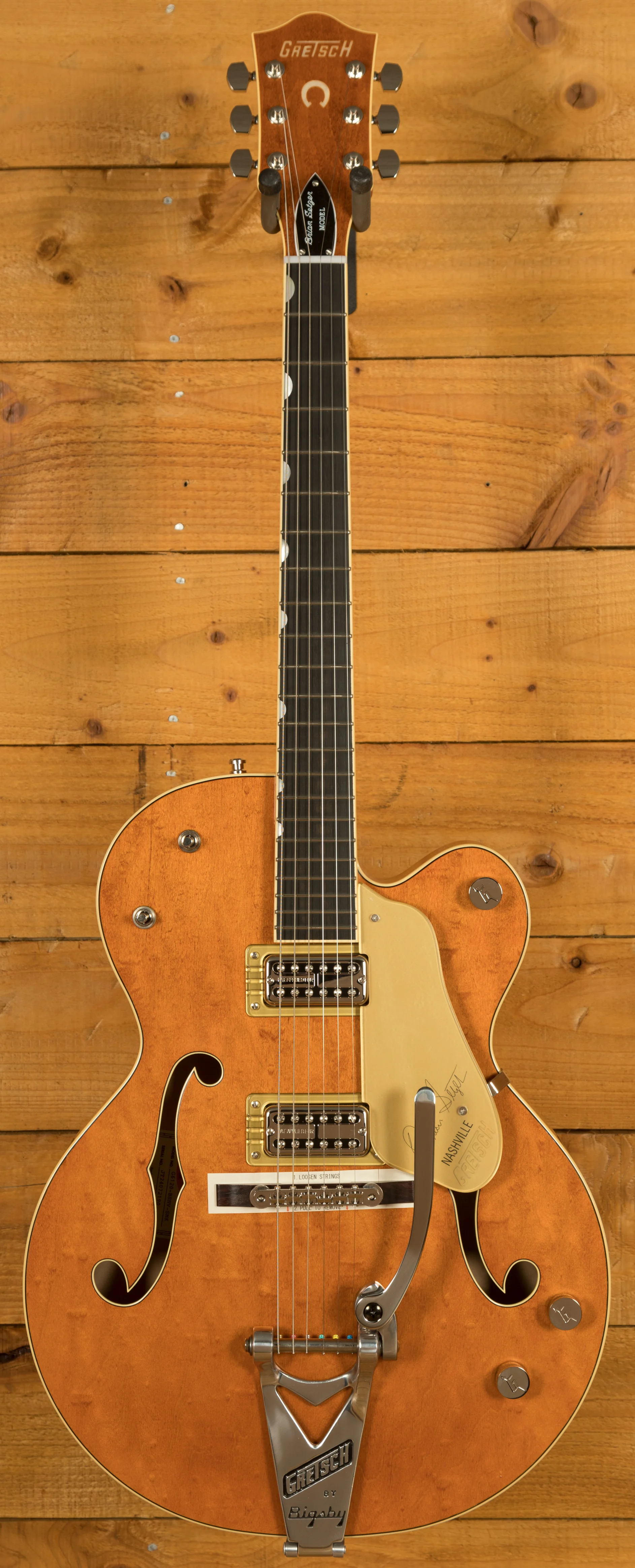 The "Smoke" features a 2.5" single-cutaway hollow body constructed with an arched laminated maple top and 1959 trestle bracing. These features, combined with oversized F-holes, contribute to improved sonic projection, making the guitar acoustically resonant and suitable for stage use. The semi-gloss "Smoke Orange" lacquer finish, along with rolled fingerboard and body edges, provides a comfortable, broken-in feel reminiscent of vintage G6120s from the 1950s.