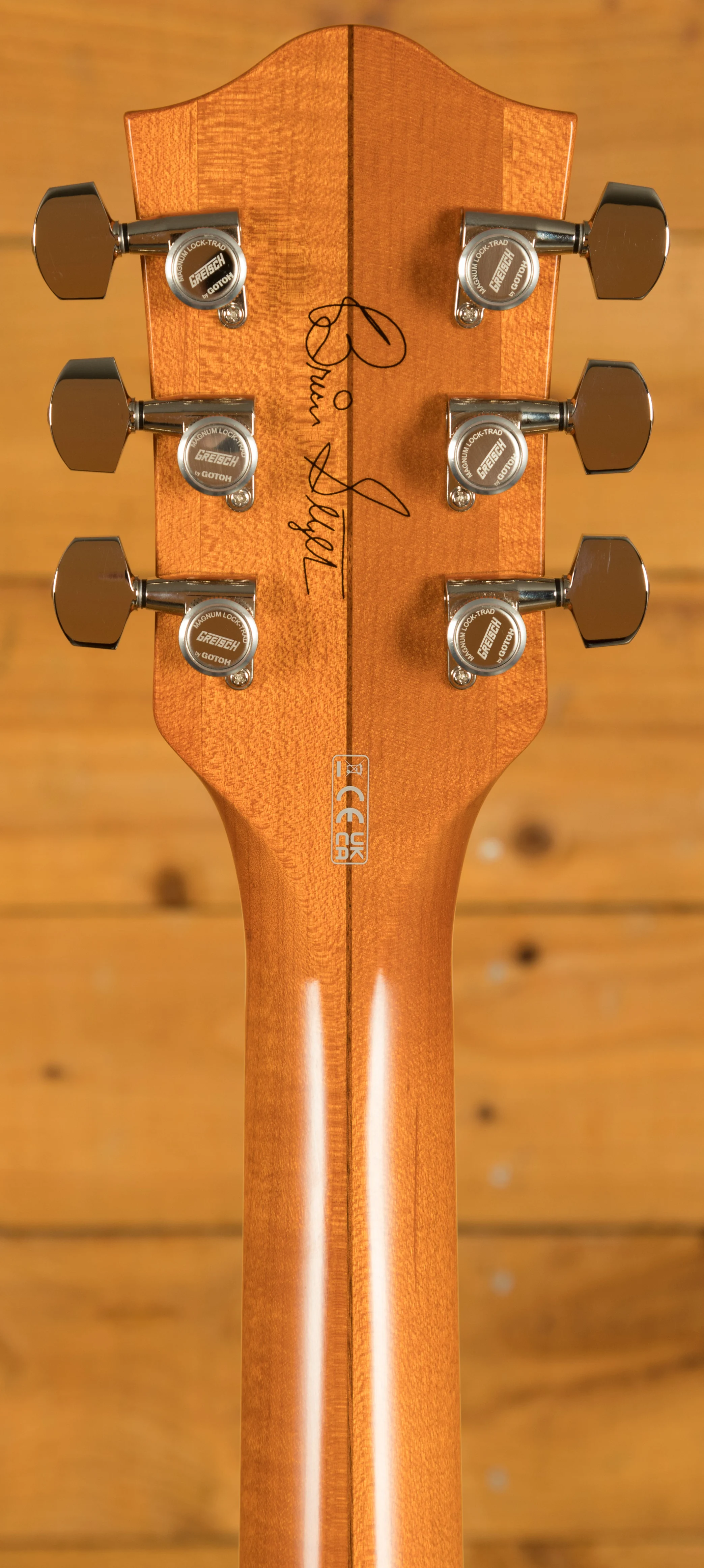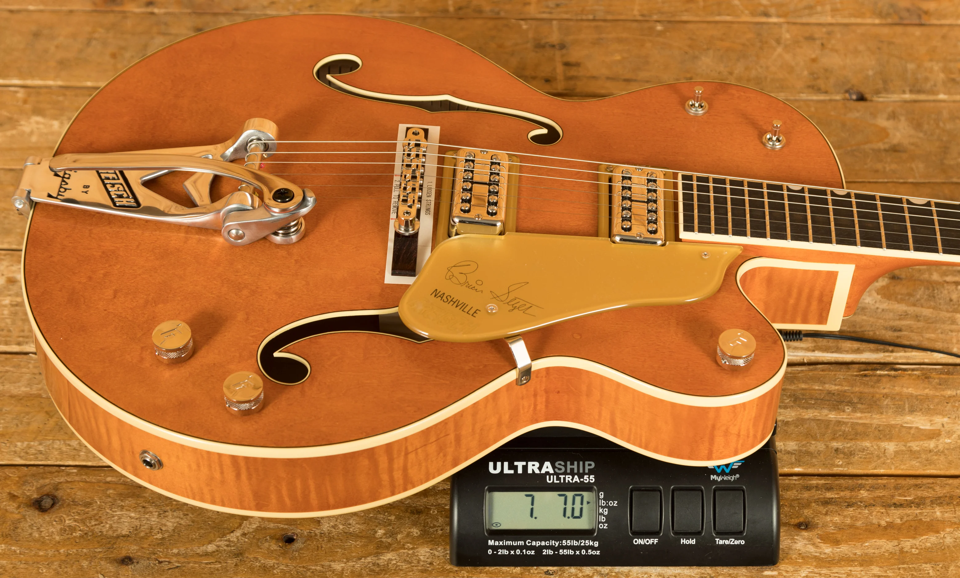 The Gretsch G6120T-BSSMK Brian Setzer Signature Nashville Hollow Body '59 "Smoke" with Bigsby, Ebony Fingerboard, Smoke Orange, is a meticulously crafted instrument designed to replicate Brian Setzer's main stage guitar. This guitar pays homage to a pivotal figure in rockabilly and swing music, Brian Setzer, whose career spans from the Stray Cats to the Brian Setzer Orchestra. This signature model embodies both the vintage aesthetics and the performance enhancements that Setzer has incorporated into his instruments over the years.