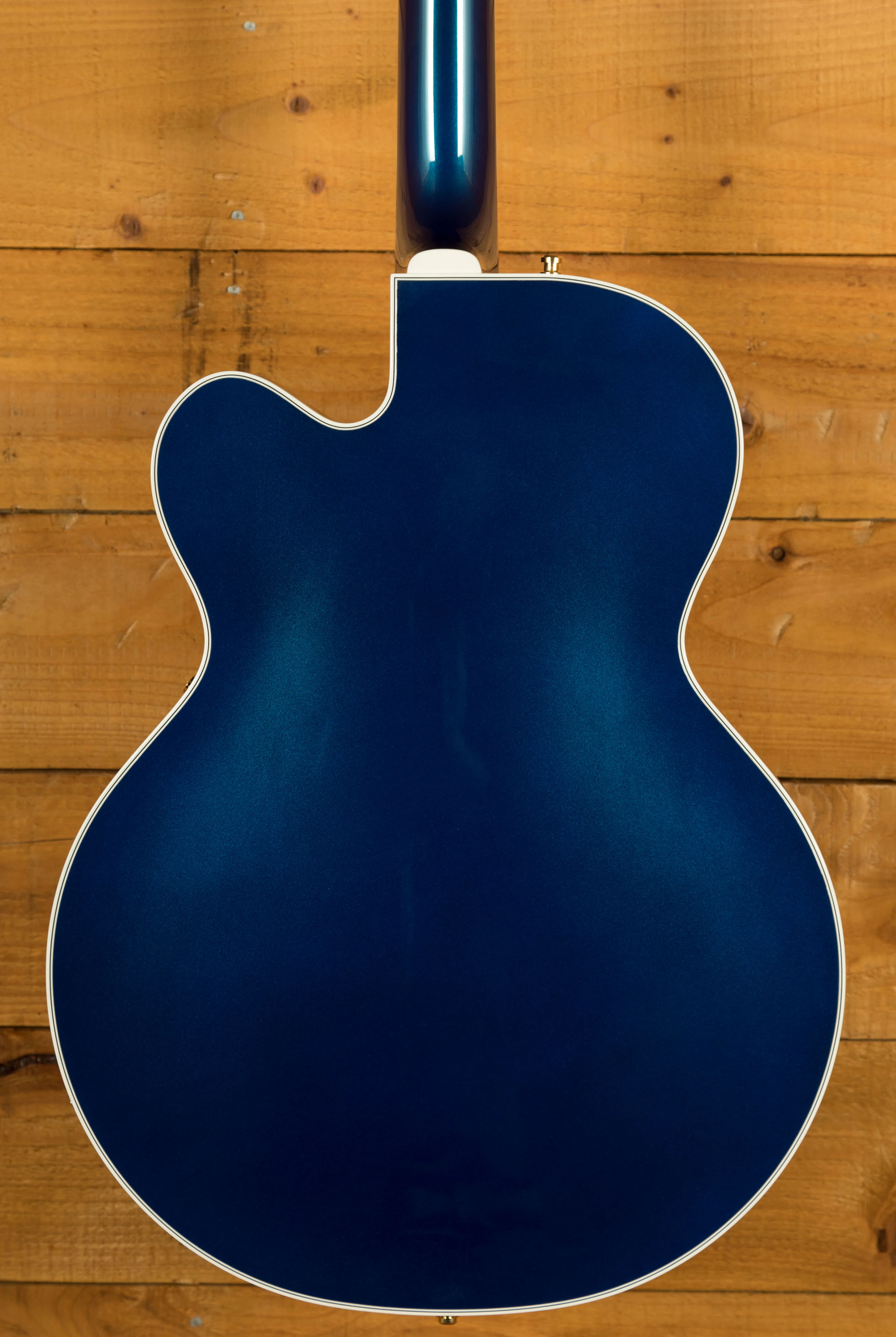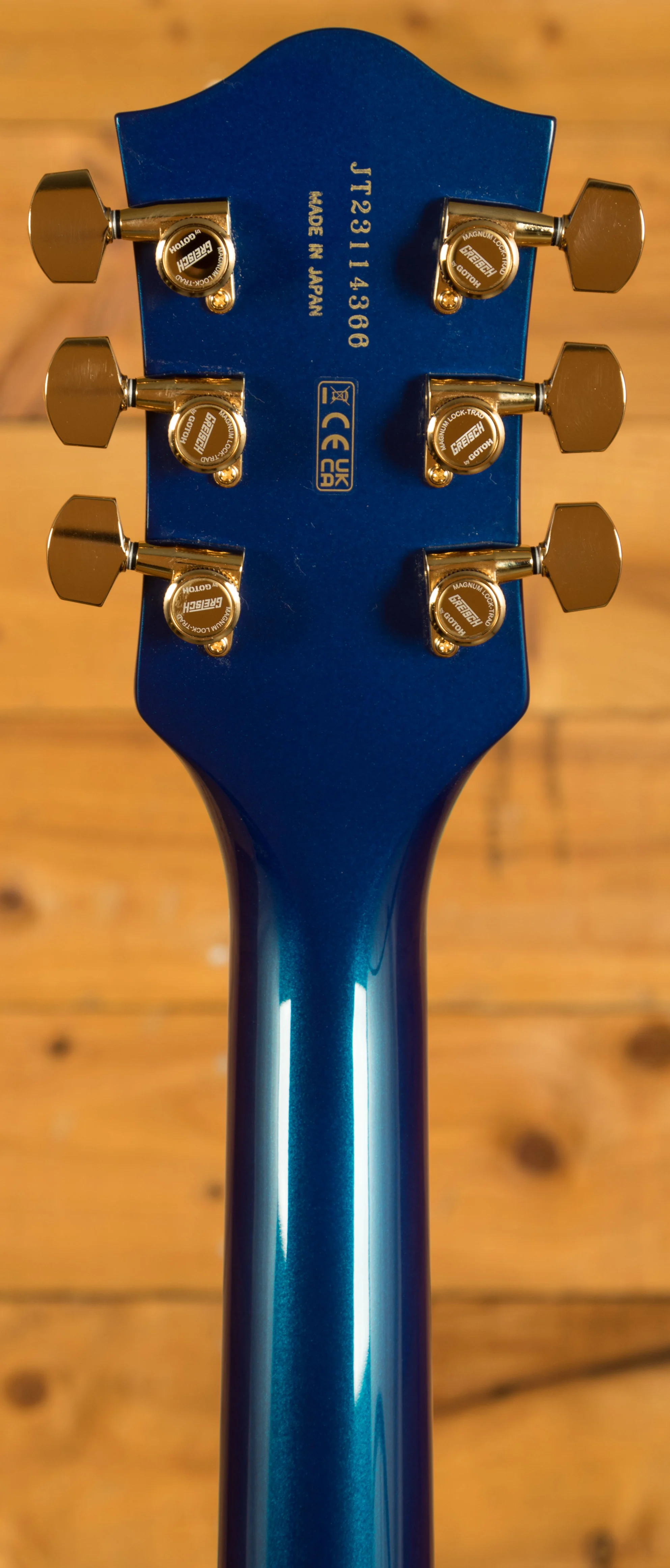 The Maple body is finished in an awesome Azure Metallic, and with the delicious Gold hardware, it looks every bit the classic Gretsch. It is incredibly comfortable and feels great against the body.
