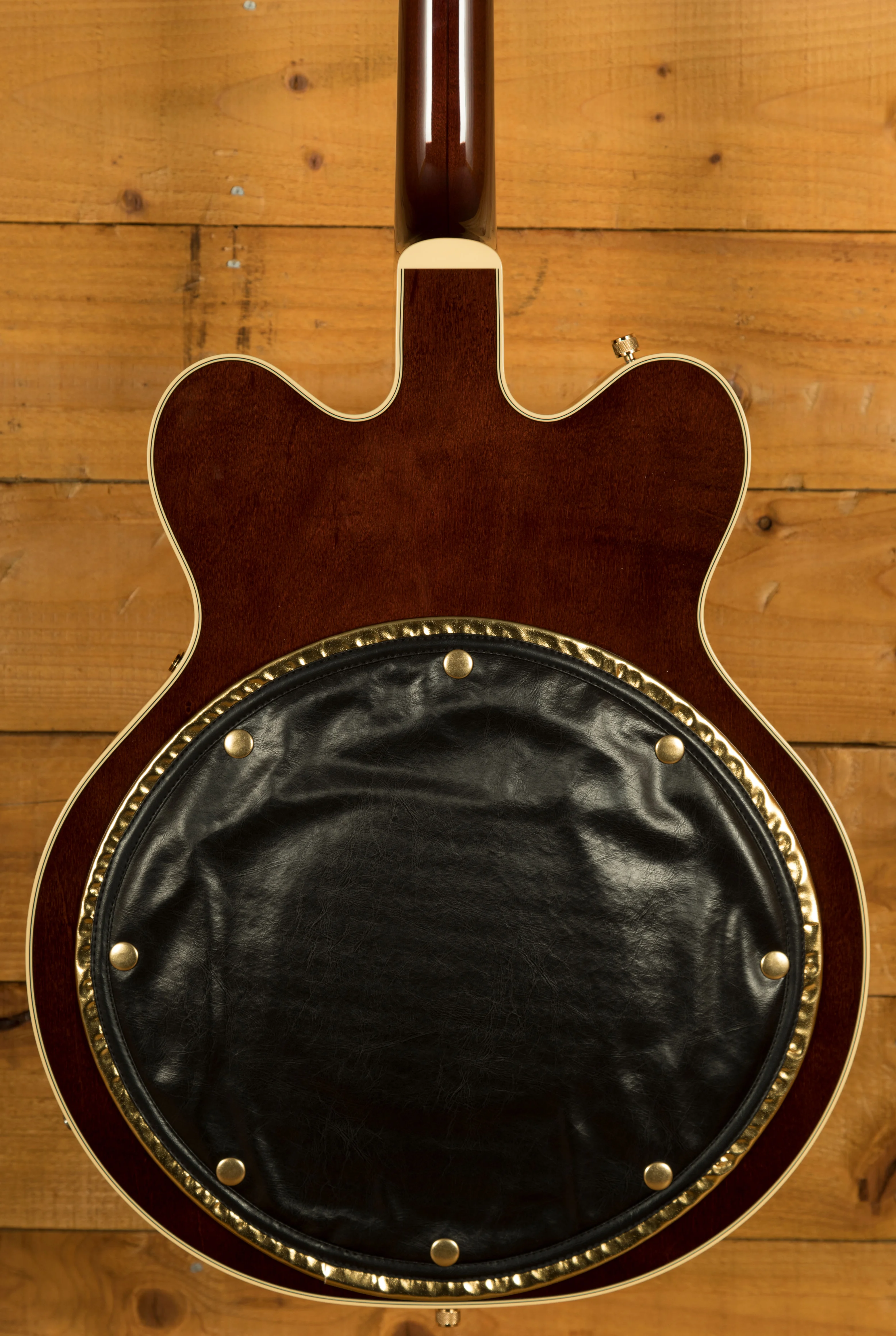 The standard "U"-shaped maple neck with a 12"-radius ebony fingerboard and 22 vintage small frets delivers an unforgettable playing experience, adaptable to many genres. Minimise feedback while revelling in authentic vintage tones with the sealed body featuring simulated F-holes. The pinned "rocking" bar bridge works in perfect harmony with the Bigsby B6G vibrato tailpiece, ensuring stable tuning, while the bone nut allows the strings to slide freely without binding.