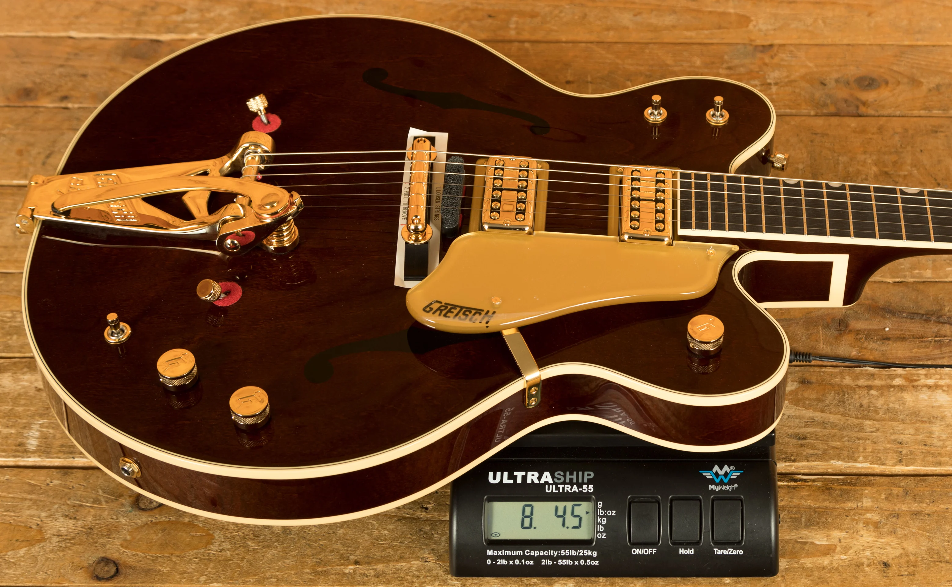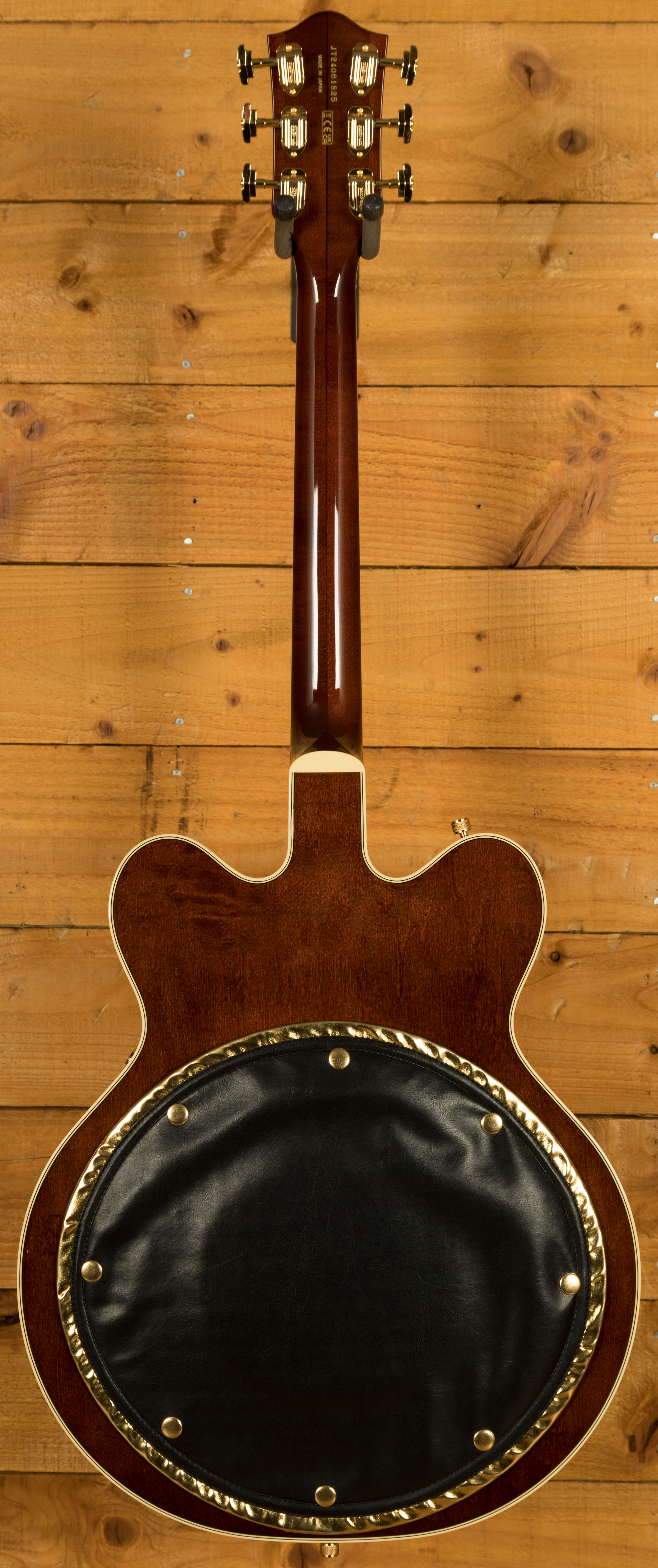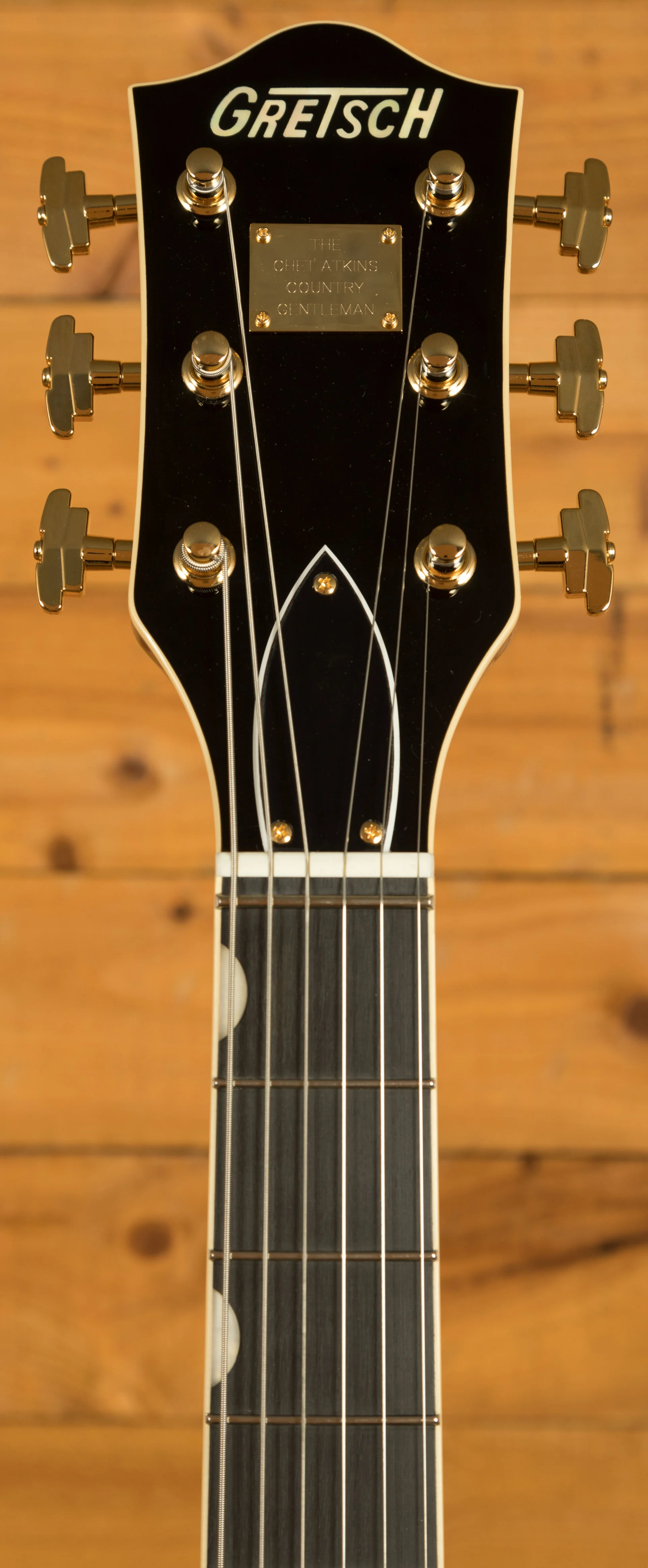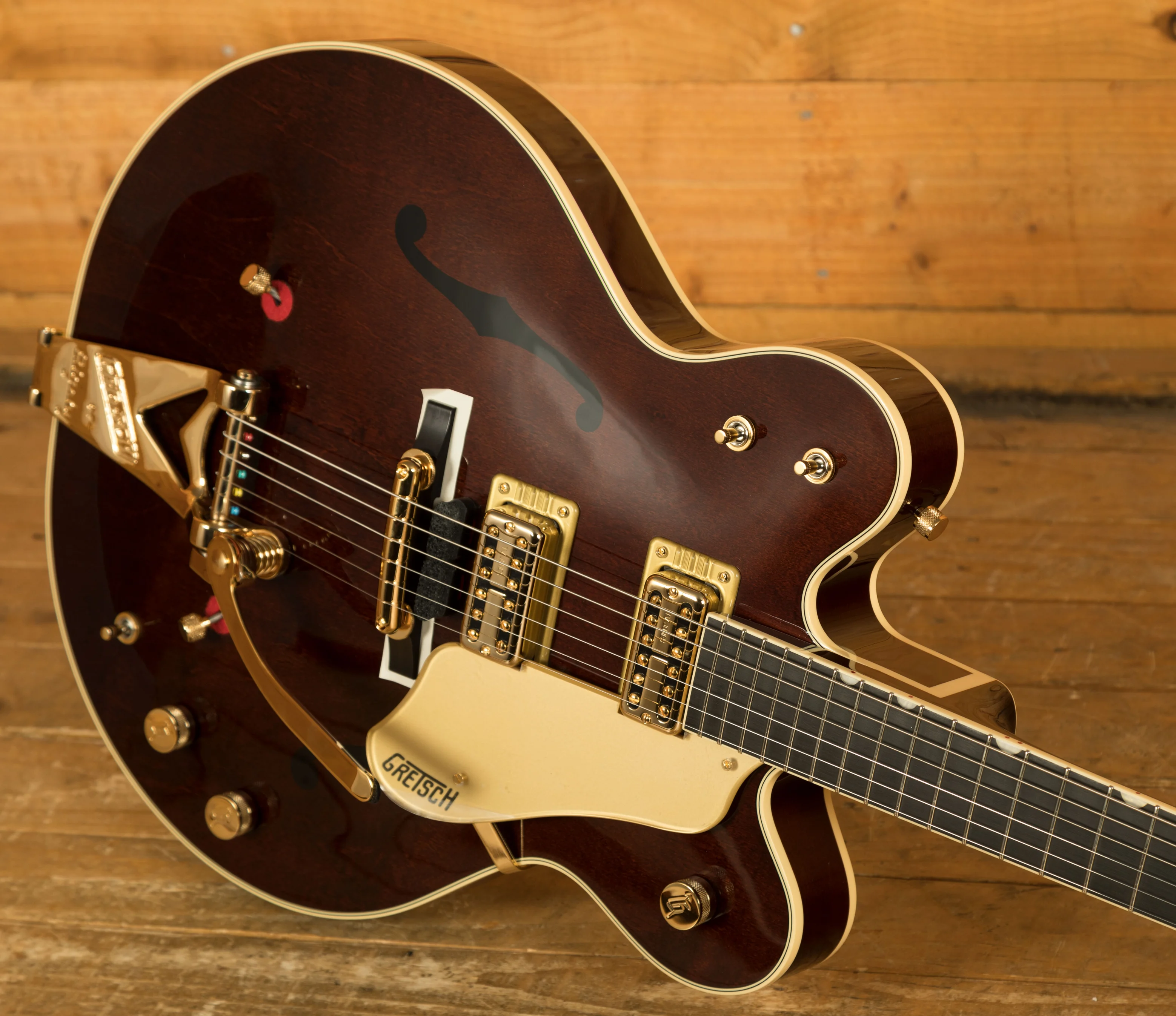 This true rock 'n' roll classic boasts the iconic appointments that turned it into a legend: dual foam string mutes with red felt surrounds, a standby switch, a laminated 3-ply maple top, gold G-arrow control knobs, aged white binding with black purfling, a glossy urethane finish, aged pearloid thumbnail inlays, a gold vintage thick plexi pickguard with Gretsch logo, and gold Grover Imperial tuning machines. The G6122T-62 Vintage Select Edition '62 Chet Atkins Country Gentleman Hollow Body with Bigsby stands as a distinguished instrument from the earliest days of the British Invasion, laying down the very foundation of rock as we know it.