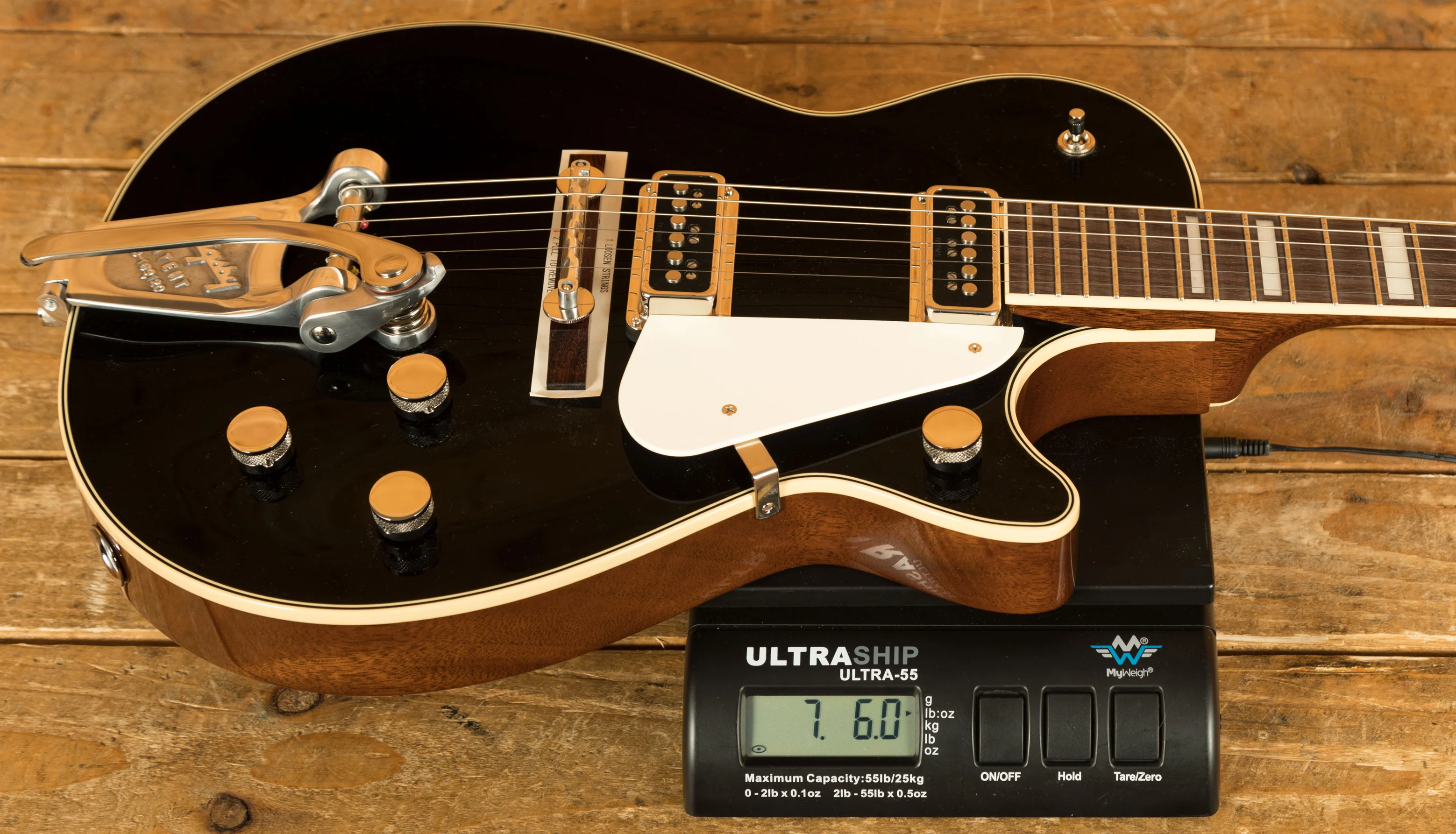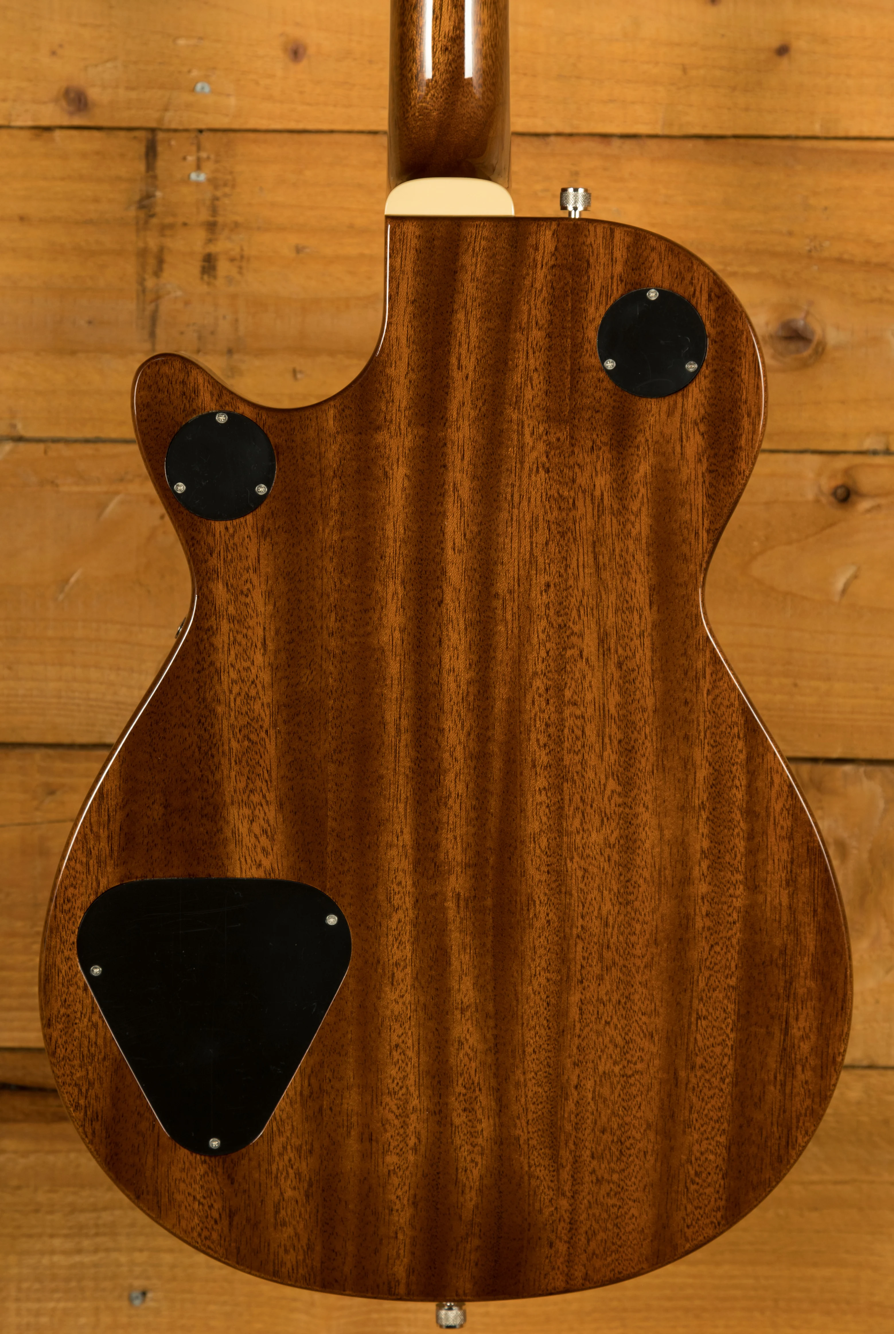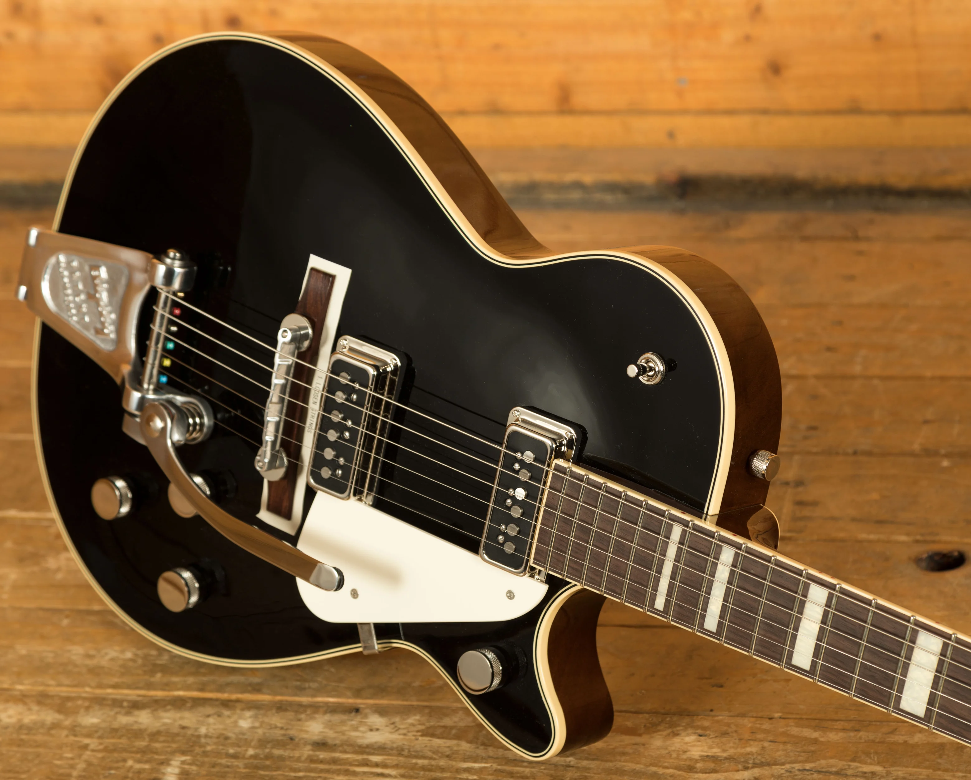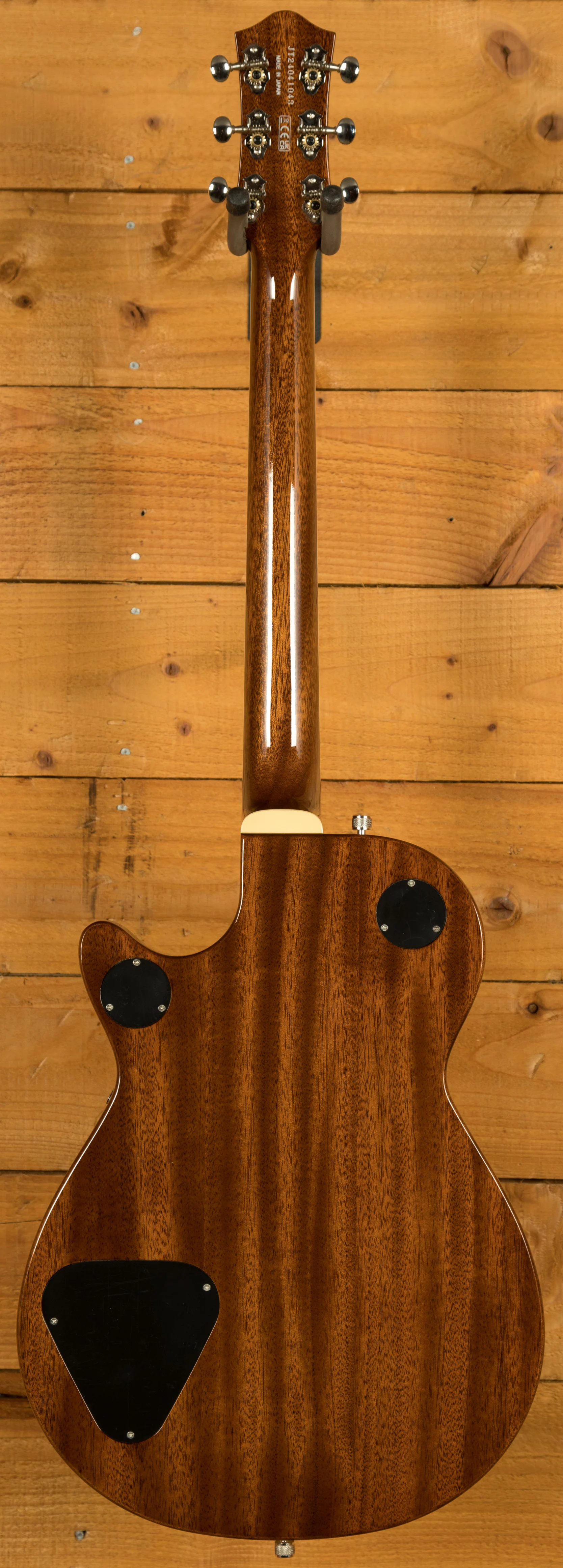 The G6128T-53 is a testament to the Professional Collection's finesse, cloaked in a captivating black hue that exudes elegance. Its mahogany neck boasts a glossy urethane finish and a Standard "U" shape, while the rosewood fingerboard with aged pearloid blocks enhances the playability. With 22 frets, a bone nut, and an ergonomic cutaway design, this guitar ensures optimum performance.