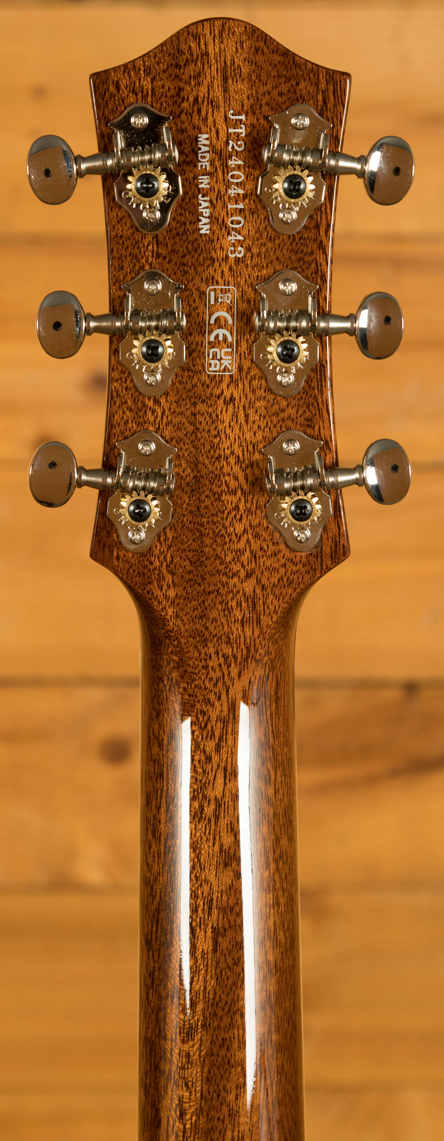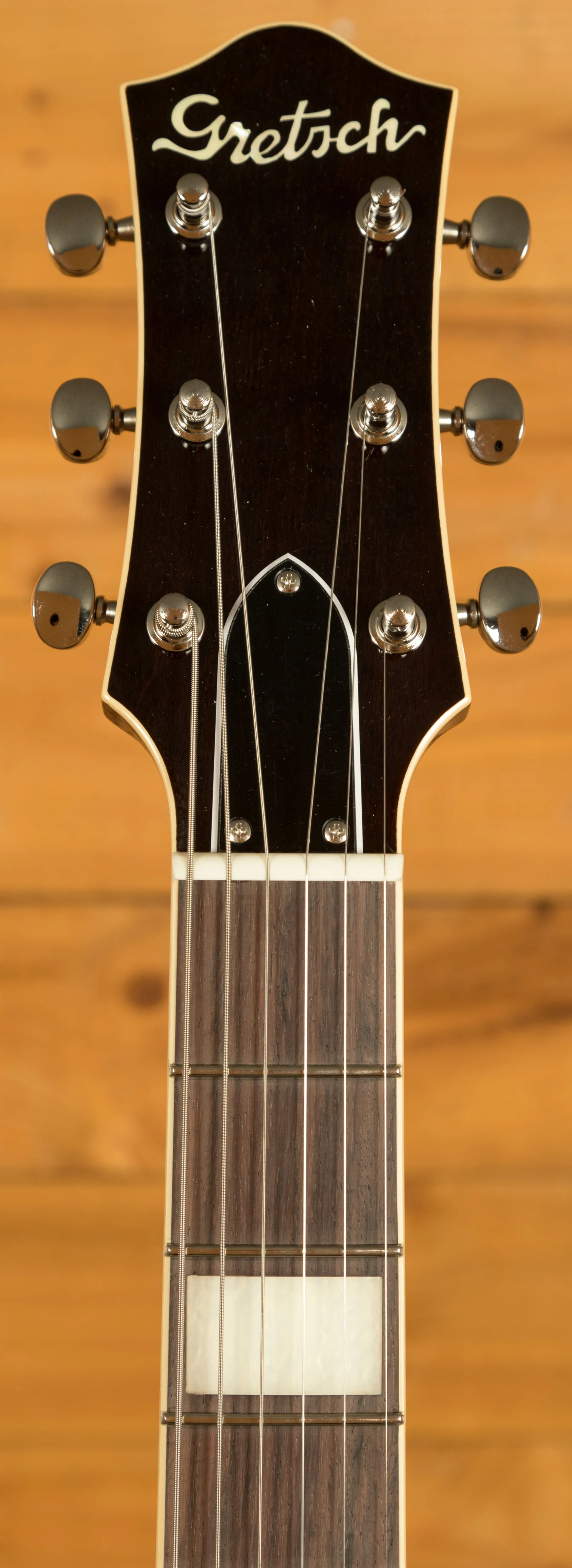 The Jet body shape is adorned with arched laminated maple atop mahogany, complemented by aged white binding, accentuating its classic beauty. The Jet design, known for its chambered attributes, resonates with a depth of 2" (51mm), while the aluminium compensated bridge with Bigsby B3CCB tailpiece ensures flawless tuning stability and dynamic tremolo capabilities. The exquisite combination of TV Jones T-Armond pickups adds a vintage sonic dimension, controlled through a versatile setup of volume and tone controls, plus a 3-position toggle switch.
