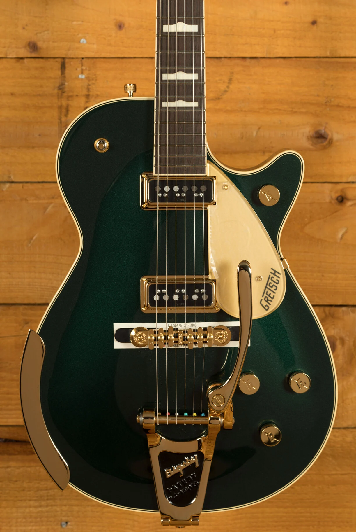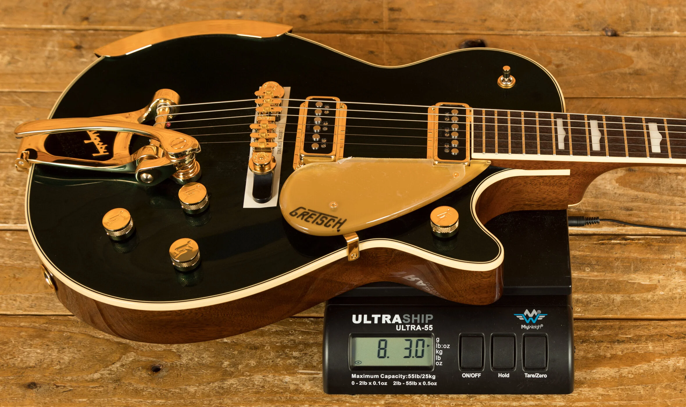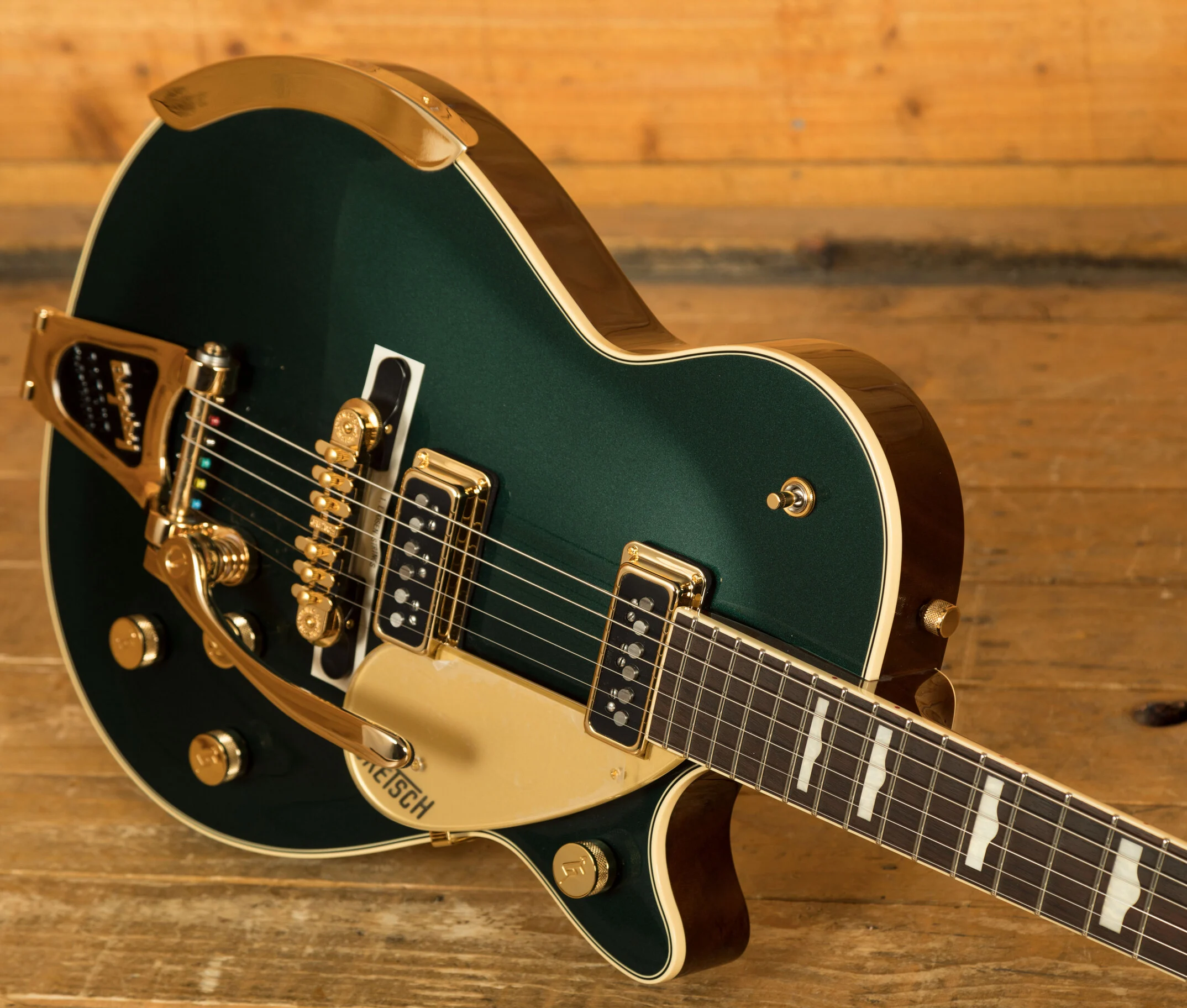 Experience the essence of musical instrument heritage with the Vintage Select Edition guitars by Gretsch. Inspired by the iconic golden age of Gretsch in the 1950s and early '60s, these guitars are crafted for discerning players who appreciate the finest craft skills. Introducing the G6128T-57 Vintage Select '57 Duo Jet with Bigsby, a true masterpiece that embodies the legacy of Gretsch. Dressed in the elegant Cadillac Green finish with gleaming gold hardware, this guitar exudes style and sophistication.