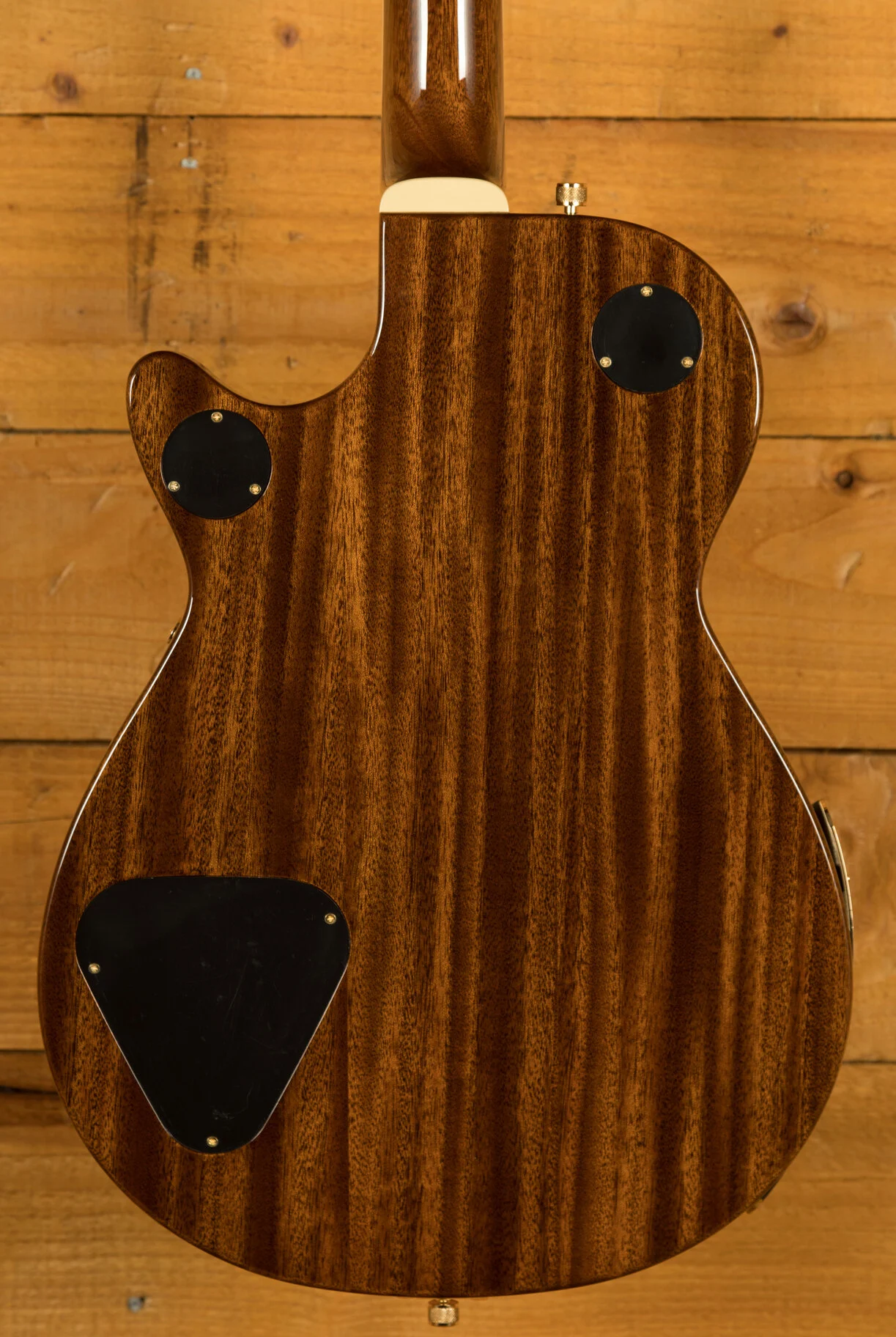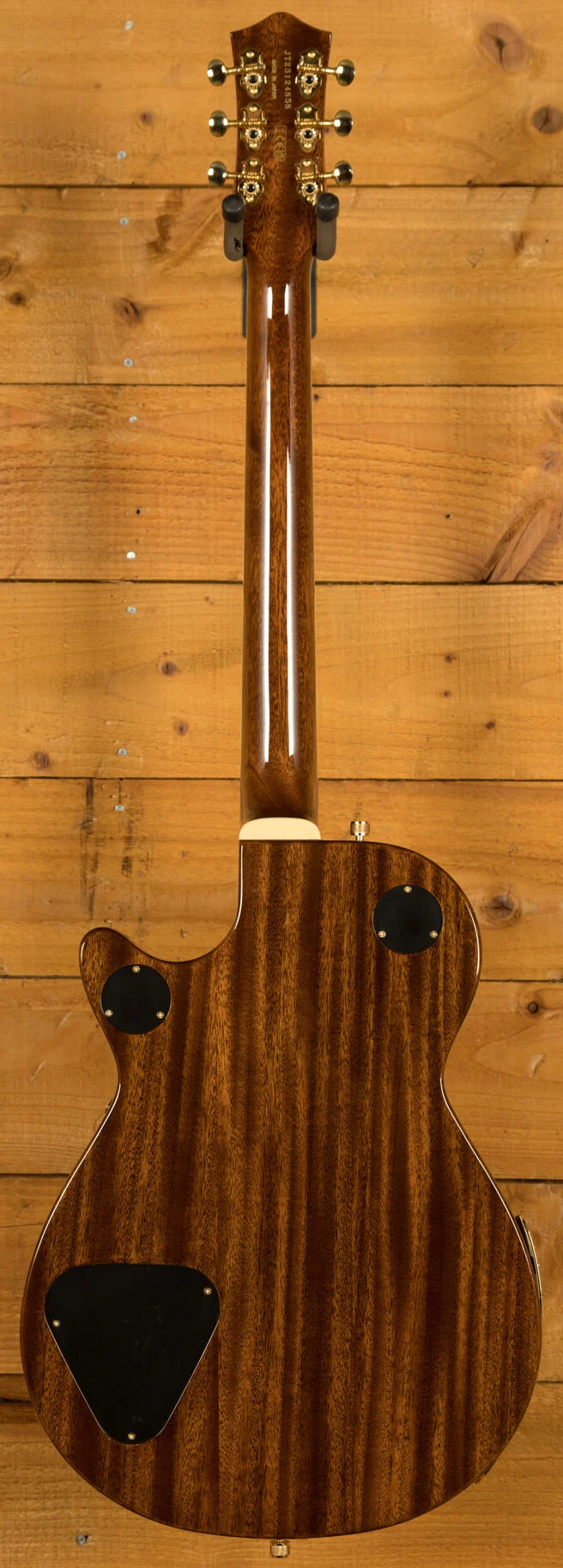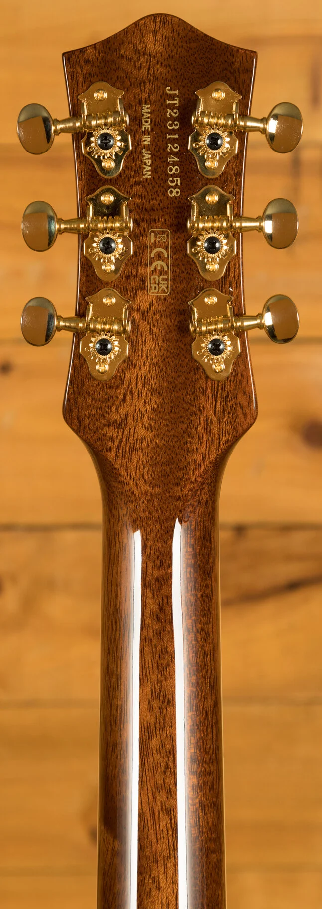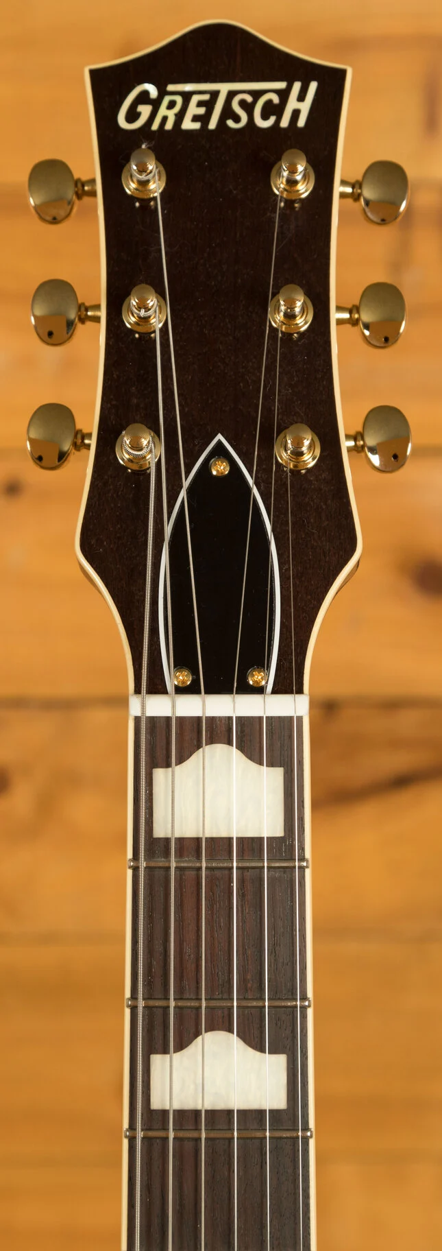 With meticulous attention to detail, the G6128T-57 Vintage Select '57 Duo Jet showcases the finest craft skills. Its solid body construction, single cutaway design, and arched laminated maple top ensure optimal performance and resonance. The gloss Cadillac Green finish exudes vintage elegance, complemented by the timeless appeal of gold hardware. The neck, made of mahogany and finished in gloss urethane, offers a comfortable playing experience with its standard "U" shape and vintage pearloid hump-block position markers on the rosewood fingerboard.
