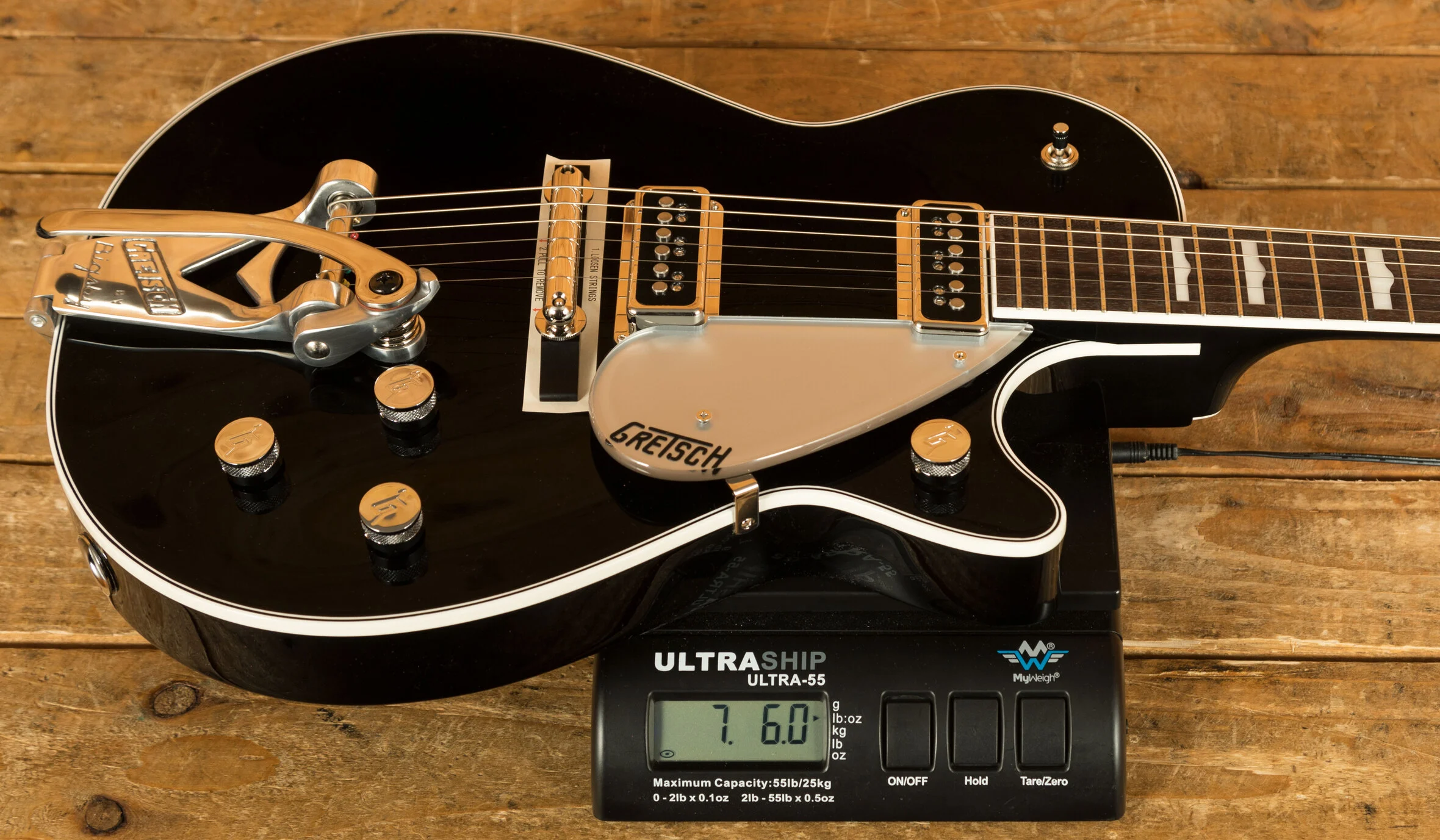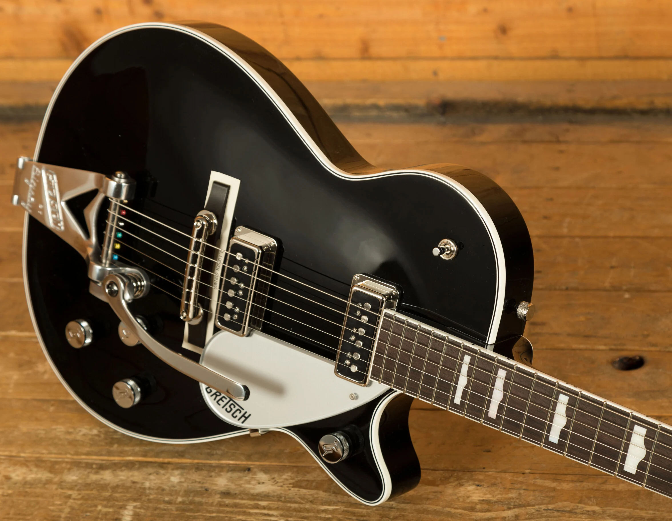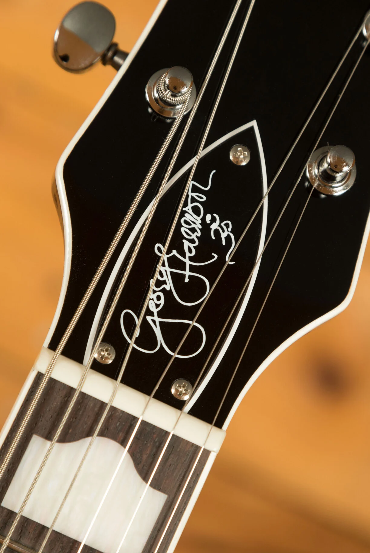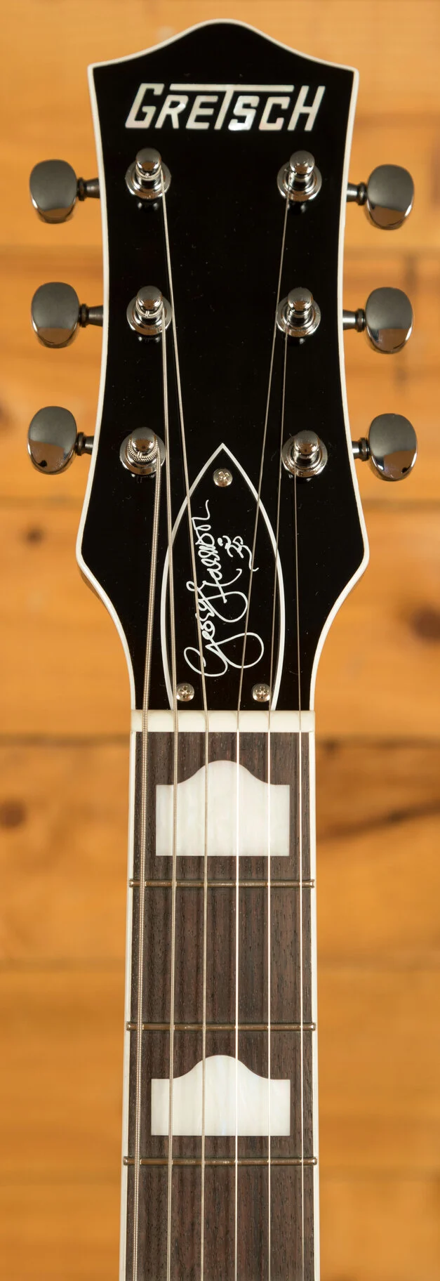 Introducing the G6128T-GH George Harrison Signature Duo Jet guitar, a remarkable tribute to the musical legacy of George Harrison. This exceptional instrument is meticulously crafted, modelled on the very guitar that Harrison himself affectionately called his "first real decent guitar." The GH6128T-GH showcases the authentic appointments and modifications featured on Harrison's original 1957 Gretsch Duo Jet, a cherished instrument he acquired in the early 1960s. Immerse yourself in the captivating sound and unique character of this signature model, boasting a lightweight mid-'50s-style chambered body, a Bigsby B3C tailpiece with a sleek black Phillips head tremolo arm pivot bolt, and a distinct offset strap button on the lower bout. Impeccable details include three-ply body binding in an elegant white-black-white pattern, single-ply white neck and headstock binding, and a mesmerising 12"-radius 22-fret rosewood fingerboard adorned with stunning Hump Block pearloid inlays. Experience the rich tonal palette provided by the two single-coil DynaSonic pickups, while the vintage-style "rocking bar" bridge with a rosewood base ensures flawless intonation and sustain. The silver plexi pickguard and chrome-plated Grover V98CM Sta-Tite tuners add a touch of class, while the truss rod cover proudly bears George Harrison's signature. With its remarkable craft skills and included premium tweed hardshell case, the G6128T-GH George Harrison Signature Duo Jet is the epitome of elegance and an exquisite homage to a true music icon.
