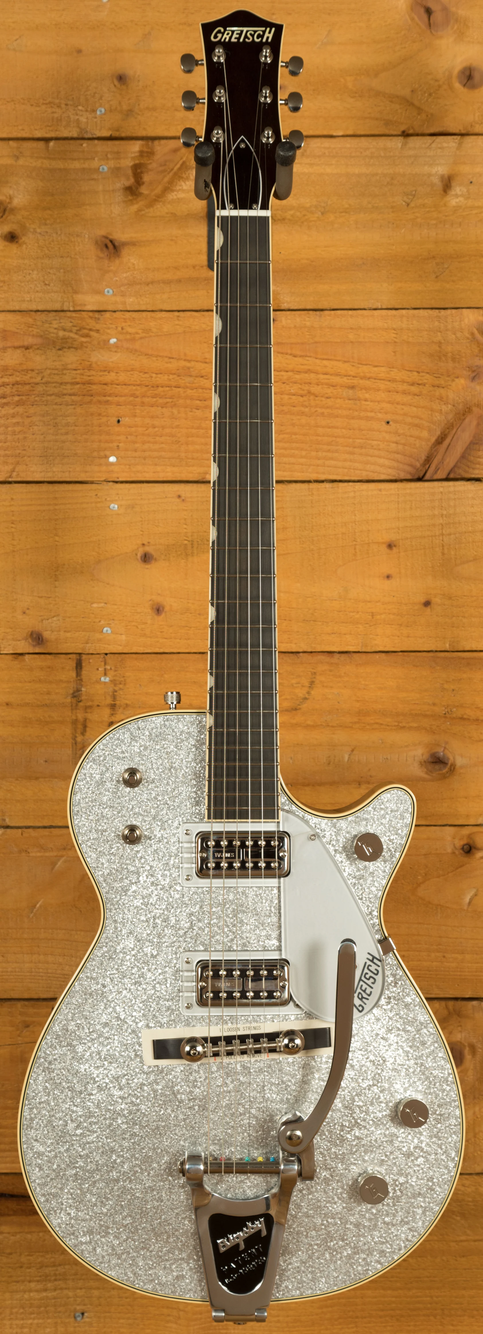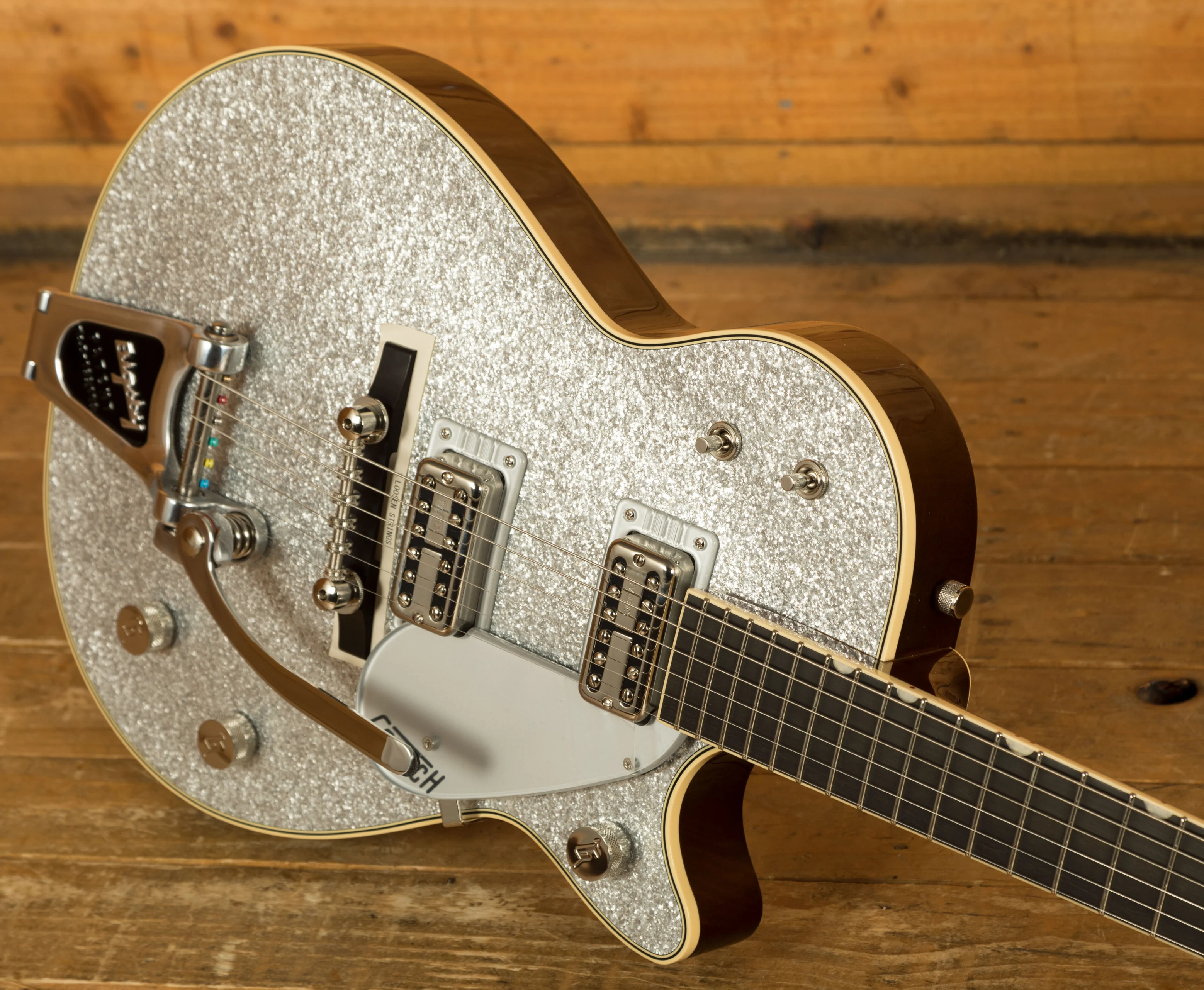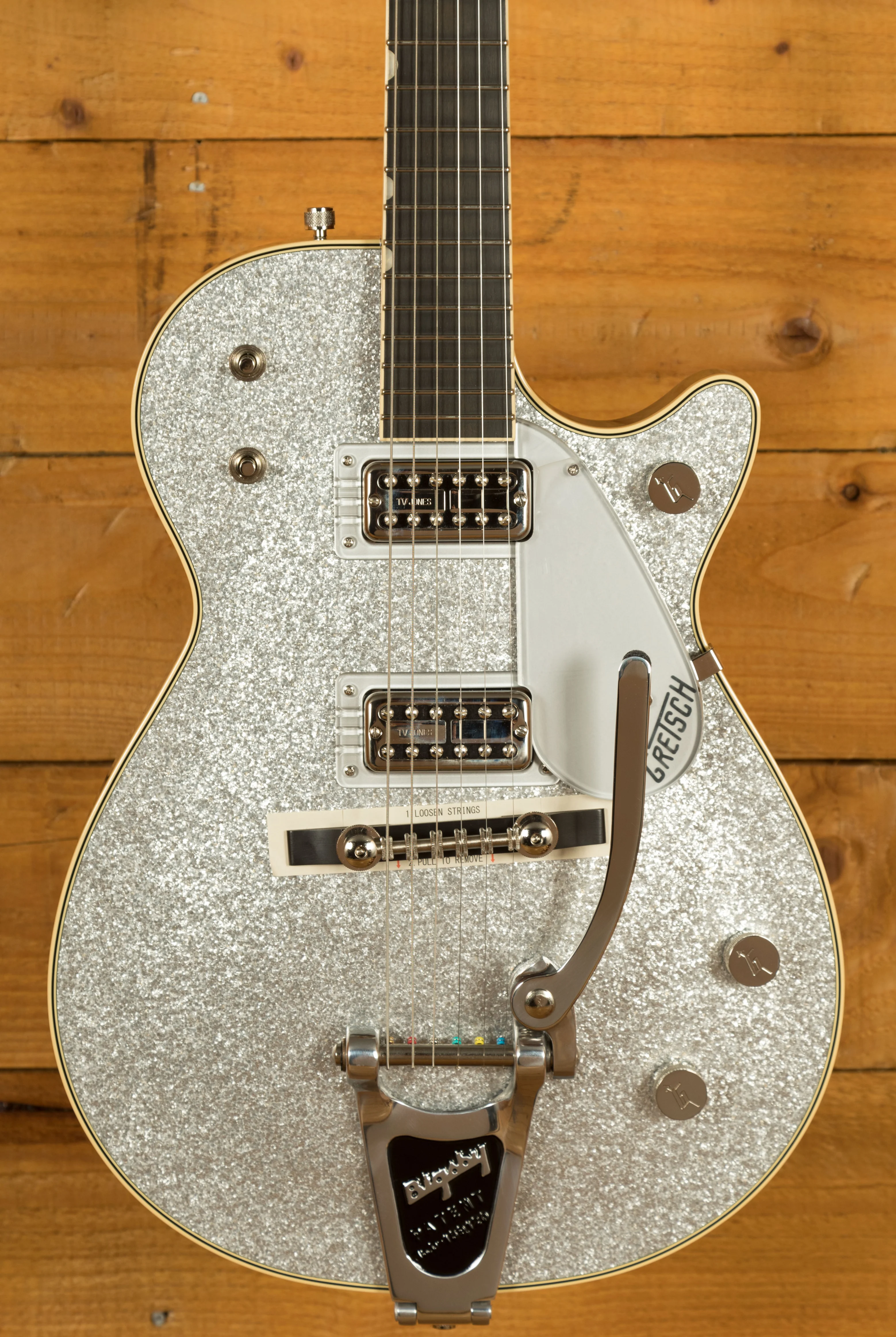 Introducing the G6129T-59 Vintage Select '59 Silver Jet with Bigsby from Gretsch's renowned Vintage Select Edition. Designed to capture the essence of the golden age of Gretsch guitars in the 1950s and early '60s, this instrument is a testament to the impeccable craft skills and musical heritage that discerning players appreciate. The Silver Jet, a revered silver-sparkle variant of the iconic Duo Jet, embodies the power and punch that made its predecessor legendary. Crafted with a chambered mahogany body, it delivers unparalleled harmonic richness by allowing the air to resonate between the top and body, resulting in a vibrant and articulate tone. Building upon its vintage roots, this magnificent '50s-inspired beauty features dual TV Jones Classic pickups that faithfully reproduce the unmistakable Filter'Tron sound. With its shimmering aesthetics and futuristic allure, the G6129T-59 Vintage Select '59 Silver Jet with Bigsby is a sparkling tribute to the timeless legacy of Gretsch guitars.