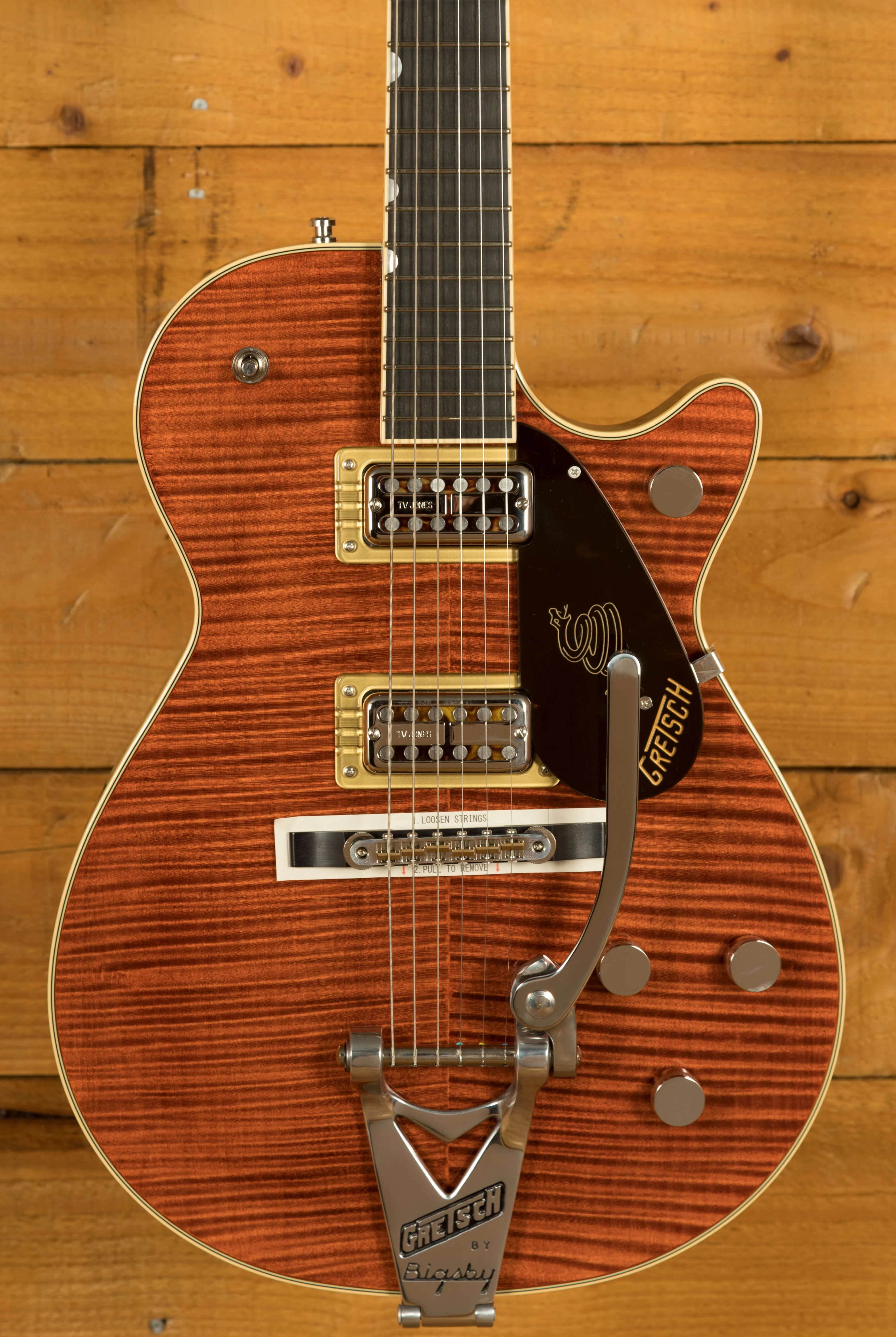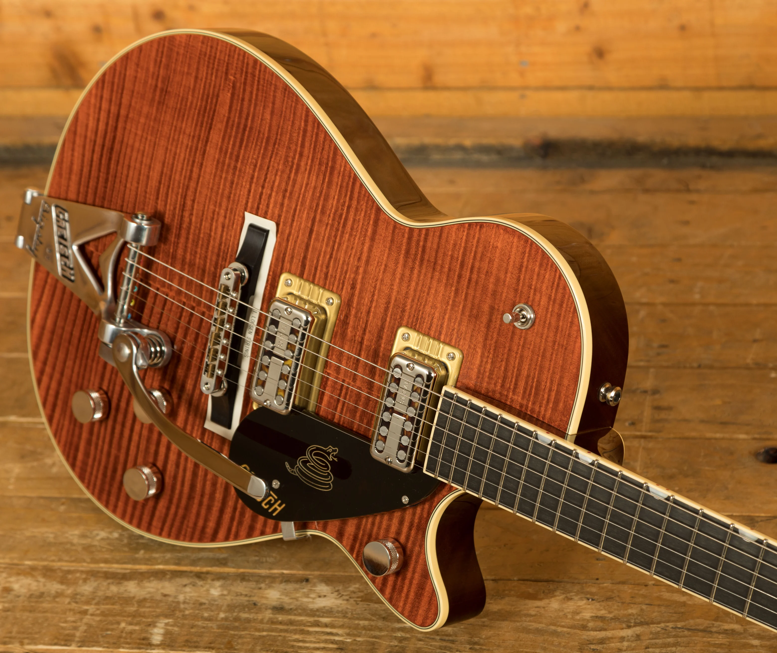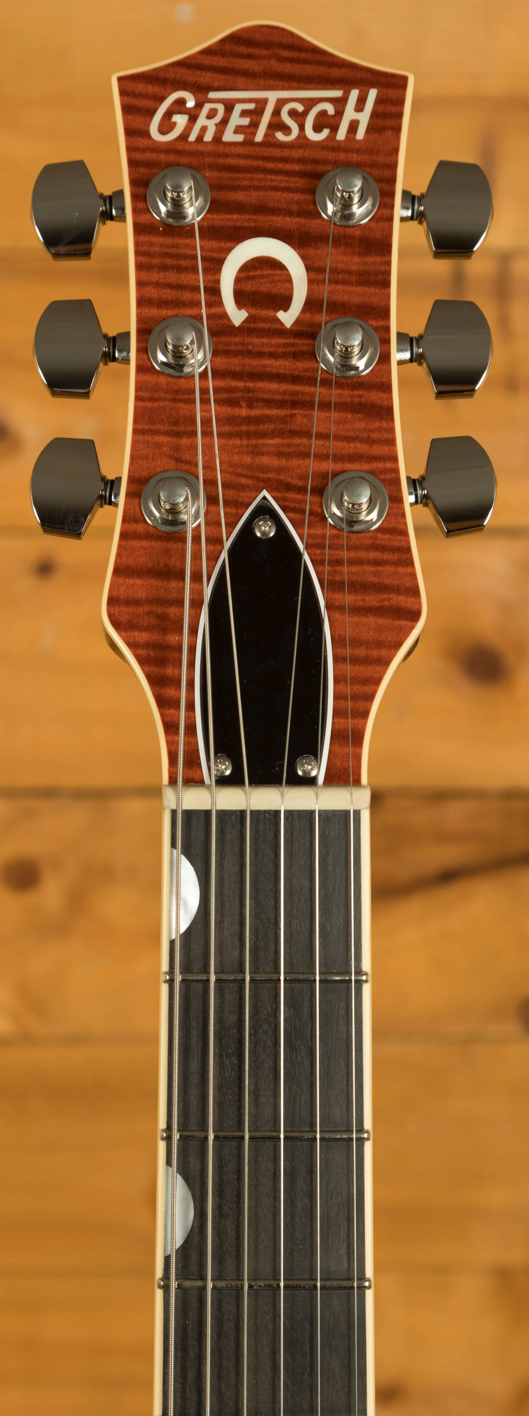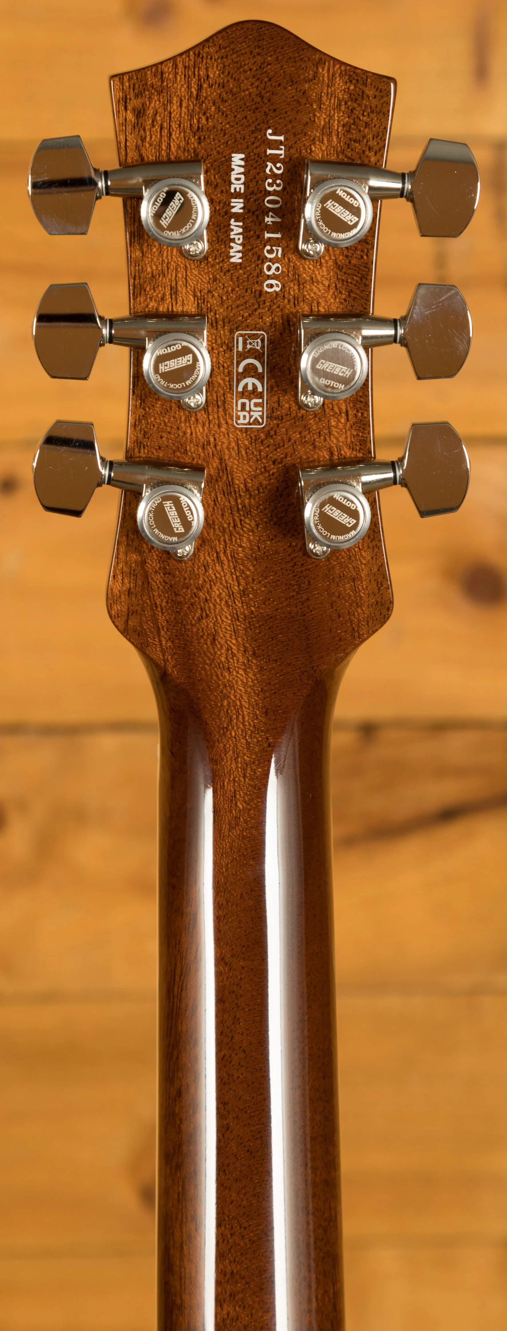 Additional features include a mahogany neck with a 12" radius ebony fingerboard, 22 medium jumbo frets, and mother-of-pearl Neo Classic thumbnail inlays. The Graph Tech Tusq XL nut, Adjusto-Matic bridge with unplated brass saddles, pinned ebony base, String-Thru Bigsby B3P tailpiece, Gotoh locking tuners, and Grover strap locks ensure optimal performance and stability. The guitar is finished in nitrocellulose lacquer and comes with a G6238 Gretsch deluxe hardshell case for protection and portability.