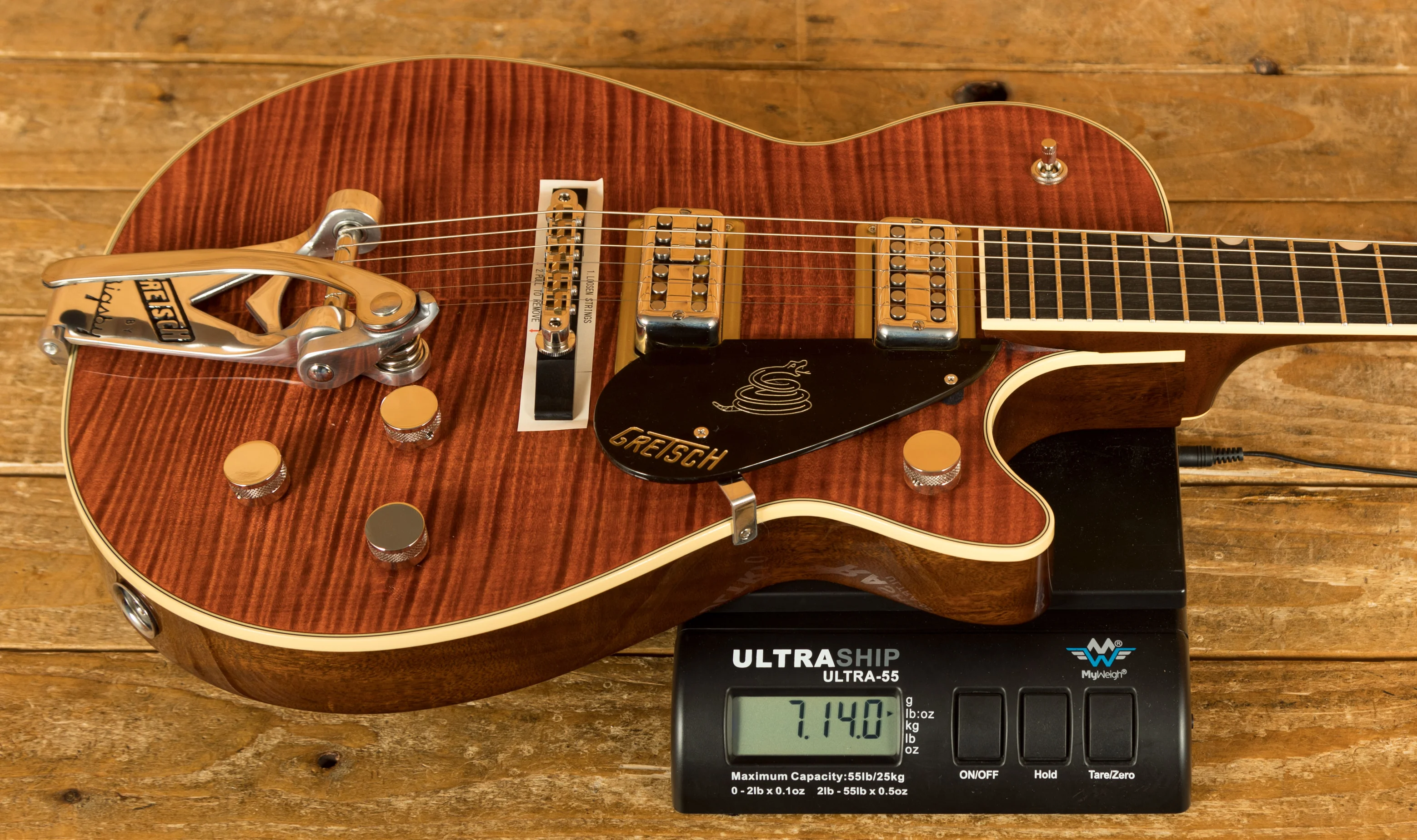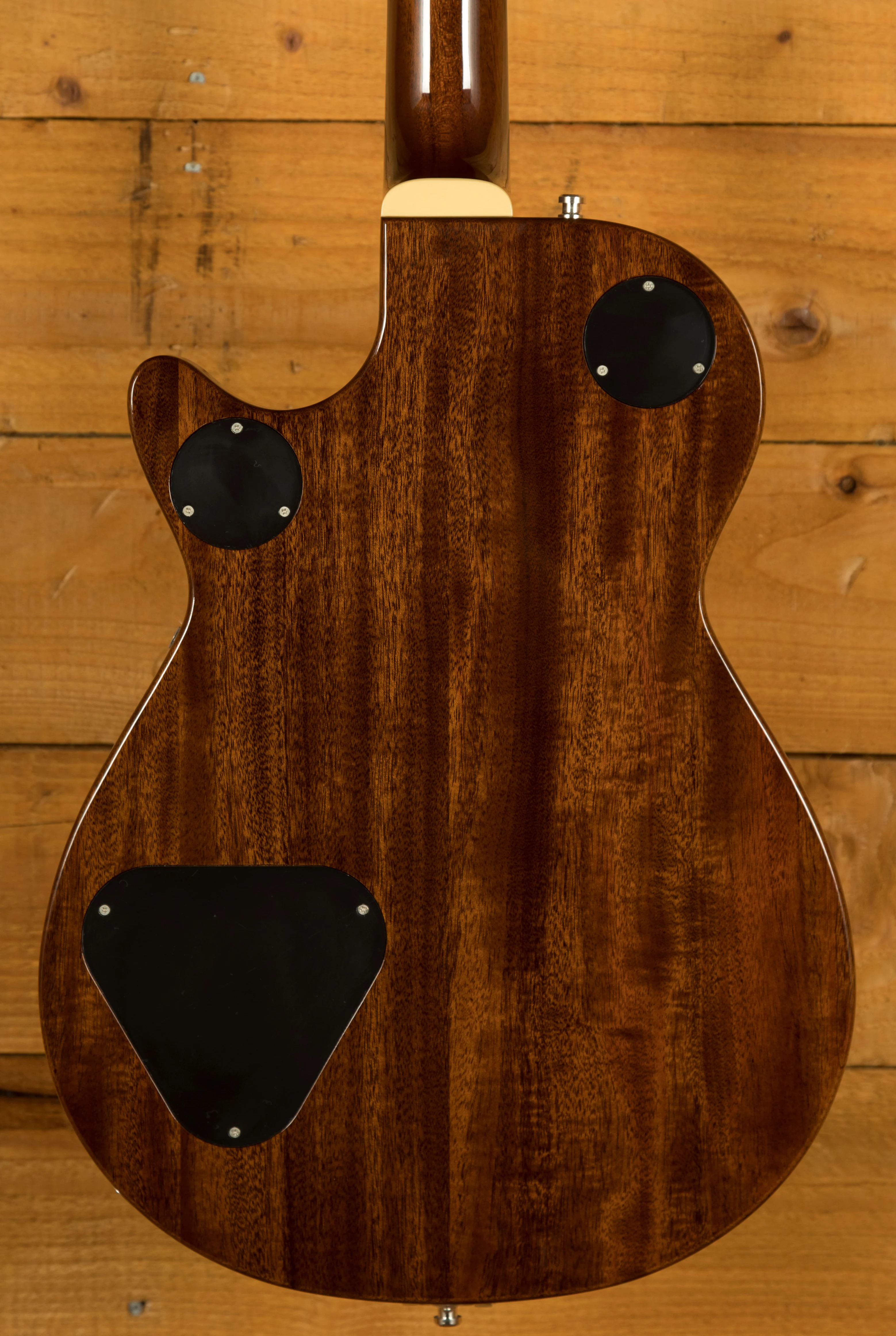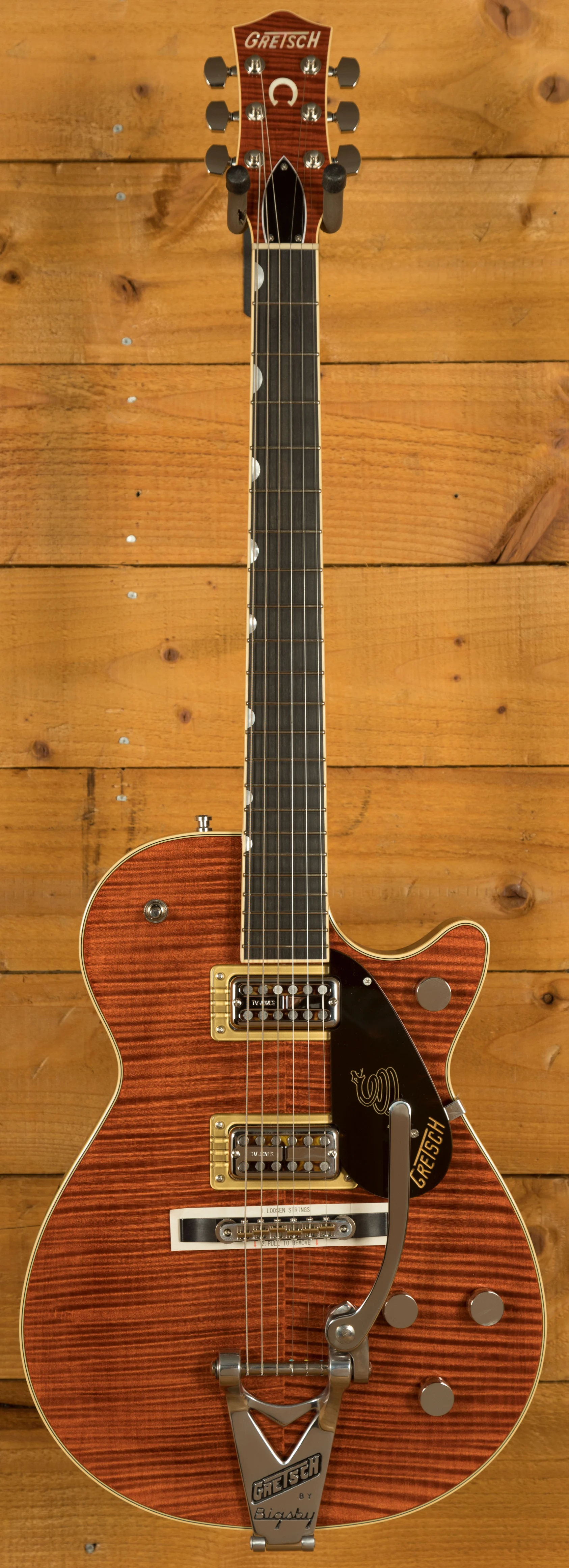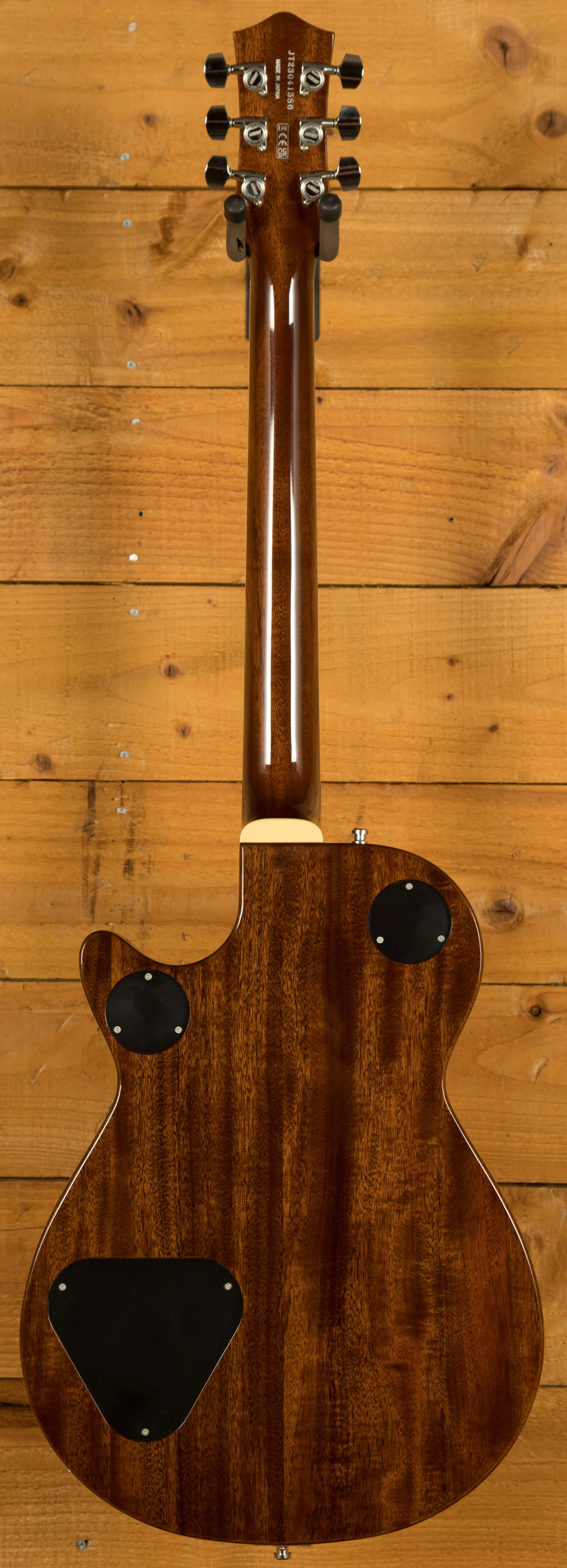 Additional features include a mahogany neck with a 12" radius ebony fingerboard, 22 medium jumbo frets, and mother-of-pearl Neo Classic thumbnail inlays. The Graph Tech Tusq XL nut, Adjusto-Matic bridge with unplated brass saddles, pinned ebony base, String-Thru Bigsby B3P tailpiece, Gotoh locking tuners, and Grover strap locks ensure optimal performance and stability. The guitar is finished in nitrocellulose lacquer and comes with a G6238 Gretsch deluxe hardshell case for protection and portability.