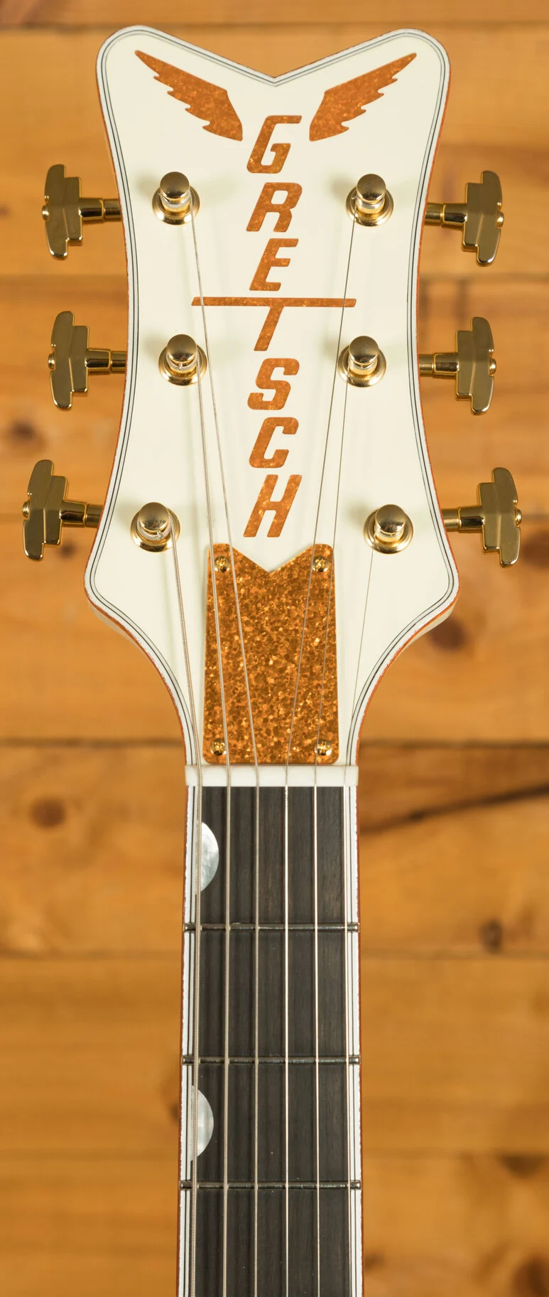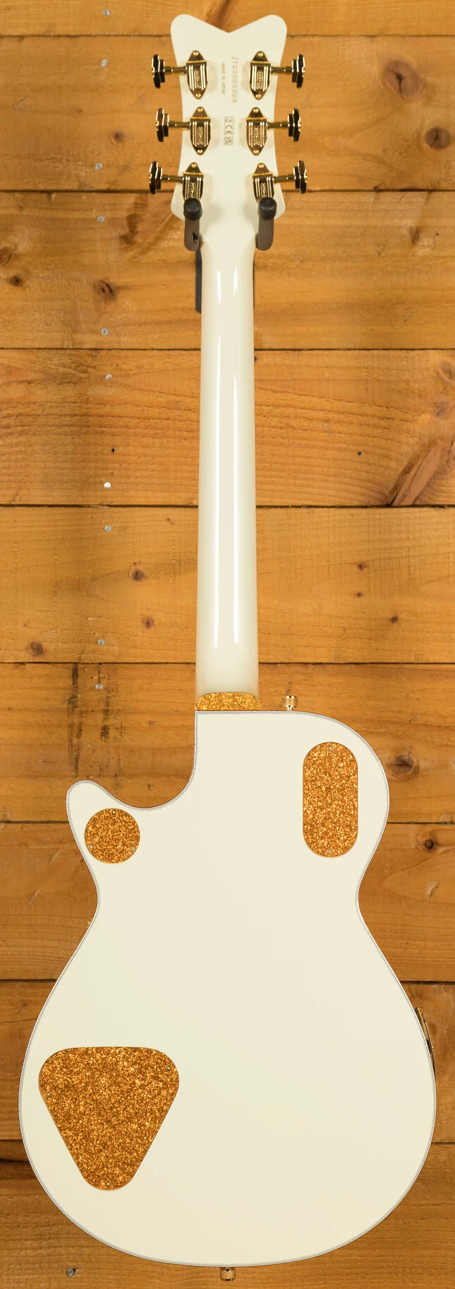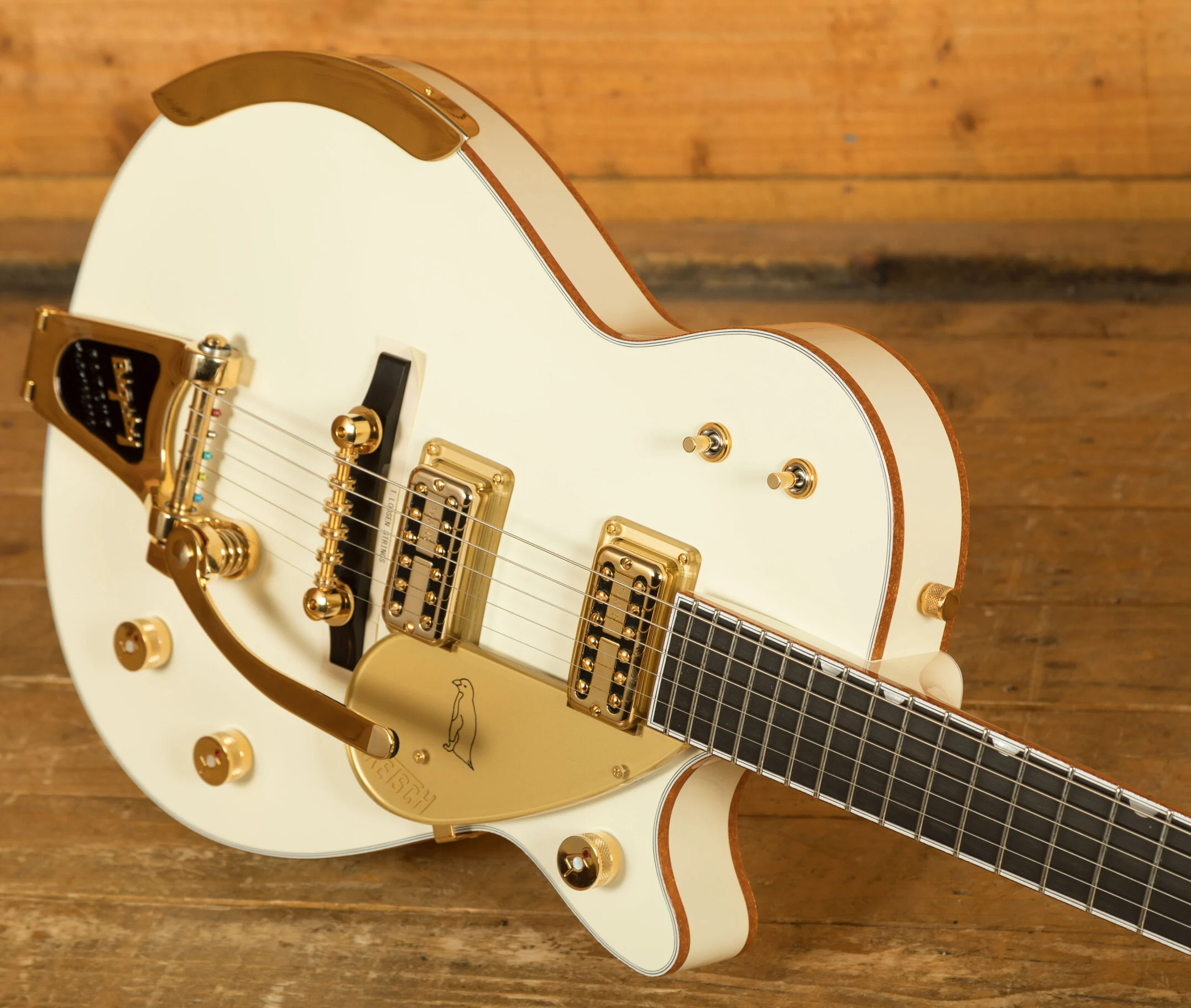 Finished in a stunning Vintage White, the G6134T-58 Penguin not only sounds exceptional but also stands out visually. The inclusion of a Bigsby vibrato tailpiece adds to its classic appeal, offering smooth pitch modulation and enhancing its overall playability. This guitar is a perfect choice for those seeking a blend of historical design and modern craftsmanship.