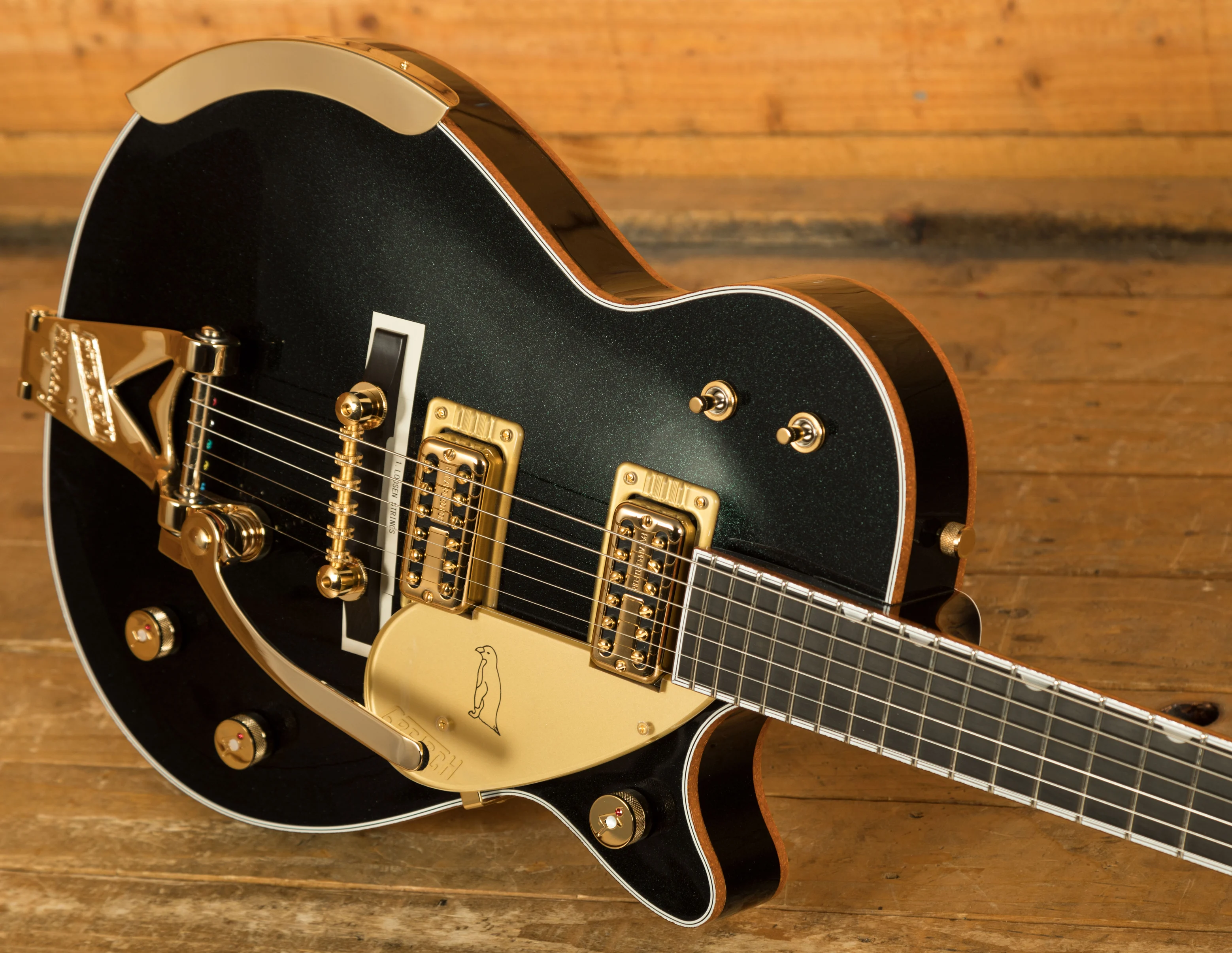 The G6134TG-58 Limited Edition 1958 Custom Penguin offers a striking new take on one of Gretsch's most iconic designs. Finished in the dark, atmospheric Emerald Night metallic finish, this rare model blends period-accurate 1958 features with refined modern enhancements. A vintage-chambered mahogany body paired with an arched maple top delivers the unmistakable Gretsch blend of resonance, punch and airy acoustic response, while the TV Jones Ray Butts Ful-Fidelity Filter-Tron pickups provide the twang, growl and harmonic richness that define the Penguin's legendary voice.