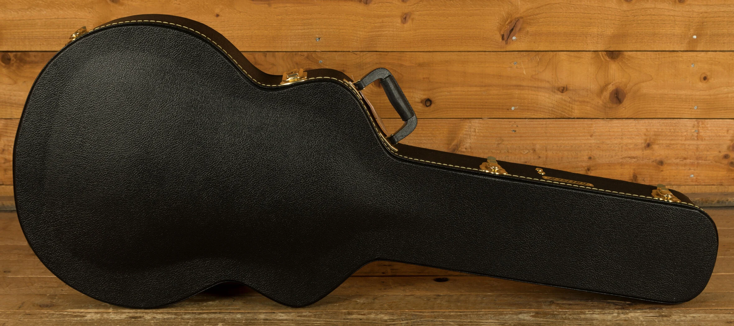 Crafted with a solid spruce top and laminated maple back and sides, reinforced by parallel tone bars, this Falcon Hollow Body generates a bold, balanced sound with enhanced projection from its 2.75" deep body. The smooth ebony fingerboard with 22 medium jumbo frets, adorned with elegant mother-of-pearl Hump Block and feather inlays, sits atop a maple neck boasting a comfortable standard "U" profile, providing effortless playability for both complex chords and intricate single-note passages.