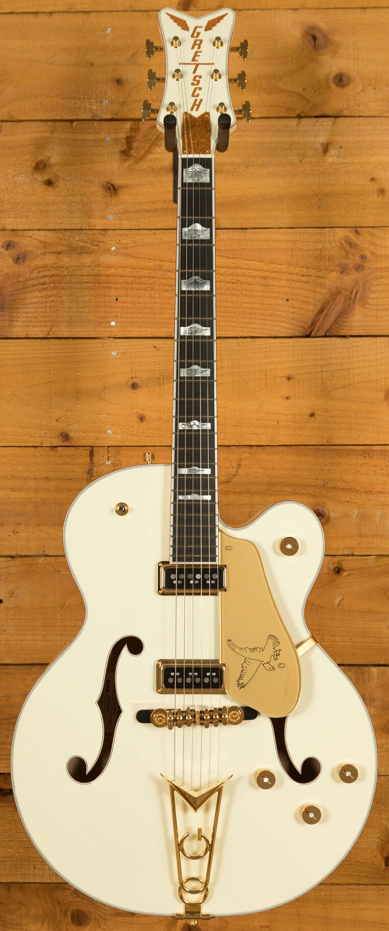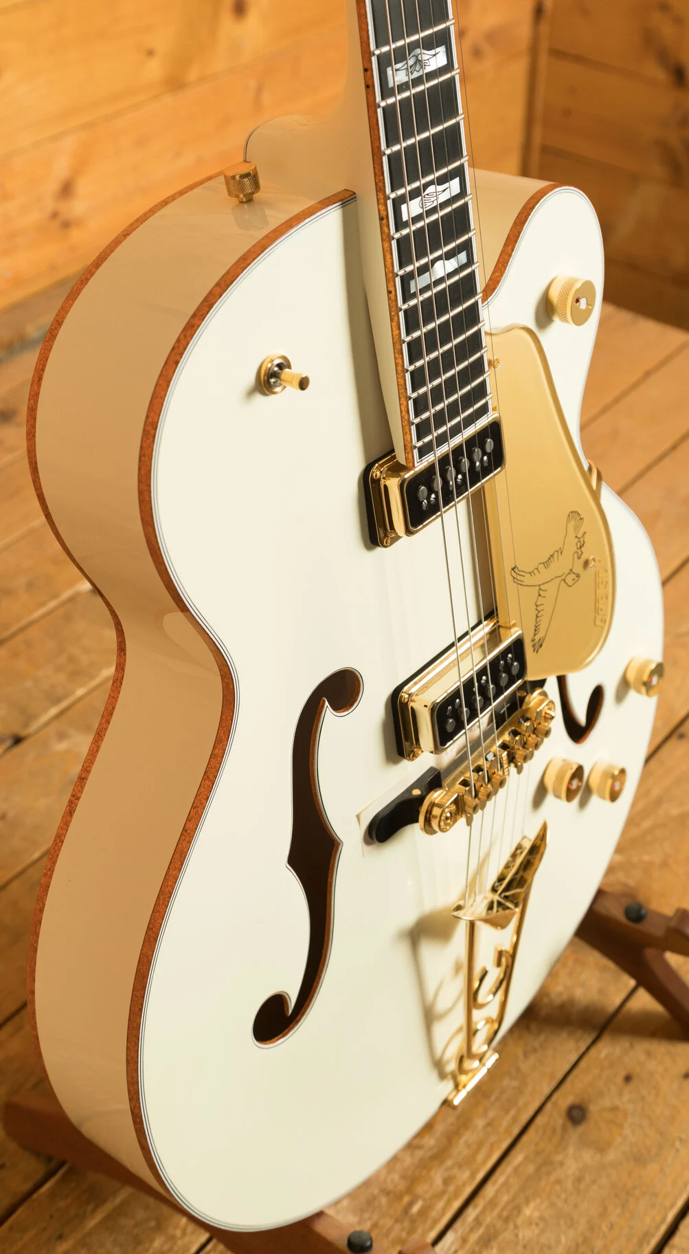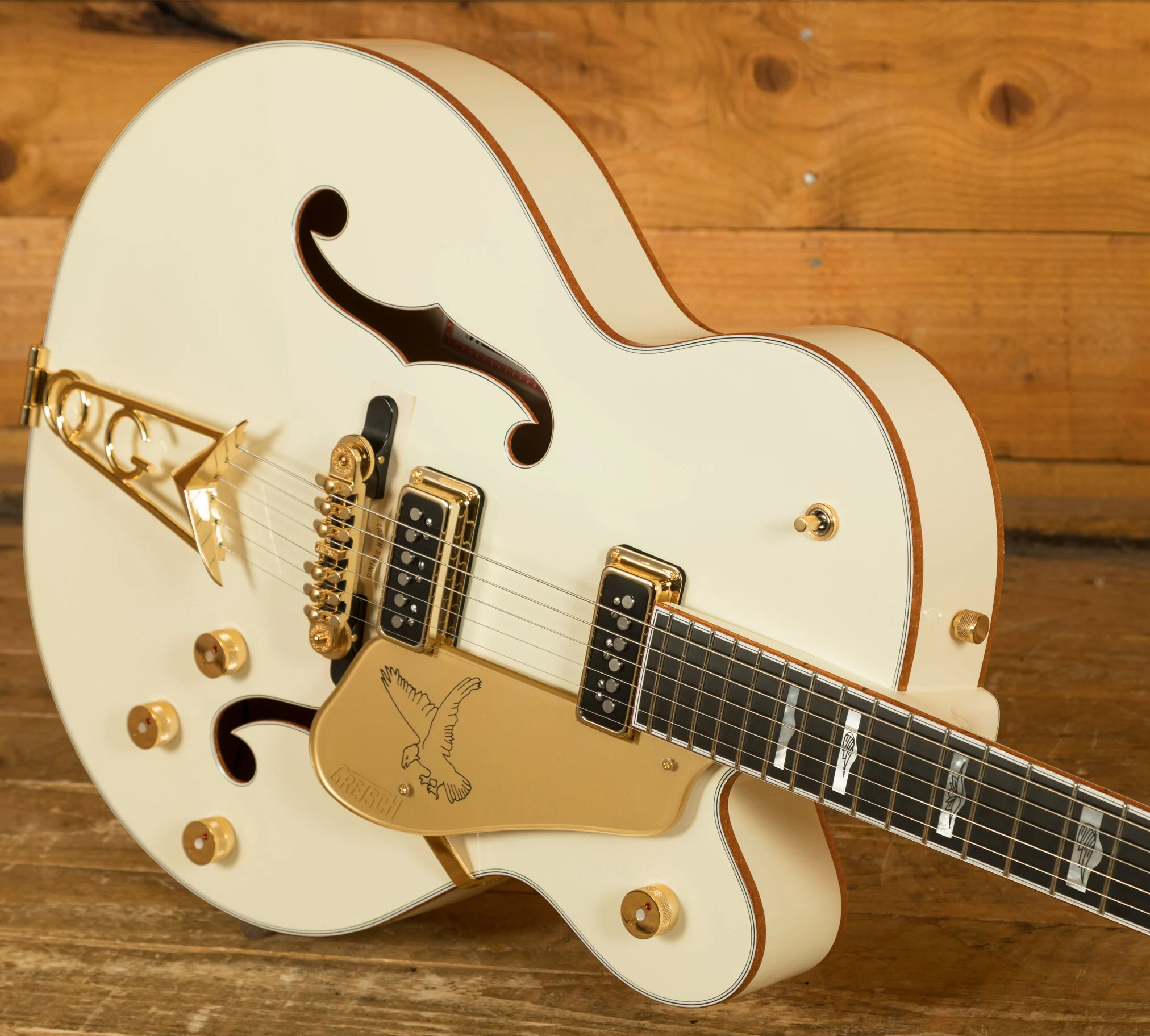 Dripping with sophisticated class, the White Falcon boasts gleaming gold hardware, including the iconic Cadillac "G" tailpiece and gold jewelled arrow knobs. Its gold sparkle binding, vintage white gloss nitrocellulose lacquer finish, and vintage thick plexi pickguard with Gretsch logo make a striking visual statement. The G6136-55 Vintage Select Edition '55 Falcon Hollow Body with Cadillac Tailpiece represents the pinnacle of guitar perfection - the quintessential "Holy Grail" guitar that deserves a place of honour in your collection. This masterpiece comes complete with a deluxe hardshell case.