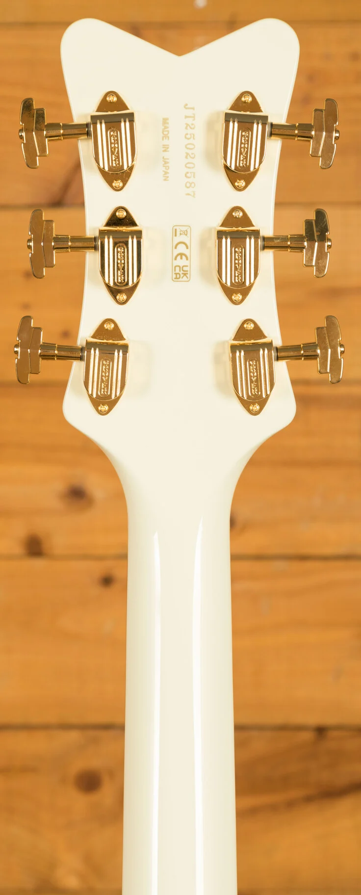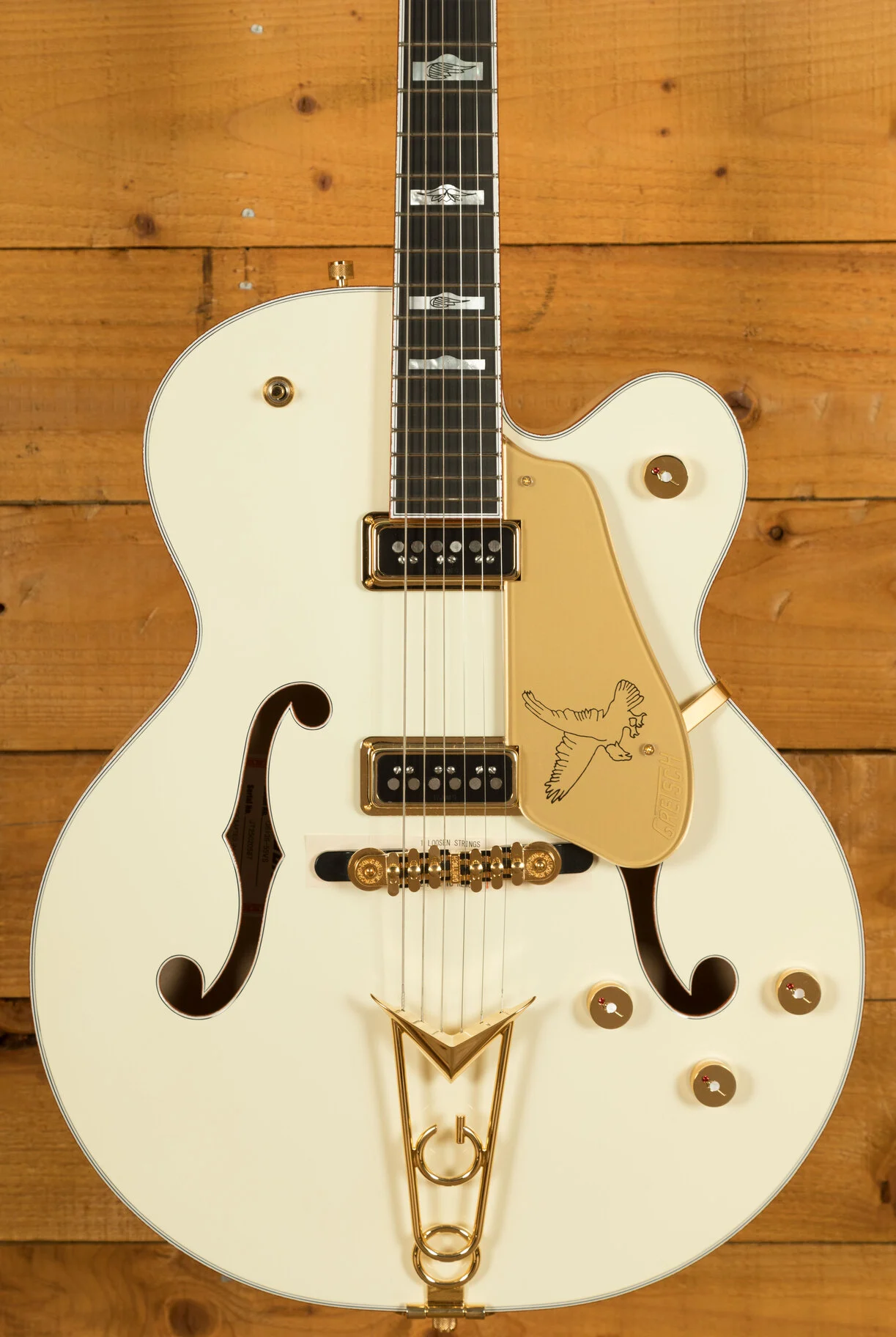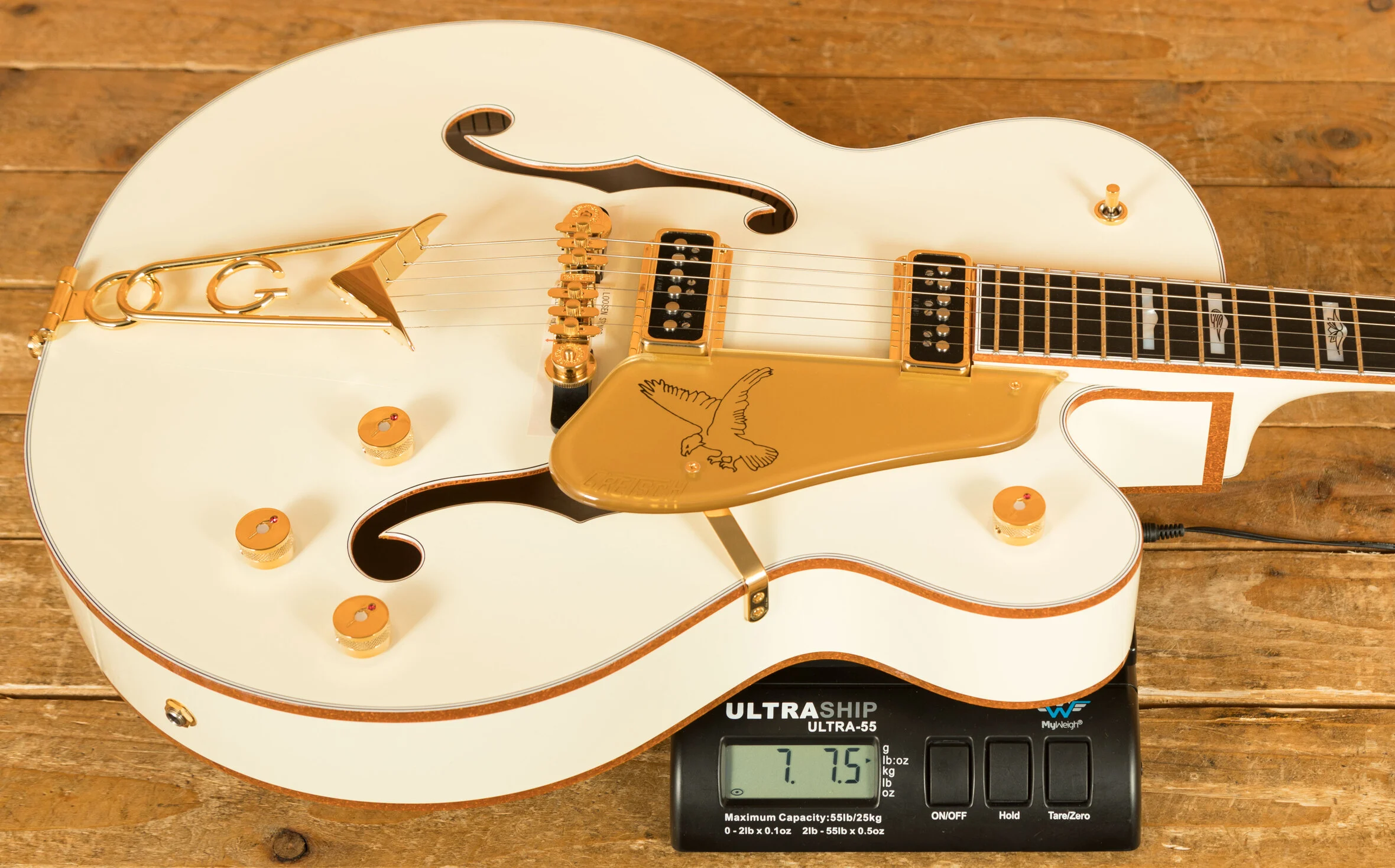 Dripping with sophisticated class, the White Falcon boasts gleaming gold hardware, including the iconic Cadillac "G" tailpiece and gold jewelled arrow knobs. Its gold sparkle binding, vintage white gloss nitrocellulose lacquer finish, and vintage thick plexi pickguard with Gretsch logo make a striking visual statement. The G6136-55 Vintage Select Edition '55 Falcon Hollow Body with Cadillac Tailpiece represents the pinnacle of guitar perfection - the quintessential "Holy Grail" guitar that deserves a place of honour in your collection. This masterpiece comes complete with a deluxe hardshell case.