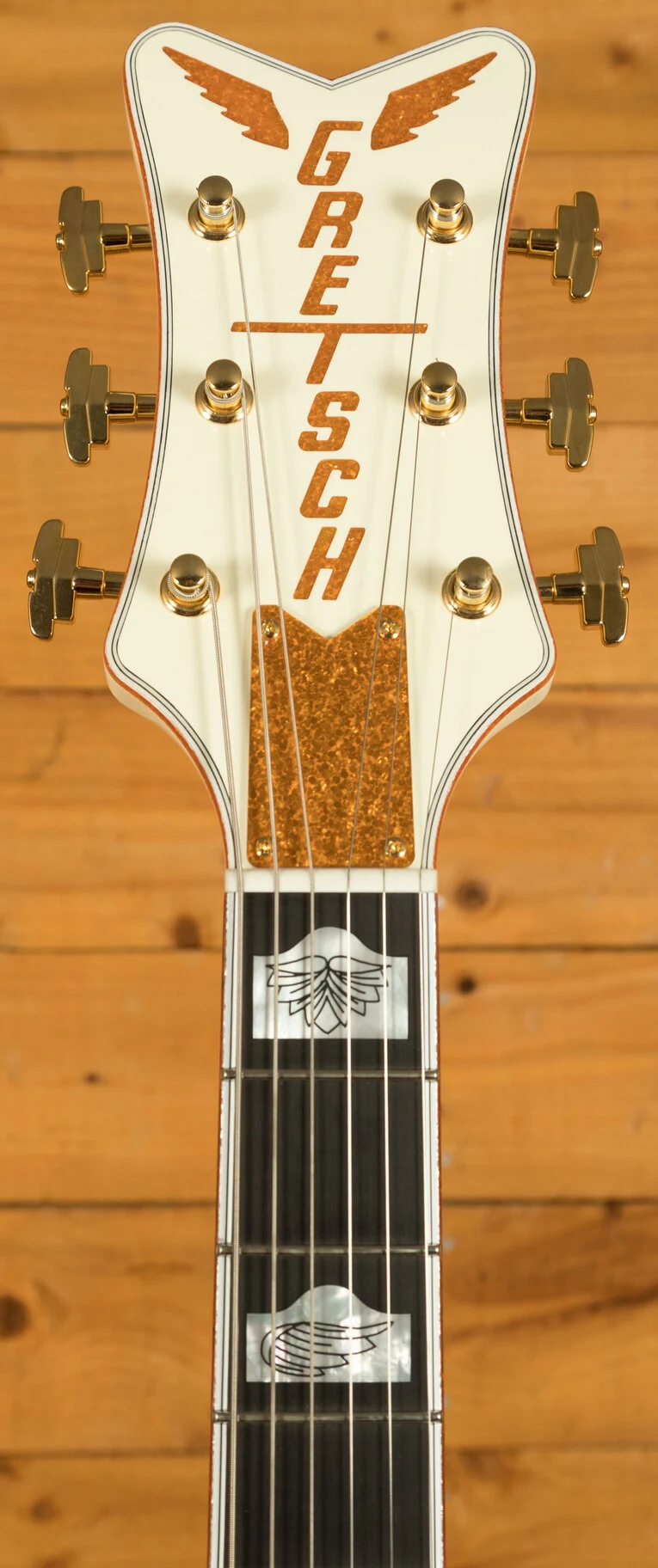 Equipped with the powerful TV Jones T-Armond single-coil pickups and the innovative Gretsch "Squeezebox" capacitors, the '55 Falcon Hollow Body delivers crystal-clear, transparent tones that allow the soul of the guitar's hollowbody resonance to shine through. The Synchro-Sonic bridge, not only a nod to the original design, ensures impeccable intonation accuracy and can be adjusted effortlessly without any tools.