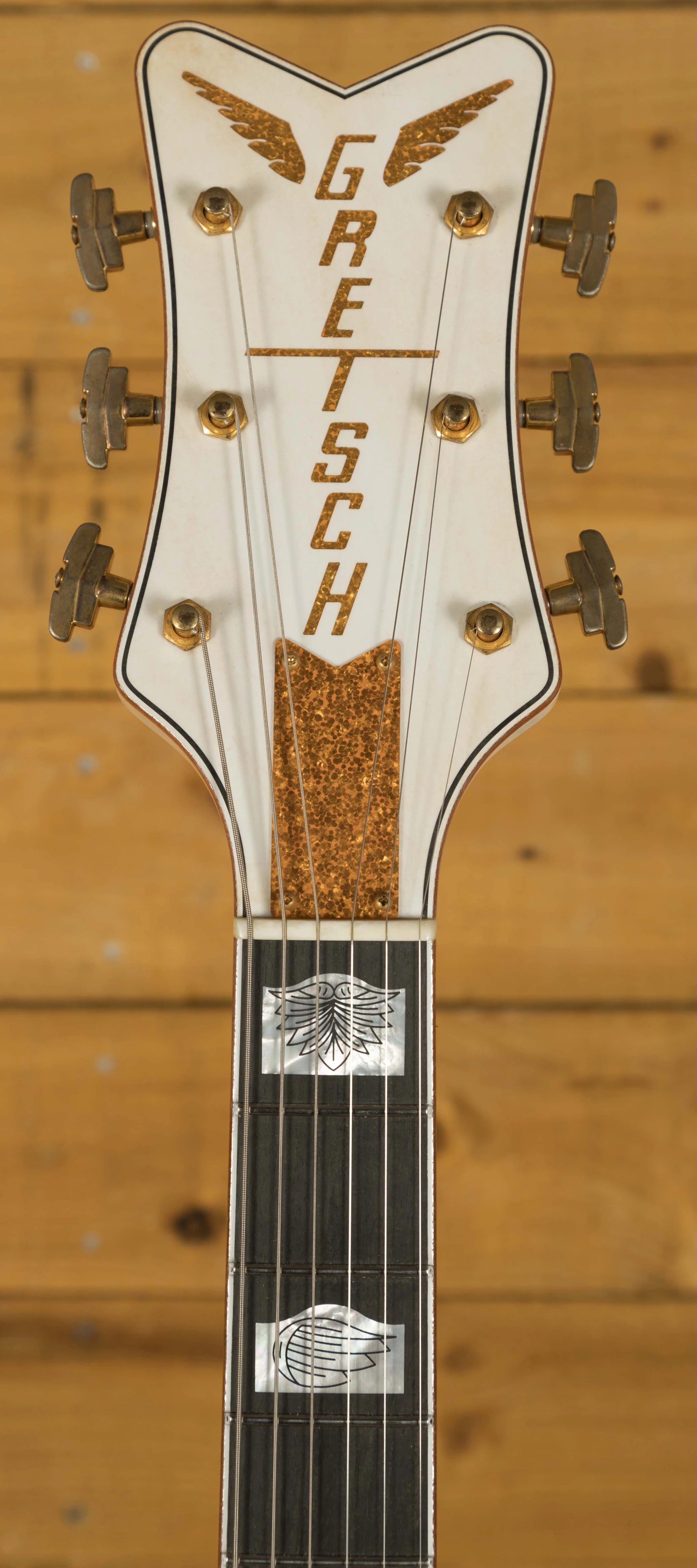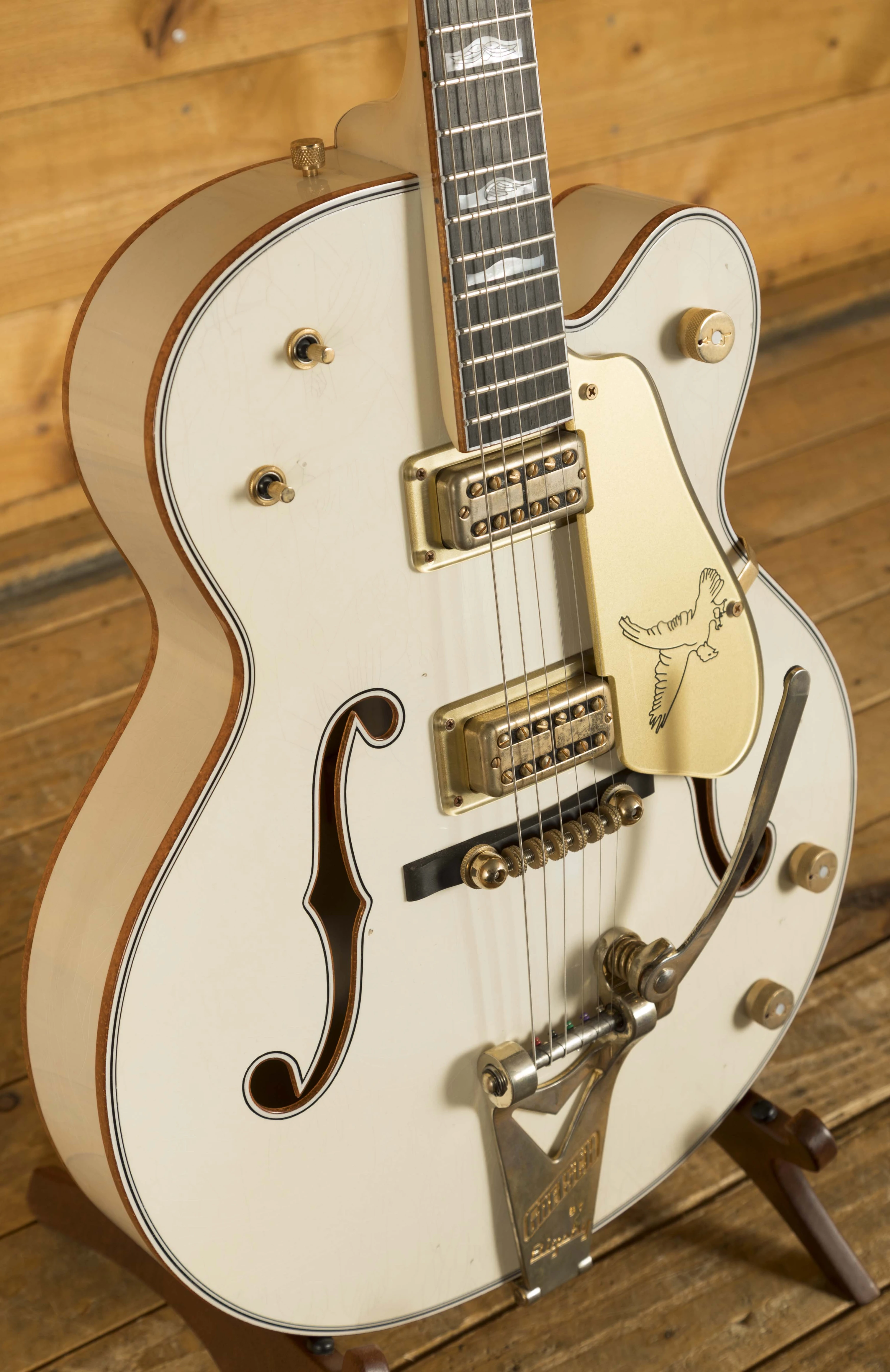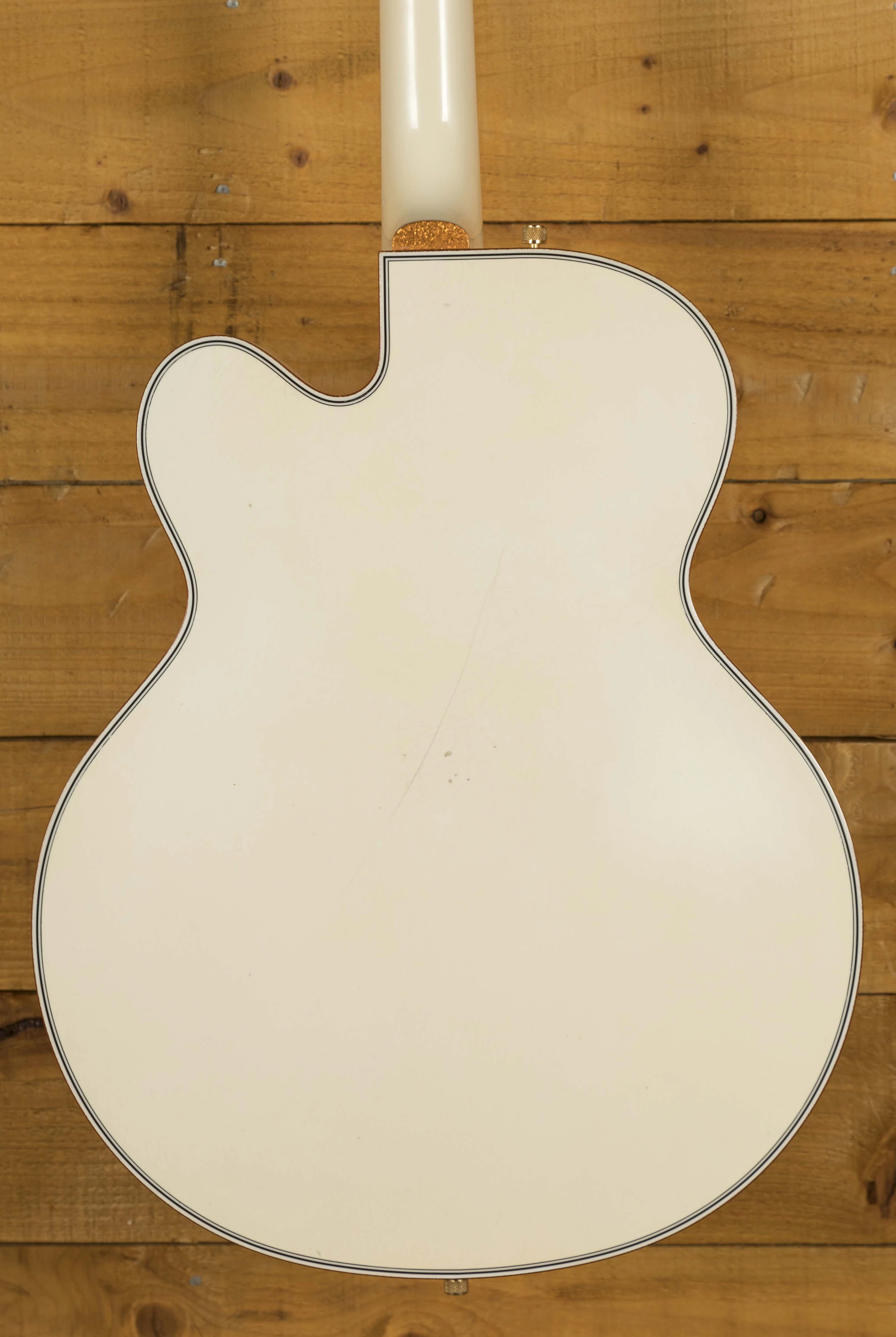 The Maple body is finished in authentic relic aged Vintage White, and with the delicious aged gold hardware, it looks every bit the classic Gretsch. The Maple neck has a rich Ebony fingerboard and sports the mother of pearl humpblock inlays, a real nice vintage touch. With the standard U shape profile and a 12" radius, it's comfortable and really well balanced.