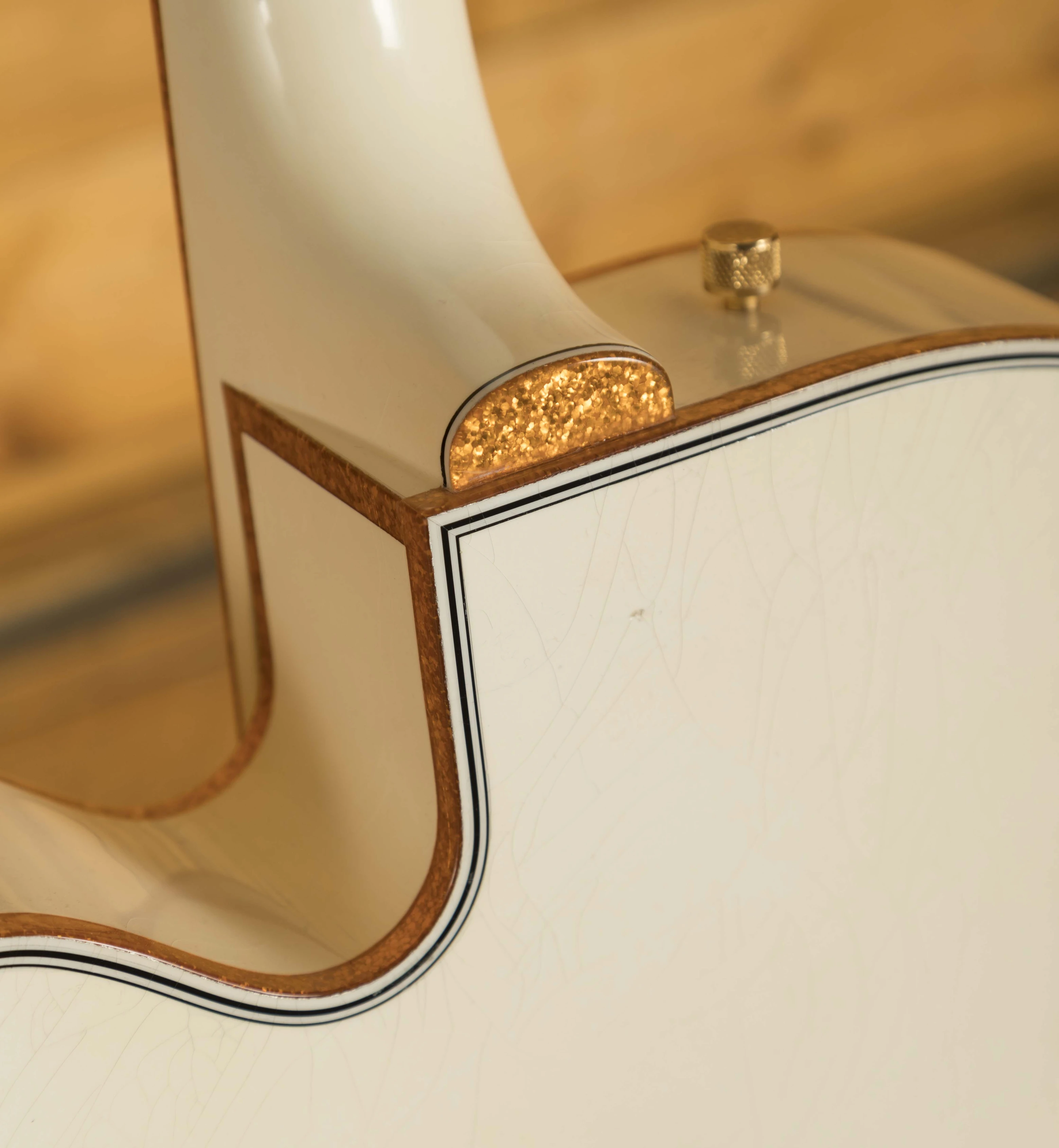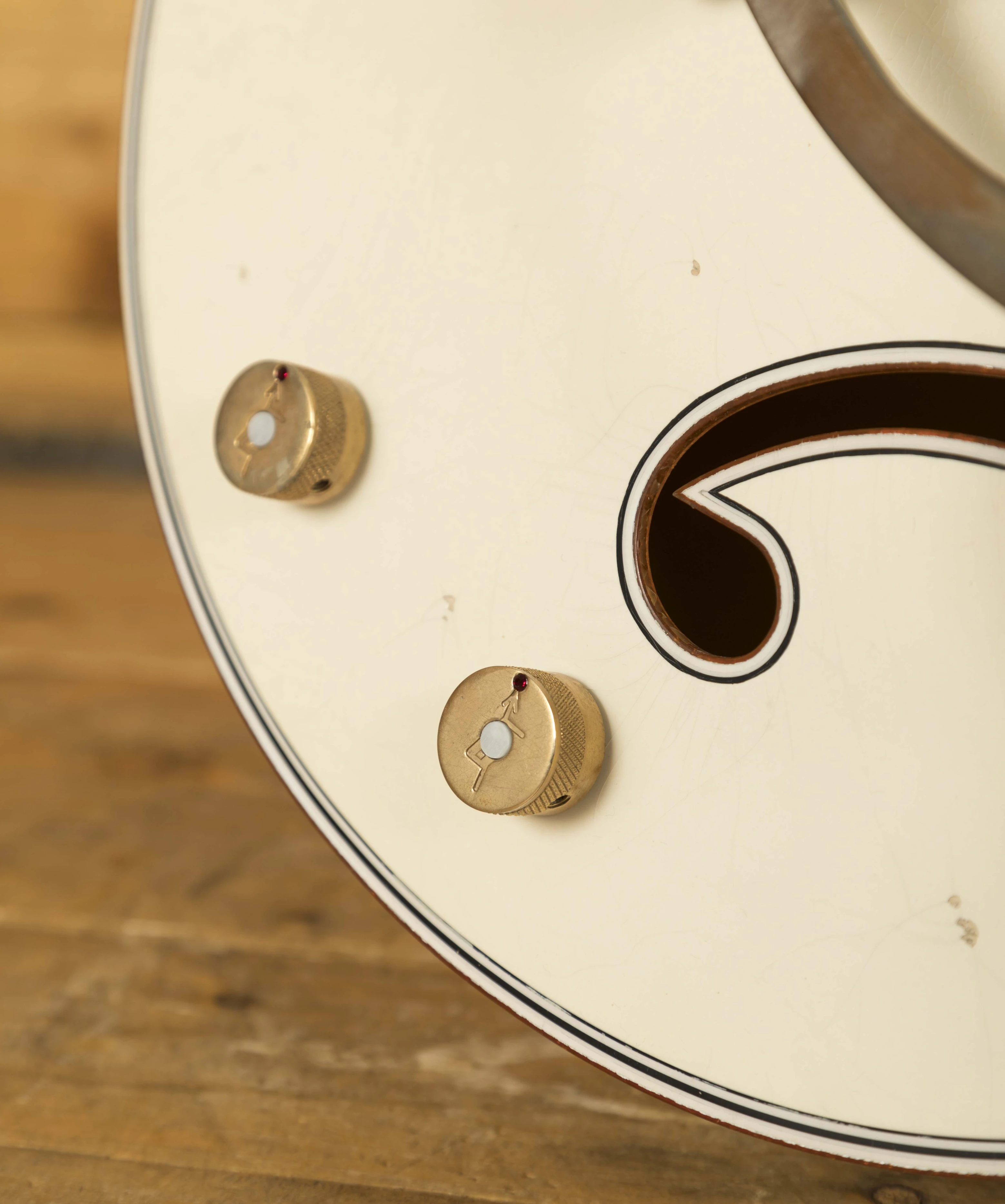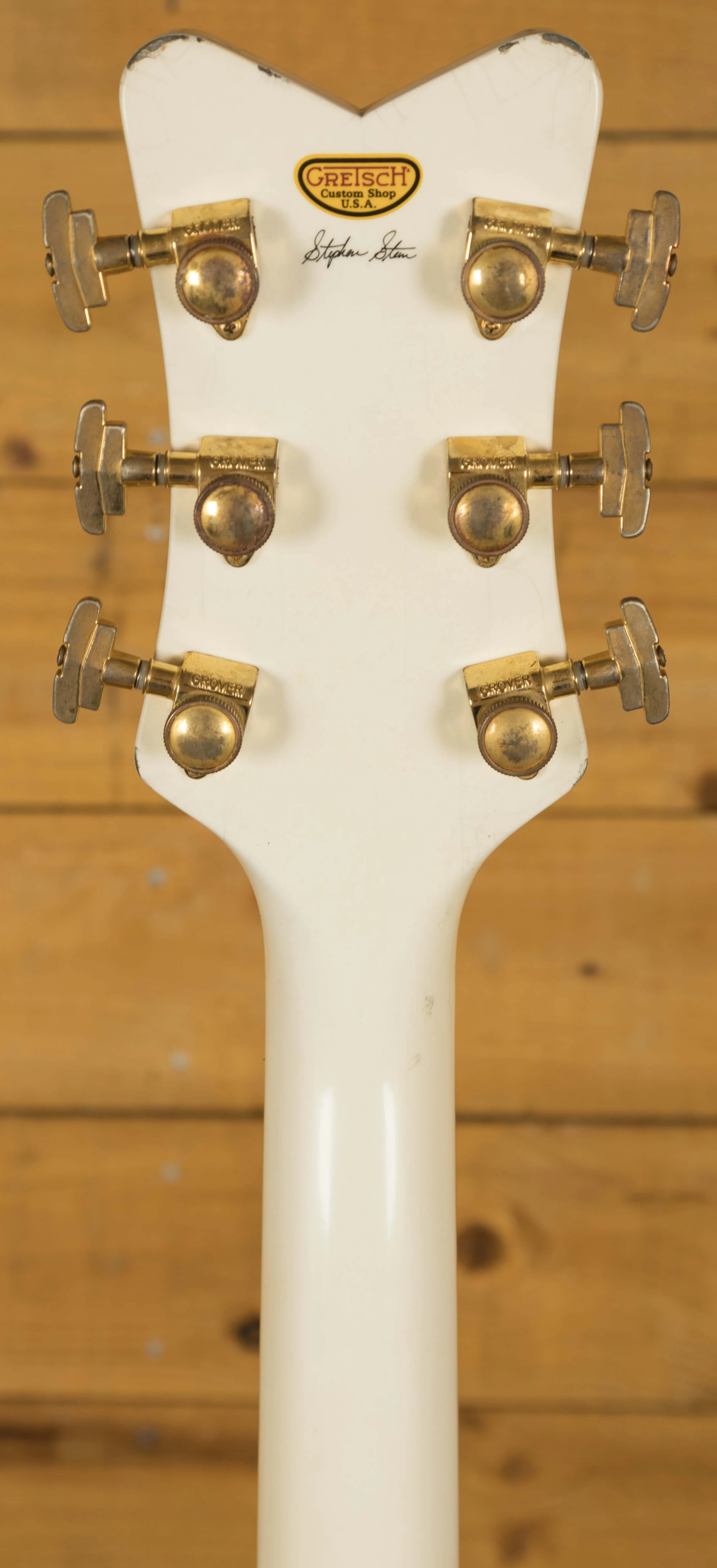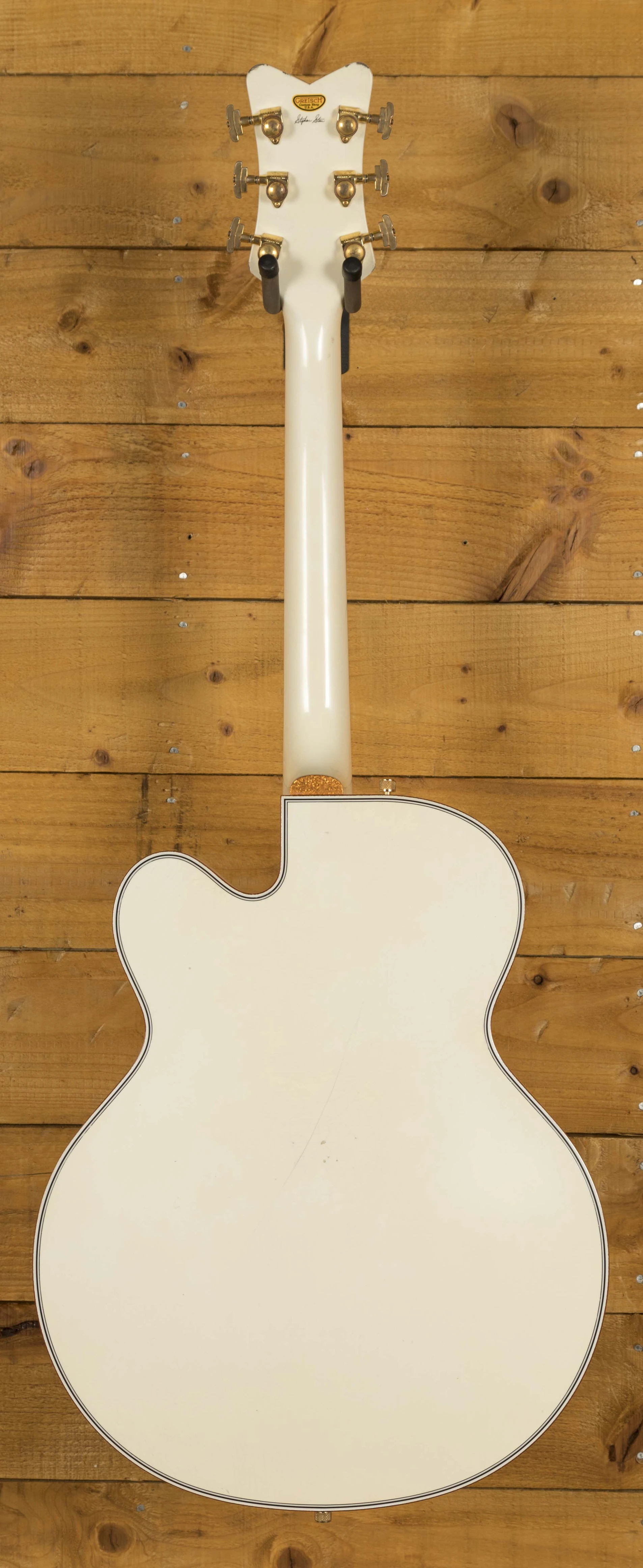 The Maple body is finished in authentic relic aged Vintage White, and with the delicious aged gold hardware, it looks every bit the classic Gretsch. The Maple neck has a rich Ebony fingerboard and sports the mother of pearl humpblock inlays, a real nice vintage touch. With the standard U shape profile and a 12" radius, it's comfortable and really well balanced.