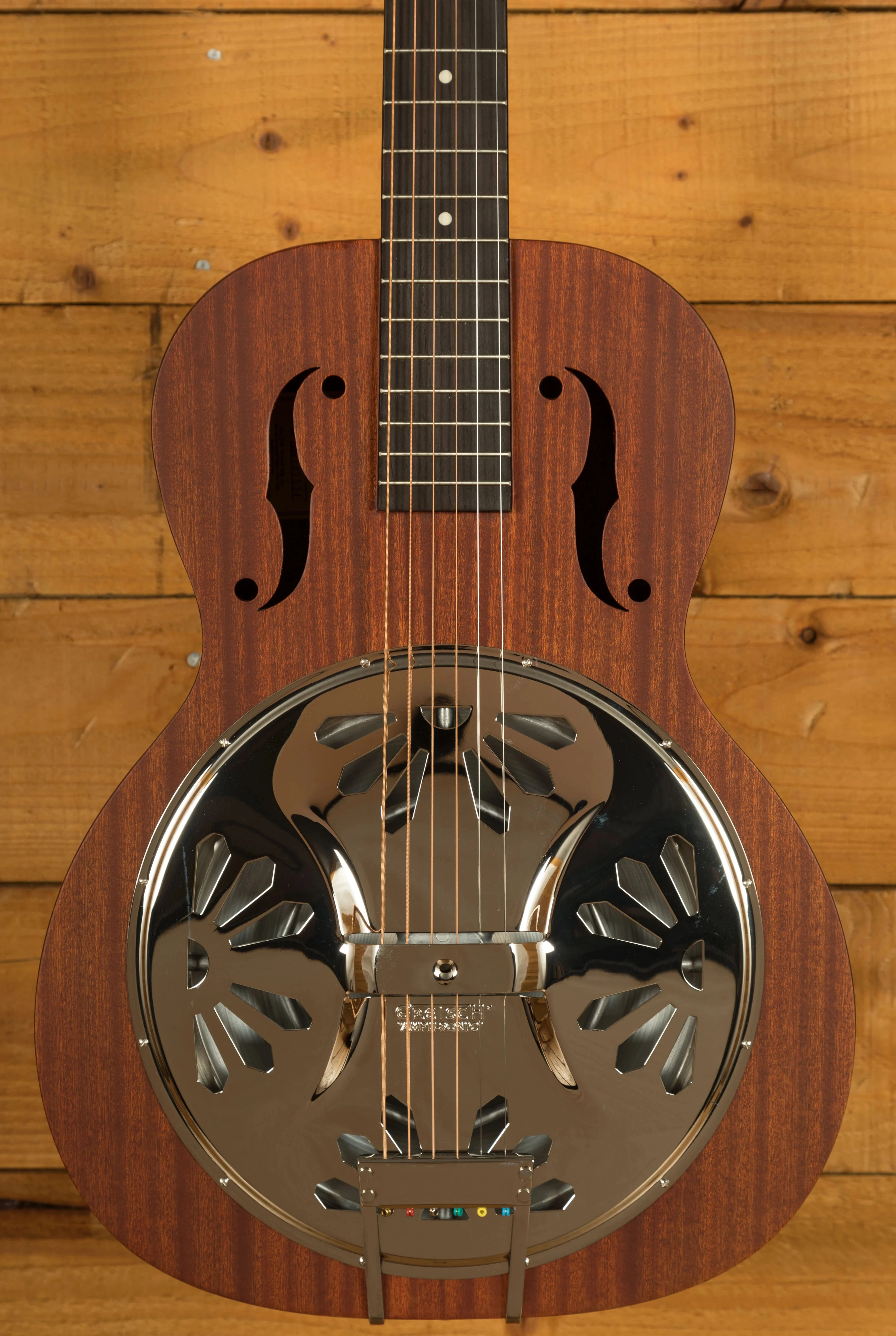 The Gretsch G9200 Boxcar Roundneck Reso is a delta blues infused resonator that takes you back to the early days of slide blues. With a Laminated Mahogany body, this resonator delivers a crisp and raspy tone, perfect for slick fingerpicking and ruthless slide work. Like all fine Gretsch resonator guitars, the vital feature of the G9200 is the Gretsch "Ampli-Sonic" resonator cone. Hand-spun in Eastern Europe from nearly 99-percent pure aluminium, the Ampli-Sonic diaphragm yields an impressive quality and volume of tone.