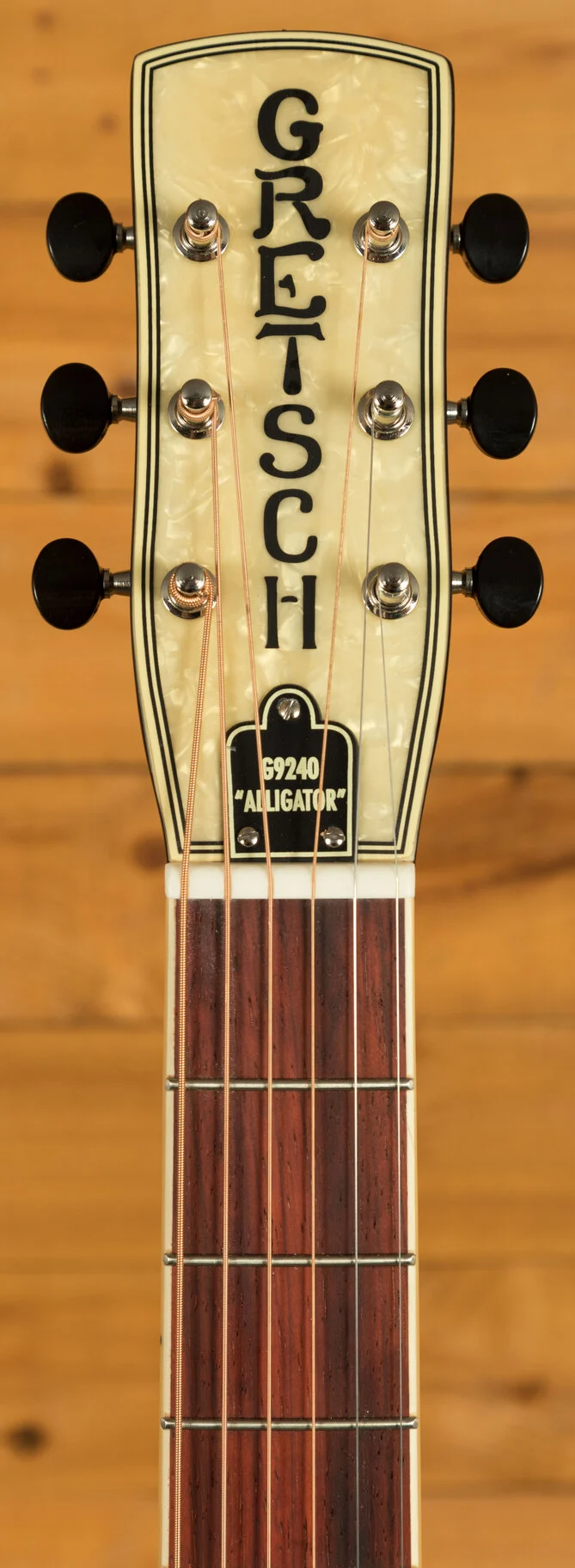The Gretsch G9240 Alligator Biscuit Roundneck Reso is a delta blues infused resonator that takes you back to the early days of slide blues. With a Laminated Mahogany body, this resonator delivers a crisp and raspy tone, perfect for slick fingerpicking and ruthless slide work. Like all fine Gretsch resonator guitars, the vital feature of the G9240 is the all-new Gretsch "Ampli-Sonic" resonator cone. Hand-spun in Eastern Europe from nearly 99-percent pure aluminium, the Ampli-Sonic diaphragm yields an impressive quality and volume of tone.