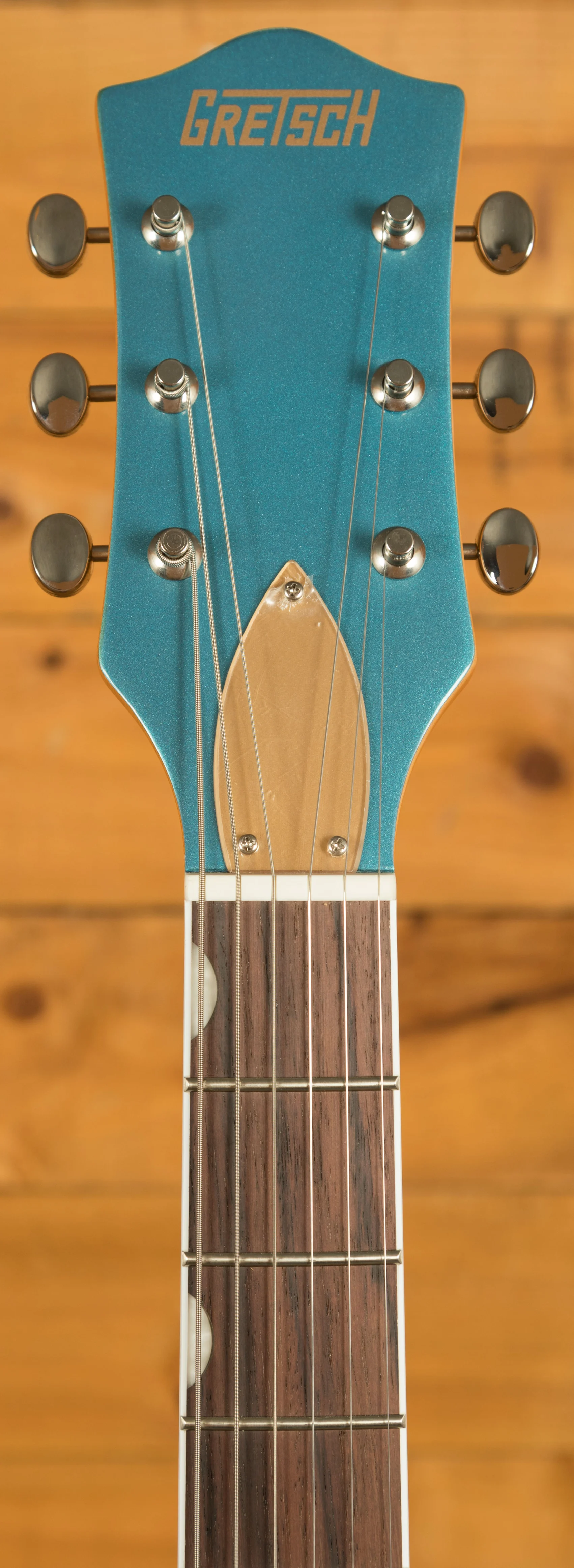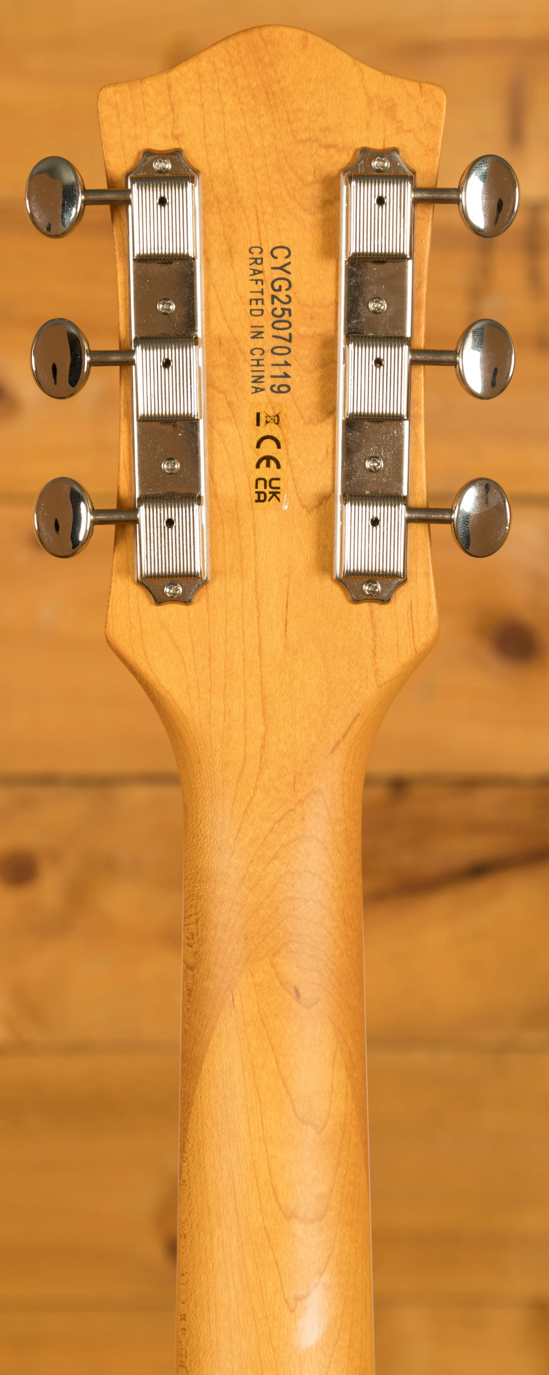 Thanks to the bolt-on Maple neck, this Gretsch has a bright, snappy tone. You're sure to cut through any mix, both live, or in the studio. The C shaped neck profile is extremely comfortable and feels great underhand, allowing you to quickly navigate every inch of the guitar. The bound rosewood fingerboard features 22 medium jumbo frets, 41.4mm nut width, 7.25" radius, and pearloid Neo-Classical Thumbnail inlays.