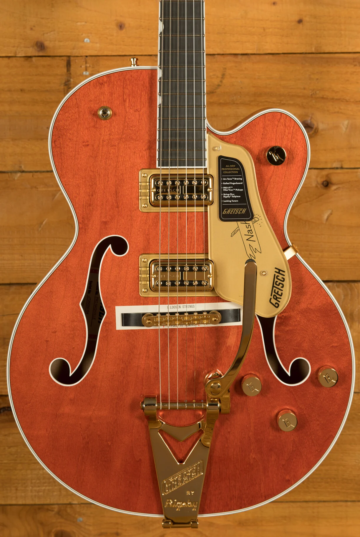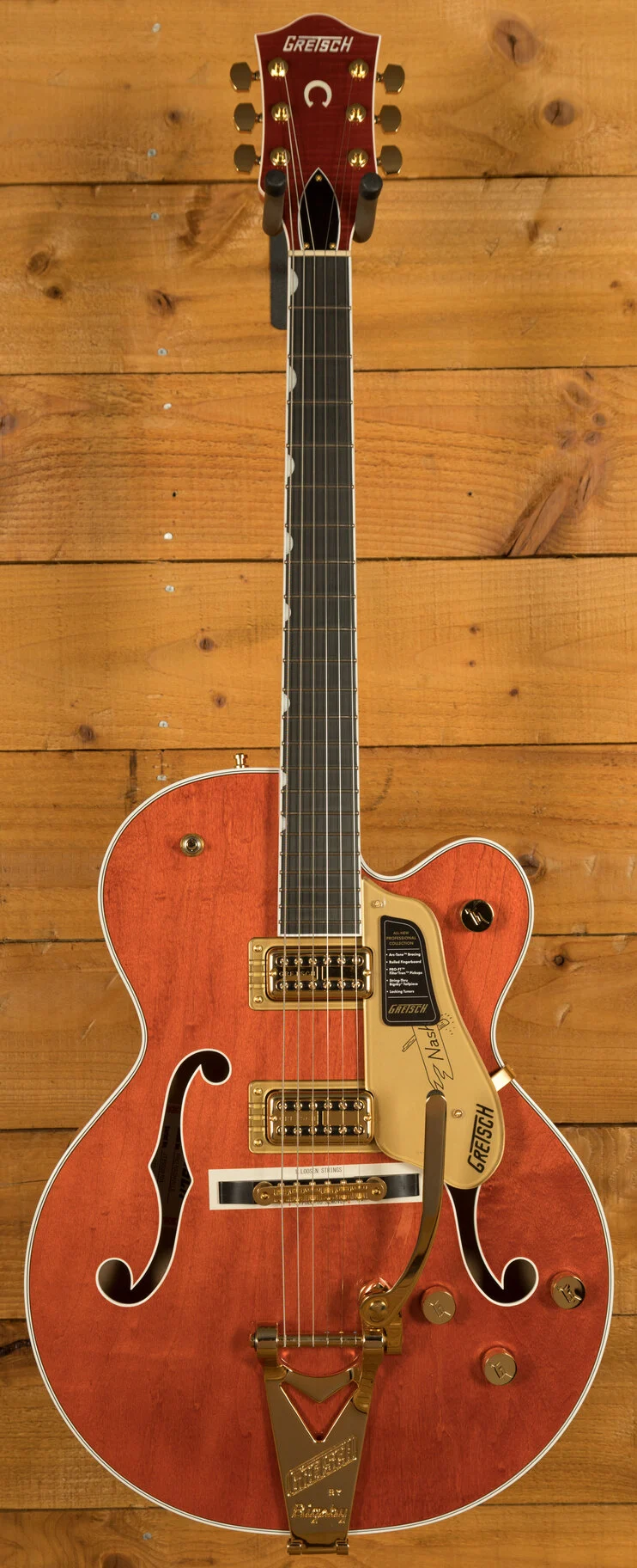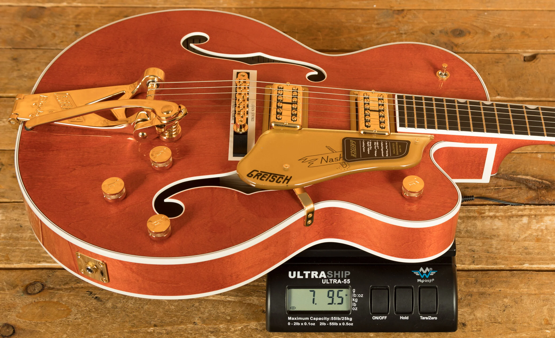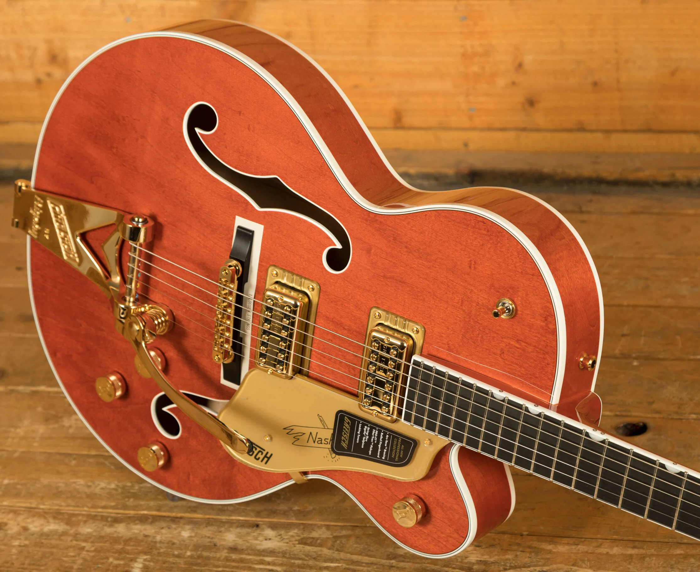 The Gretsch Nashville Hollow Body with String-Thru Bigsby is part of the Professional Collection, combining iconic Gretsch tone with modern features designed to improve playability, sound, and reliability. Its 16"-wide, 2.5"-deep maple body with Arc-Tone bracing delivers a resonant and open hollow-body voice while ensuring excellent sustain and feedback control. The guitar includes a deluxe G6241 hardshell case for protection, and is available in Orange Stain, Cadillac Green, and Midnight Sapphire finishes, each paired with gold hardware and a gold plexi pickguard for a premium look.