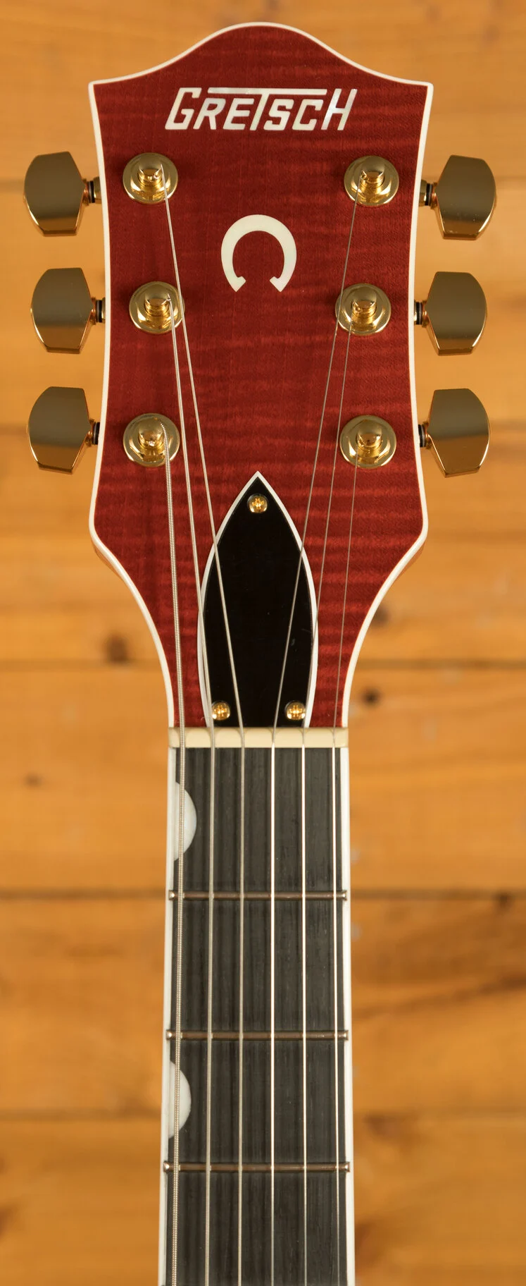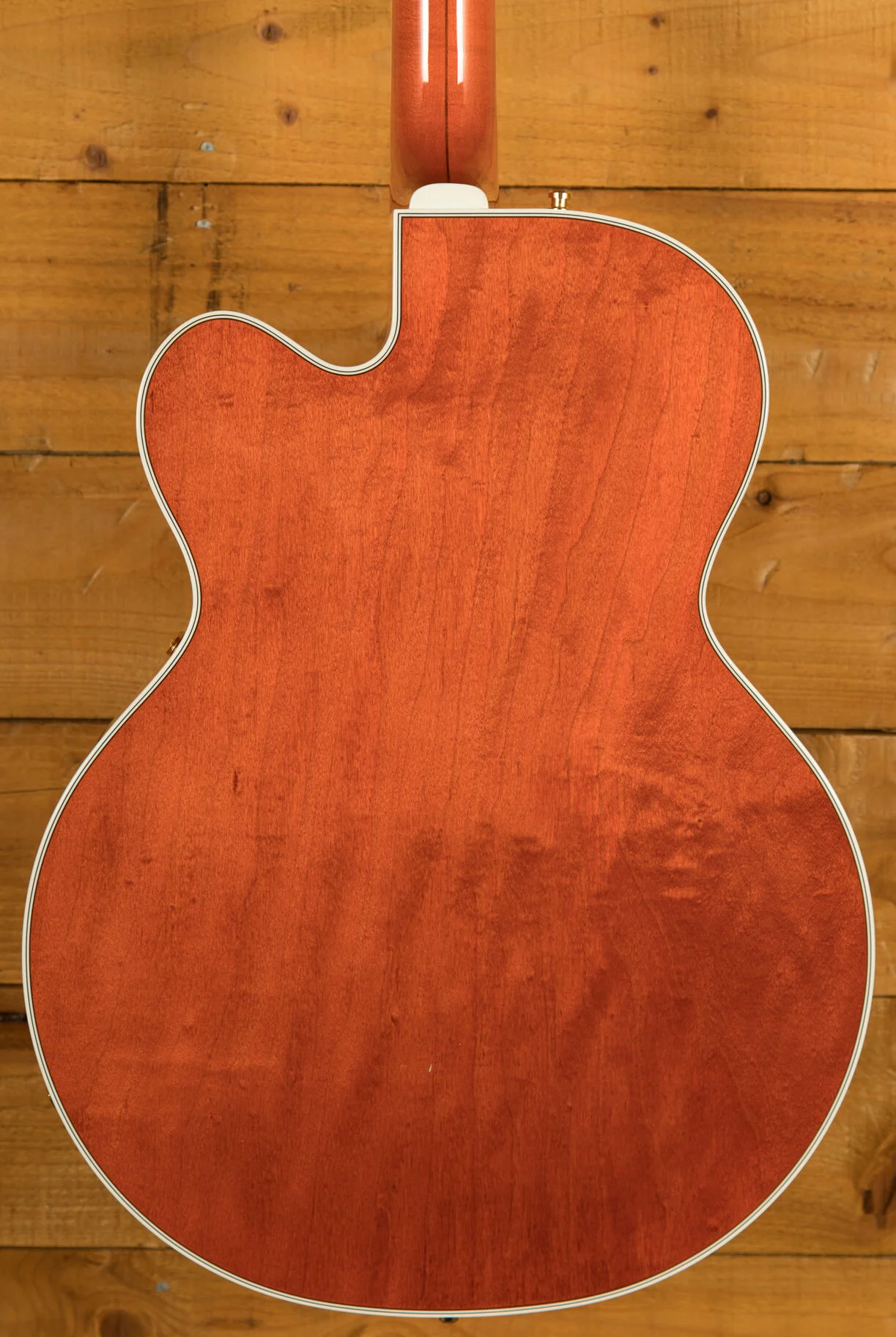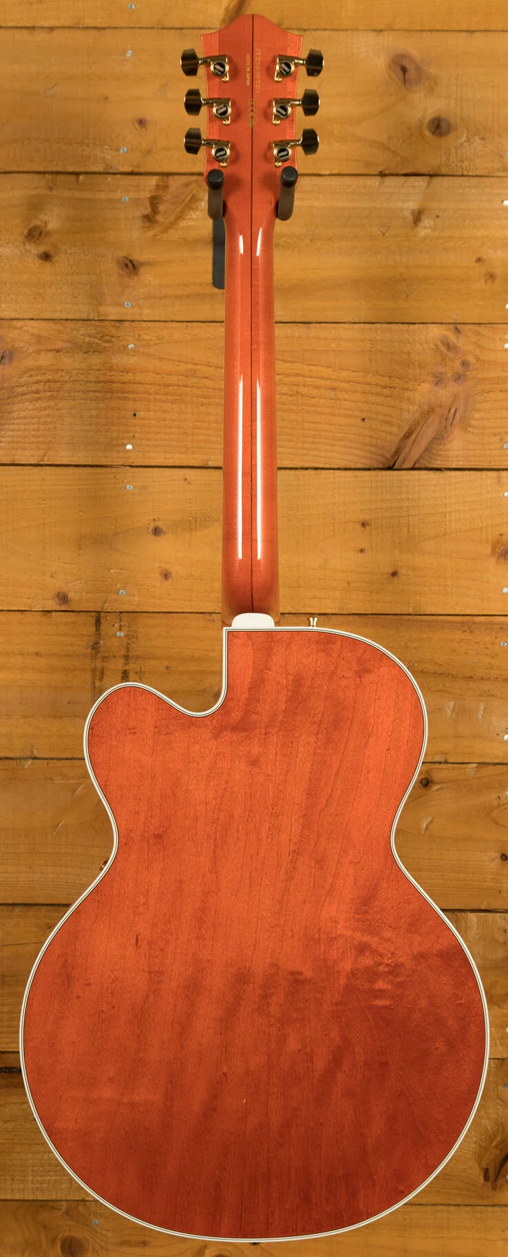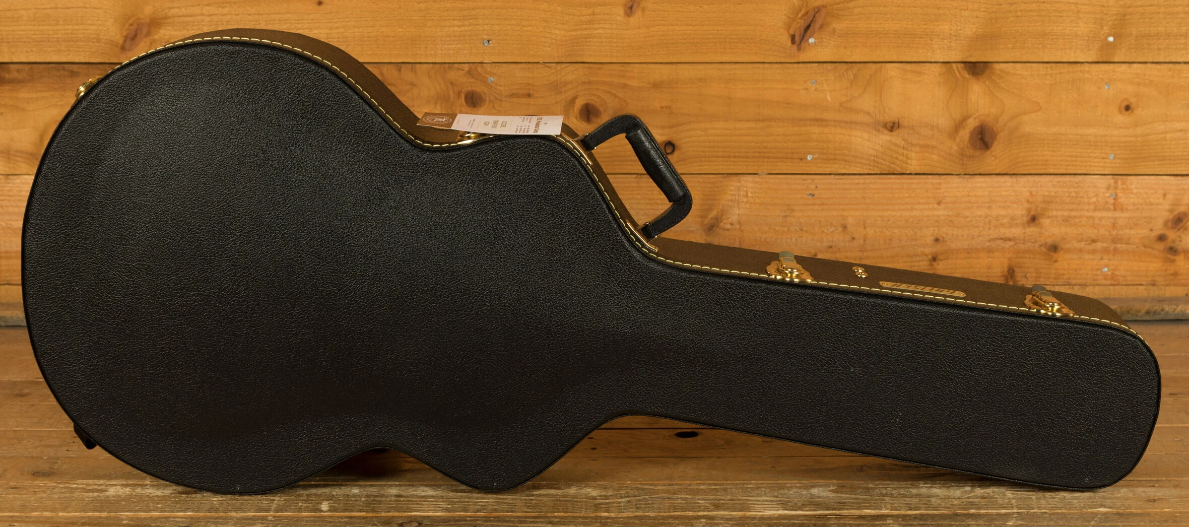 The Gretsch Nashville Hollow Body with String-Thru Bigsby is part of the Professional Collection, combining iconic Gretsch tone with modern features designed to improve playability, sound, and reliability. Its 16"-wide, 2.5"-deep maple body with Arc-Tone bracing delivers a resonant and open hollow-body voice while ensuring excellent sustain and feedback control. The guitar includes a deluxe G6241 hardshell case for protection, and is available in Orange Stain, Cadillac Green, and Midnight Sapphire finishes, each paired with gold hardware and a gold plexi pickguard for a premium look.