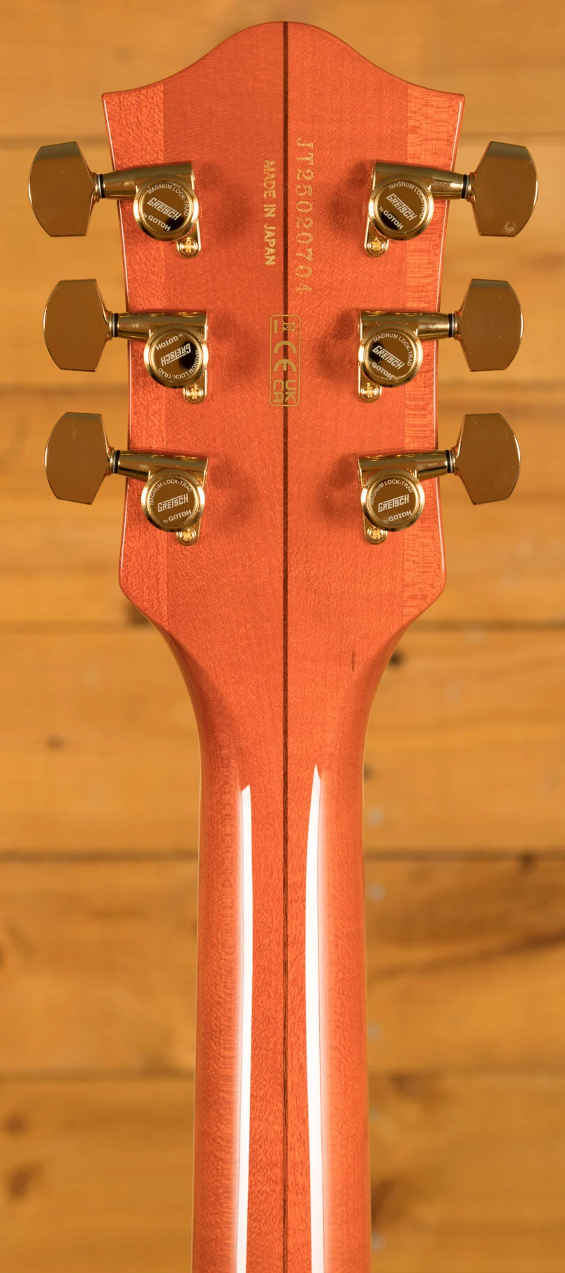 Built for comfort and performance, the Nashville features a maple neck with a 24.6" scale length and a standard "U"-shaped profile for a familiar, balanced feel. The 12"-radius ebony fingerboard with rolled edges and 22 medium jumbo frets provides smooth playability, while pearloid Neo-Classic thumbnail inlays add a signature Gretsch touch. Luminlay side dots enhance visibility on stage, especially in low-light settings. Gotoh locking tuners and a Graph Tech TUSQ XL nut ensure tuning stability, while Grover strap locks provide security for live performance.
